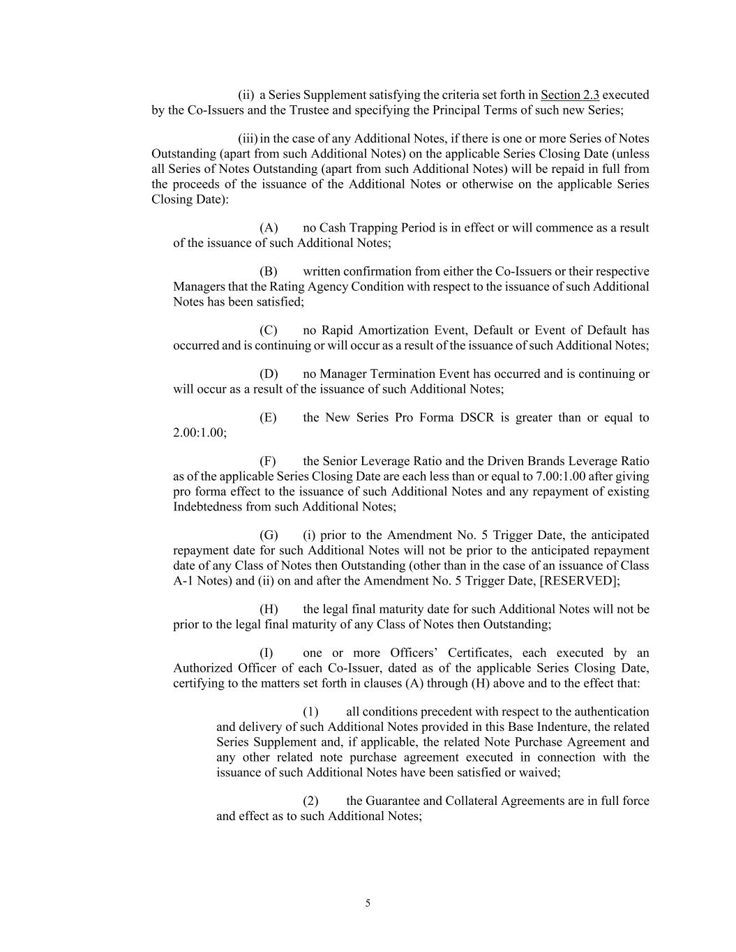 5 (ii) a Series Supplement satisfying the criteria set forth in Section 2.3 executed by the Co-Issuers and the Trustee and specifying the Principal Terms of such new Series; (iii) in the case of any Additional Notes, if there is one or more Series of Notes Outstanding (apart from such Additional Notes) on the applicable Series Closing Date (unless all Series of Notes Outstanding (apart from such Additional Notes) will be repaid in full from the proceeds of the issuance of the Additional Notes or otherwise on the applicable Series Closing Date): (A) no Cash Trapping Period is in effect or will commence as a result of the issuance of such Additional Notes; (B) written confirmation from either the Co-Issuers or their respective Managers that the Rating Agency Condition with respect to the issuance of such Additional Notes has been satisfied; (C) no Rapid Amortization Event, Default or Event of Default has occurred and is continuing or will occur as a result of the issuance of such Additional Notes; (D) no Manager Termination Event has occurred and is continuing or will occur as a result of the issuance of such Additional Notes; (E) the New Series Pro Forma DSCR is greater than or equal to 2.00:1.00; (F) the Senior Leverage Ratio and the Driven Brands Leverage Ratio as of the applicable Series Closing Date are each less than or equal to 7.00:1.00 after giving pro forma effect to the issuance of such Additional Notes and any repayment of existing Indebtedness from such Additional Notes; (G) (i) prior to the Amendment No. 5 Trigger Date, the anticipated repayment date for such Additional Notes will not be prior to the anticipated repayment date of any Class of Notes then Outstanding (other than in the case of an issuance of Class A-1 Notes) and (ii) on and after the Amendment No. 5 Trigger Date, [RESERVED]; (H) the legal final maturity date for such Additional Notes will not be prior to the legal final maturity of any Class of Notes then Outstanding; (I) one or more Officers’ Certificates, each executed by an Authorized Officer of each Co-Issuer, dated as of the applicable Series Closing Date, certifying to the matters set forth in clauses (A) through (H) above and to the effect that: (1) all conditions precedent with respect to the authentication and delivery of such Additional Notes provided in this Base Indenture, the related Series Supplement and, if applicable, the related Note Purchase Agreement and any other related note purchase agreement executed in connection with the issuance of such Additional Notes have been satisfied or waived; (2) the Guarantee and Collateral Agreements are in full force and effect as to such Additional Notes;