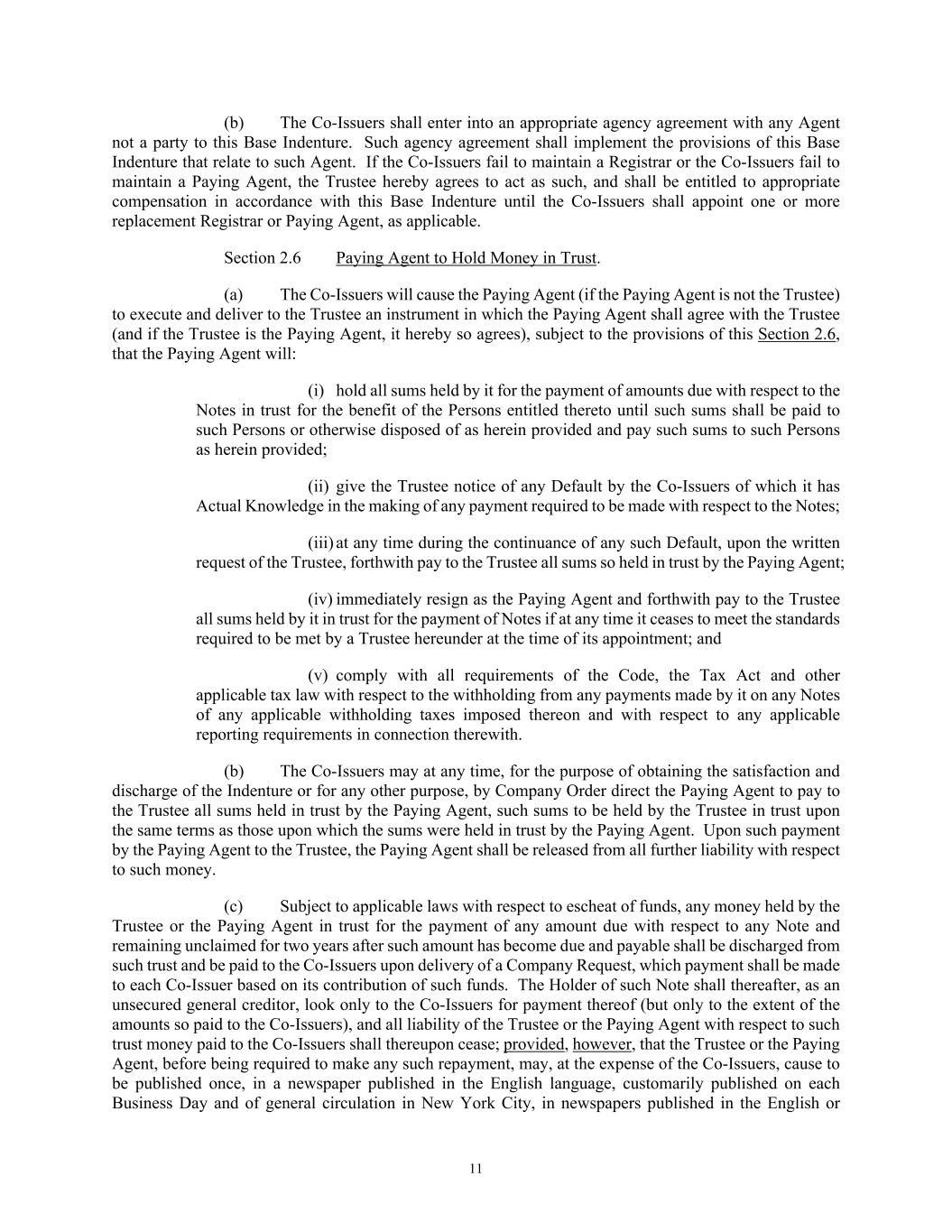 11 (b) The Co-Issuers shall enter into an appropriate agency agreement with any Agent not a party to this Base Indenture. Such agency agreement shall implement the provisions of this Base Indenture that relate to such Agent. If the Co-Issuers fail to maintain a Registrar or the Co-Issuers fail to maintain a Paying Agent, the Trustee hereby agrees to act as such, and shall be entitled to appropriate compensation in accordance with this Base Indenture until the Co-Issuers shall appoint one or more replacement Registrar or Paying Agent, as applicable. Section 2.6 Paying Agent to Hold Money in Trust. (a) The Co-Issuers will cause the Paying Agent (if the Paying Agent is not the Trustee) to execute and deliver to the Trustee an instrument in which the Paying Agent shall agree with the Trustee (and if the Trustee is the Paying Agent, it hereby so agrees), subject to the provisions of this Section 2.6, that the Paying Agent will: (i) hold all sums held by it for the payment of amounts due with respect to the Notes in trust for the benefit of the Persons entitled thereto until such sums shall be paid to such Persons or otherwise disposed of as herein provided and pay such sums to such Persons as herein provided; (ii) give the Trustee notice of any Default by the Co-Issuers of which it has Actual Knowledge in the making of any payment required to be made with respect to the Notes; (iii) at any time during the continuance of any such Default, upon the written request of the Trustee, forthwith pay to the Trustee all sums so held in trust by the Paying Agent; (iv) immediately resign as the Paying Agent and forthwith pay to the Trustee all sums held by it in trust for the payment of Notes if at any time it ceases to meet the standards required to be met by a Trustee hereunder at the time of its appointment; and (v) comply with all requirements of the Code, the Tax Act and other applicable tax law with respect to the withholding from any payments made by it on any Notes of any applicable withholding taxes imposed thereon and with respect to any applicable reporting requirements in connection therewith. (b) The Co-Issuers may at any time, for the purpose of obtaining the satisfaction and discharge of the Indenture or for any other purpose, by Company Order direct the Paying Agent to pay to the Trustee all sums held in trust by the Paying Agent, such sums to be held by the Trustee in trust upon the same terms as those upon which the sums were held in trust by the Paying Agent. Upon such payment by the Paying Agent to the Trustee, the Paying Agent shall be released from all further liability with respect to such money. (c) Subject to applicable laws with respect to escheat of funds, any money held by the Trustee or the Paying Agent in trust for the payment of any amount due with respect to any Note and remaining unclaimed for two years after such amount has become due and payable shall be discharged from such trust and be paid to the Co-Issuers upon delivery of a Company Request, which payment shall be made to each Co-Issuer based on its contribution of such funds. The Holder of such Note shall thereafter, as an unsecured general creditor, look only to the Co-Issuers for payment thereof (but only to the extent of the amounts so paid to the Co-Issuers), and all liability of the Trustee or the Paying Agent with respect to such trust money paid to the Co-Issuers shall thereupon cease; provided, however, that the Trustee or the Paying Agent, before being required to make any such repayment, may, at the expense of the Co-Issuers, cause to be published once, in a newspaper published in the English language, customarily published on each Business Day and of general circulation in New York City, in newspapers published in the English or