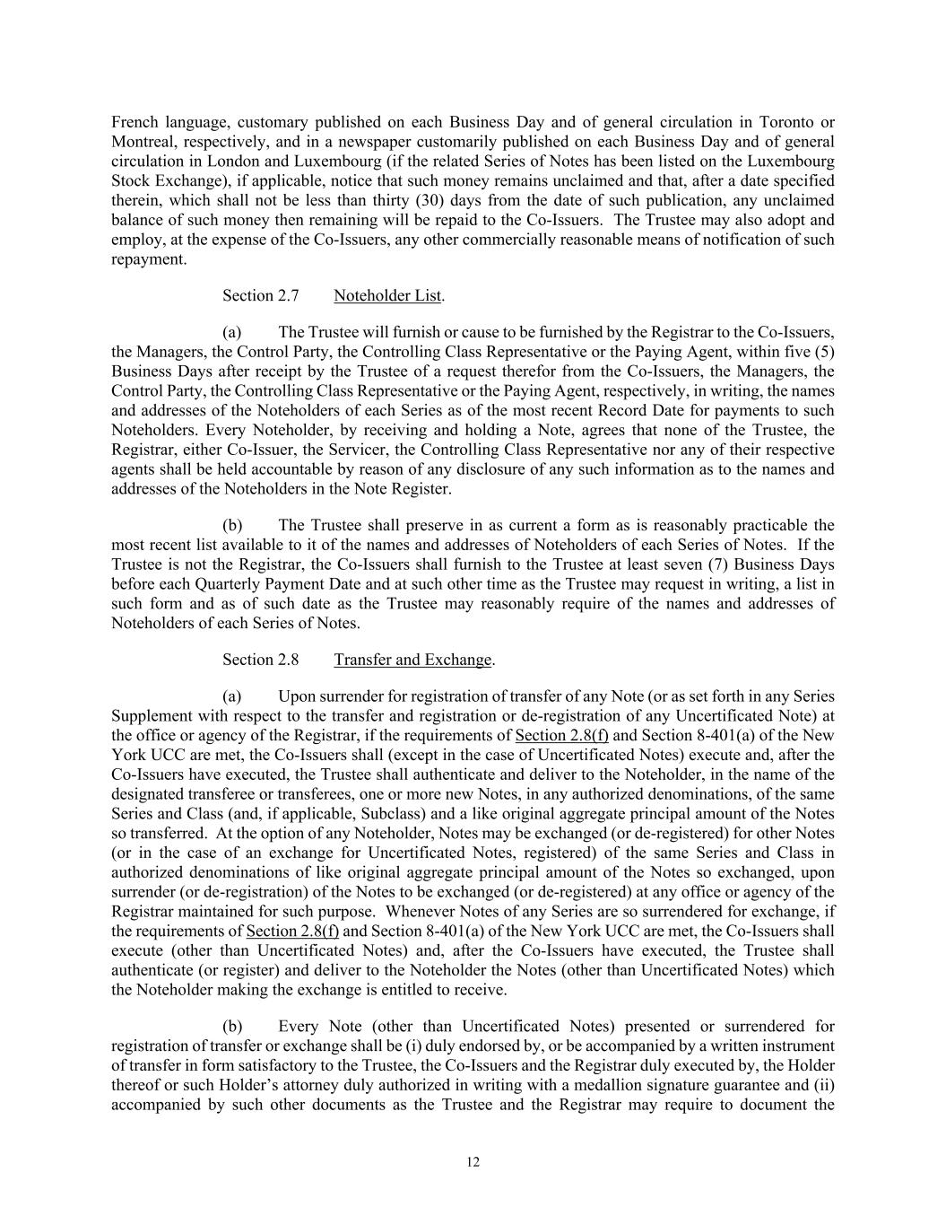 12 French language, customary published on each Business Day and of general circulation in Toronto or Montreal, respectively, and in a newspaper customarily published on each Business Day and of general circulation in London and Luxembourg (if the related Series of Notes has been listed on the Luxembourg Stock Exchange), if applicable, notice that such money remains unclaimed and that, after a date specified therein, which shall not be less than thirty (30) days from the date of such publication, any unclaimed balance of such money then remaining will be repaid to the Co-Issuers. The Trustee may also adopt and employ, at the expense of the Co-Issuers, any other commercially reasonable means of notification of such repayment. Section 2.7 Noteholder List. (a) The Trustee will furnish or cause to be furnished by the Registrar to the Co-Issuers, the Managers, the Control Party, the Controlling Class Representative or the Paying Agent, within five (5) Business Days after receipt by the Trustee of a request therefor from the Co-Issuers, the Managers, the Control Party, the Controlling Class Representative or the Paying Agent, respectively, in writing, the names and addresses of the Noteholders of each Series as of the most recent Record Date for payments to such Noteholders. Every Noteholder, by receiving and holding a Note, agrees that none of the Trustee, the Registrar, either Co-Issuer, the Servicer, the Controlling Class Representative nor any of their respective agents shall be held accountable by reason of any disclosure of any such information as to the names and addresses of the Noteholders in the Note Register. (b) The Trustee shall preserve in as current a form as is reasonably practicable the most recent list available to it of the names and addresses of Noteholders of each Series of Notes. If the Trustee is not the Registrar, the Co-Issuers shall furnish to the Trustee at least seven (7) Business Days before each Quarterly Payment Date and at such other time as the Trustee may request in writing, a list in such form and as of such date as the Trustee may reasonably require of the names and addresses of Noteholders of each Series of Notes. Section 2.8 Transfer and Exchange. (a) Upon surrender for registration of transfer of any Note (or as set forth in any Series Supplement with respect to the transfer and registration or de-registration of any Uncertificated Note) at the office or agency of the Registrar, if the requirements of Section 2.8(f) and Section 8-401(a) of the New York UCC are met, the Co-Issuers shall (except in the case of Uncertificated Notes) execute and, after the Co-Issuers have executed, the Trustee shall authenticate and deliver to the Noteholder, in the name of the designated transferee or transferees, one or more new Notes, in any authorized denominations, of the same Series and Class (and, if applicable, Subclass) and a like original aggregate principal amount of the Notes so transferred. At the option of any Noteholder, Notes may be exchanged (or de-registered) for other Notes (or in the case of an exchange for Uncertificated Notes, registered) of the same Series and Class in authorized denominations of like original aggregate principal amount of the Notes so exchanged, upon surrender (or de-registration) of the Notes to be exchanged (or de-registered) at any office or agency of the Registrar maintained for such purpose. Whenever Notes of any Series are so surrendered for exchange, if the requirements of Section 2.8(f) and Section 8-401(a) of the New York UCC are met, the Co-Issuers shall execute (other than Uncertificated Notes) and, after the Co-Issuers have executed, the Trustee shall authenticate (or register) and deliver to the Noteholder the Notes (other than Uncertificated Notes) which the Noteholder making the exchange is entitled to receive. (b) Every Note (other than Uncertificated Notes) presented or surrendered for registration of transfer or exchange shall be (i) duly endorsed by, or be accompanied by a written instrument of transfer in form satisfactory to the Trustee, the Co-Issuers and the Registrar duly executed by, the Holder thereof or such Holder’s attorney duly authorized in writing with a medallion signature guarantee and (ii) accompanied by such other documents as the Trustee and the Registrar may require to document the