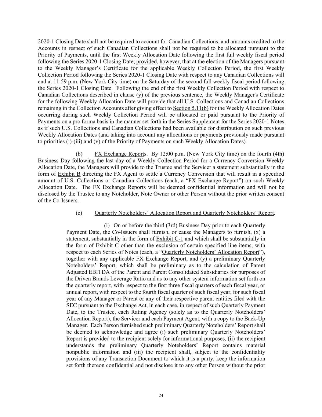 24 2020-1 Closing Date shall not be required to account for Canadian Collections, and amounts credited to the Accounts in respect of such Canadian Collections shall not be required to be allocated pursuant to the Priority of Payments, until the first Weekly Allocation Date following the first full weekly fiscal period following the Series 2020-1 Closing Date; provided, however, that at the election of the Managers pursuant to the Weekly Manager’s Certificate for the applicable Weekly Collection Period, the first Weekly Collection Period following the Series 2020-1 Closing Date with respect to any Canadian Collections will end at 11:59 p.m. (New York City time) on the Saturday of the second full weekly fiscal period following the Series 2020-1 Closing Date. Following the end of the first Weekly Collection Period with respect to Canadian Collections described in clause (y) of the previous sentence, the Weekly Manager's Certificate for the following Weekly Allocation Date will provide that all U.S. Collections and Canadian Collections remaining in the Collection Accounts after giving effect to Section 5.11(b) for the Weekly Allocation Dates occurring during such Weekly Collection Period will be allocated or paid pursuant to the Priority of Payments on a pro forma basis in the manner set forth in the Series Supplement for the Series 2020-1 Notes as if such U.S. Collections and Canadian Collections had been available for distribution on such previous Weekly Allocation Dates (and taking into account any allocations or payments previously made pursuant to priorities (i)-(iii) and (v) of the Priority of Payments on such Weekly Allocation Dates). (b) FX Exchange Reports. By 12:00 p.m. (New York City time) on the fourth (4th) Business Day following the last day of a Weekly Collection Period for a Currency Conversion Weekly Allocation Date, the Managers will provide to the Trustee and the Servicer a statement substantially in the form of Exhibit B directing the FX Agent to settle a Currency Conversion that will result in a specified amount of U.S. Collections or Canadian Collections (each, a “FX Exchange Report”) on such Weekly Allocation Date. The FX Exchange Reports will be deemed confidential information and will not be disclosed by the Trustee to any Noteholder, Note Owner or other Person without the prior written consent of the Co-Issuers. (c) Quarterly Noteholders’ Allocation Report and Quarterly Noteholders’ Report. (i) On or before the third (3rd) Business Day prior to each Quarterly Payment Date, the Co-Issuers shall furnish, or cause the Managers to furnish, (x) a statement, substantially in the form of Exhibit C-1 and which shall be substantially in the form of Exhibit C other than the exclusion of certain specified line items, with respect to each Series of Notes (each, a “Quarterly Noteholders’ Allocation Report”), together with any applicable FX Exchange Report, and (y) a preliminary Quarterly Noteholders’ Report, which shall be preliminary as to the calculation of Parent Adjusted EBITDA of the Parent and Parent Consolidated Subsidiaries for purposes of the Driven Brands Leverage Ratio and as to any other system information set forth on the quarterly report, with respect to the first three fiscal quarters of each fiscal year, or annual report, with respect to the fourth fiscal quarter of such fiscal year, for such fiscal year of any Manager or Parent or any of their respective parent entities filed with the SEC pursuant to the Exchange Act, in each case, in respect of such Quarterly Payment Date, to the Trustee, each Rating Agency (solely as to the Quarterly Noteholders’ Allocation Report), the Servicer and each Payment Agent, with a copy to the Back-Up Manager. Each Person furnished such preliminary Quarterly Noteholders’ Report shall be deemed to acknowledge and agree (i) such preliminary Quarterly Noteholders’ Report is provided to the recipient solely for informational purposes, (ii) the recipient understands the preliminary Quarterly Noteholders’ Report contains material nonpublic information and (iii) the recipient shall, subject to the confidentiality provisions of any Transaction Document to which it is a party, keep the information set forth thereon confidential and not disclose it to any other Person without the prior