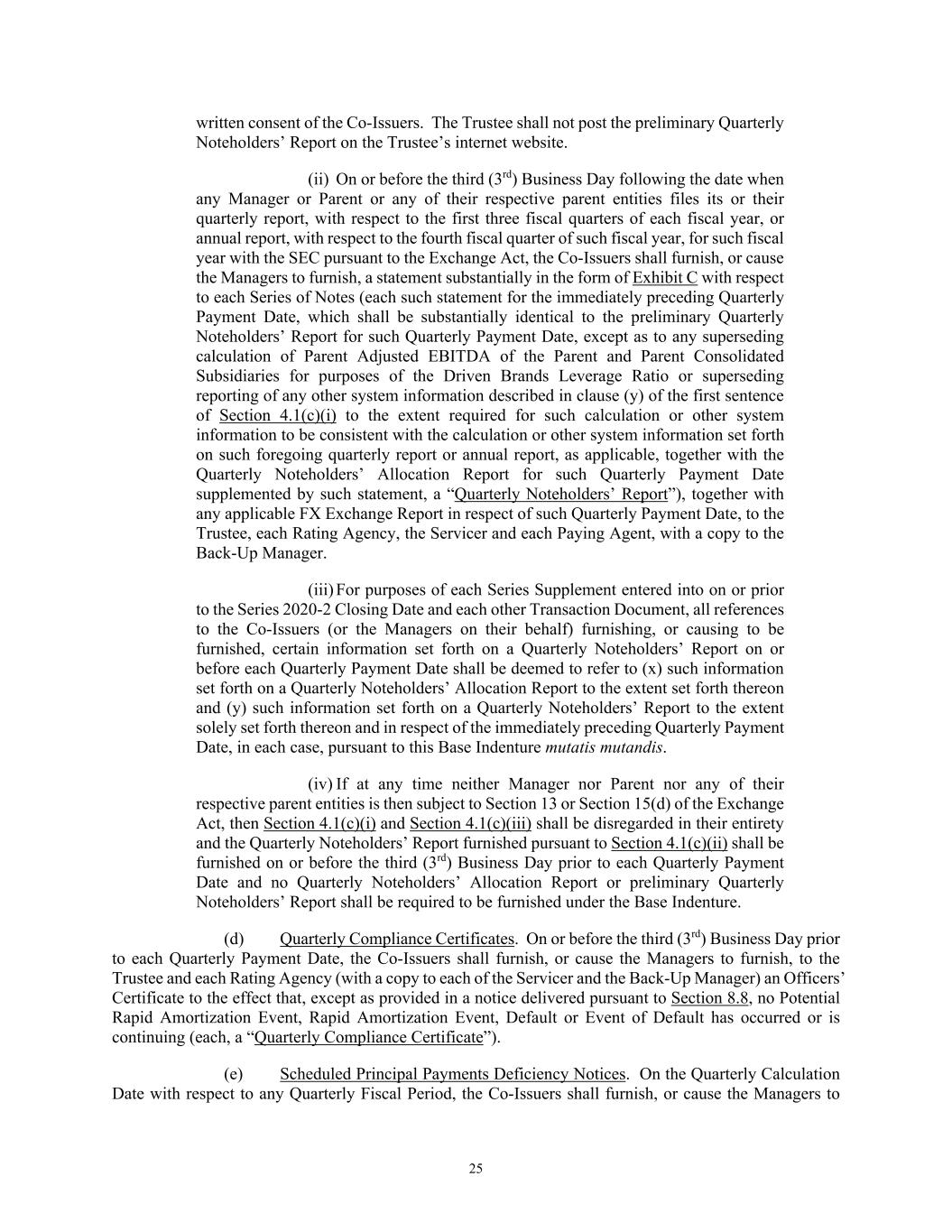 25 written consent of the Co-Issuers. The Trustee shall not post the preliminary Quarterly Noteholders’ Report on the Trustee’s internet website. (ii) On or before the third (3rd) Business Day following the date when any Manager or Parent or any of their respective parent entities files its or their quarterly report, with respect to the first three fiscal quarters of each fiscal year, or annual report, with respect to the fourth fiscal quarter of such fiscal year, for such fiscal year with the SEC pursuant to the Exchange Act, the Co-Issuers shall furnish, or cause the Managers to furnish, a statement substantially in the form of Exhibit C with respect to each Series of Notes (each such statement for the immediately preceding Quarterly Payment Date, which shall be substantially identical to the preliminary Quarterly Noteholders’ Report for such Quarterly Payment Date, except as to any superseding calculation of Parent Adjusted EBITDA of the Parent and Parent Consolidated Subsidiaries for purposes of the Driven Brands Leverage Ratio or superseding reporting of any other system information described in clause (y) of the first sentence of Section 4.1(c)(i) to the extent required for such calculation or other system information to be consistent with the calculation or other system information set forth on such foregoing quarterly report or annual report, as applicable, together with the Quarterly Noteholders’ Allocation Report for such Quarterly Payment Date supplemented by such statement, a “Quarterly Noteholders’ Report”), together with any applicable FX Exchange Report in respect of such Quarterly Payment Date, to the Trustee, each Rating Agency, the Servicer and each Paying Agent, with a copy to the Back-Up Manager. (iii) For purposes of each Series Supplement entered into on or prior to the Series 2020-2 Closing Date and each other Transaction Document, all references to the Co-Issuers (or the Managers on their behalf) furnishing, or causing to be furnished, certain information set forth on a Quarterly Noteholders’ Report on or before each Quarterly Payment Date shall be deemed to refer to (x) such information set forth on a Quarterly Noteholders’ Allocation Report to the extent set forth thereon and (y) such information set forth on a Quarterly Noteholders’ Report to the extent solely set forth thereon and in respect of the immediately preceding Quarterly Payment Date, in each case, pursuant to this Base Indenture mutatis mutandis. (iv) If at any time neither Manager nor Parent nor any of their respective parent entities is then subject to Section 13 or Section 15(d) of the Exchange Act, then Section 4.1(c)(i) and Section 4.1(c)(iii) shall be disregarded in their entirety and the Quarterly Noteholders’ Report furnished pursuant to Section 4.1(c)(ii) shall be furnished on or before the third (3rd) Business Day prior to each Quarterly Payment Date and no Quarterly Noteholders’ Allocation Report or preliminary Quarterly Noteholders’ Report shall be required to be furnished under the Base Indenture. (d) Quarterly Compliance Certificates. On or before the third (3rd) Business Day prior to each Quarterly Payment Date, the Co-Issuers shall furnish, or cause the Managers to furnish, to the Trustee and each Rating Agency (with a copy to each of the Servicer and the Back-Up Manager) an Officers’ Certificate to the effect that, except as provided in a notice delivered pursuant to Section 8.8, no Potential Rapid Amortization Event, Rapid Amortization Event, Default or Event of Default has occurred or is continuing (each, a “Quarterly Compliance Certificate”). (e) Scheduled Principal Payments Deficiency Notices. On the Quarterly Calculation Date with respect to any Quarterly Fiscal Period, the Co-Issuers shall furnish, or cause the Managers to