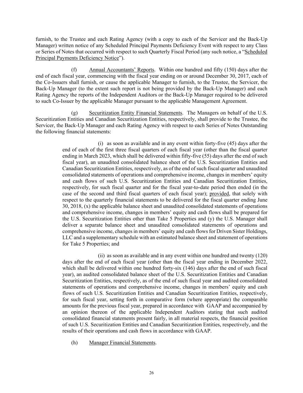 26 furnish, to the Trustee and each Rating Agency (with a copy to each of the Servicer and the Back-Up Manager) written notice of any Scheduled Principal Payments Deficiency Event with respect to any Class or Series of Notes that occurred with respect to such Quarterly Fiscal Period (any such notice, a “Scheduled Principal Payments Deficiency Notice”). (f) Annual Accountants’ Reports. Within one hundred and fifty (150) days after the end of each fiscal year, commencing with the fiscal year ending on or around December 30, 2017, each of the Co-Issuers shall furnish, or cause the applicable Manager to furnish, to the Trustee, the Servicer, the Back-Up Manager (to the extent such report is not being provided by the Back-Up Manager) and each Rating Agency the reports of the Independent Auditors or the Back-Up Manager required to be delivered to such Co-Issuer by the applicable Manager pursuant to the applicable Management Agreement. (g) Securitization Entity Financial Statements. The Managers on behalf of the U.S. Securitization Entities and Canadian Securitization Entities, respectively, shall provide to the Trustee, the Servicer, the Back-Up Manager and each Rating Agency with respect to each Series of Notes Outstanding the following financial statements: (i) as soon as available and in any event within forty-five (45) days after the end of each of the first three fiscal quarters of each fiscal year (other than the fiscal quarter ending in March 2023, which shall be delivered within fifty-five (55) days after the end of such fiscal year), an unaudited consolidated balance sheet of the U.S. Securitization Entities and Canadian Securitization Entities, respectively, as of the end of such fiscal quarter and unaudited consolidated statements of operations and comprehensive income, changes in members’ equity and cash flows of such U.S. Securitization Entities and Canadian Securitization Entities, respectively, for such fiscal quarter and for the fiscal year-to-date period then ended (in the case of the second and third fiscal quarters of each fiscal year); provided, that solely with respect to the quarterly financial statements to be delivered for the fiscal quarter ending June 30, 2018, (x) the applicable balance sheet and unaudited consolidated statements of operations and comprehensive income, changes in members’ equity and cash flows shall be prepared for the U.S. Securitization Entities other than Take 5 Properties and (y) the U.S. Manager shall deliver a separate balance sheet and unaudited consolidated statements of operations and comprehensive income, changes in members’ equity and cash flows for Driven Sister Holdings, LLC and a supplementary schedule with an estimated balance sheet and statement of operations for Take 5 Properties; and (ii) as soon as available and in any event within one hundred and twenty (120) days after the end of each fiscal year (other than the fiscal year ending in December 2022, which shall be delivered within one hundred forty-six (146) days after the end of such fiscal year), an audited consolidated balance sheet of the U.S. Securitization Entities and Canadian Securitization Entities, respectively, as of the end of such fiscal year and audited consolidated statements of operations and comprehensive income, changes in members’ equity and cash flows of such U.S. Securitization Entities and Canadian Securitization Entities, respectively, for such fiscal year, setting forth in comparative form (where appropriate) the comparable amounts for the previous fiscal year, prepared in accordance with GAAP and accompanied by an opinion thereon of the applicable Independent Auditors stating that such audited consolidated financial statements present fairly, in all material respects, the financial position of such U.S. Securitization Entities and Canadian Securitization Entities, respectively, and the results of their operations and cash flows in accordance with GAAP. (h) Manager Financial Statements.