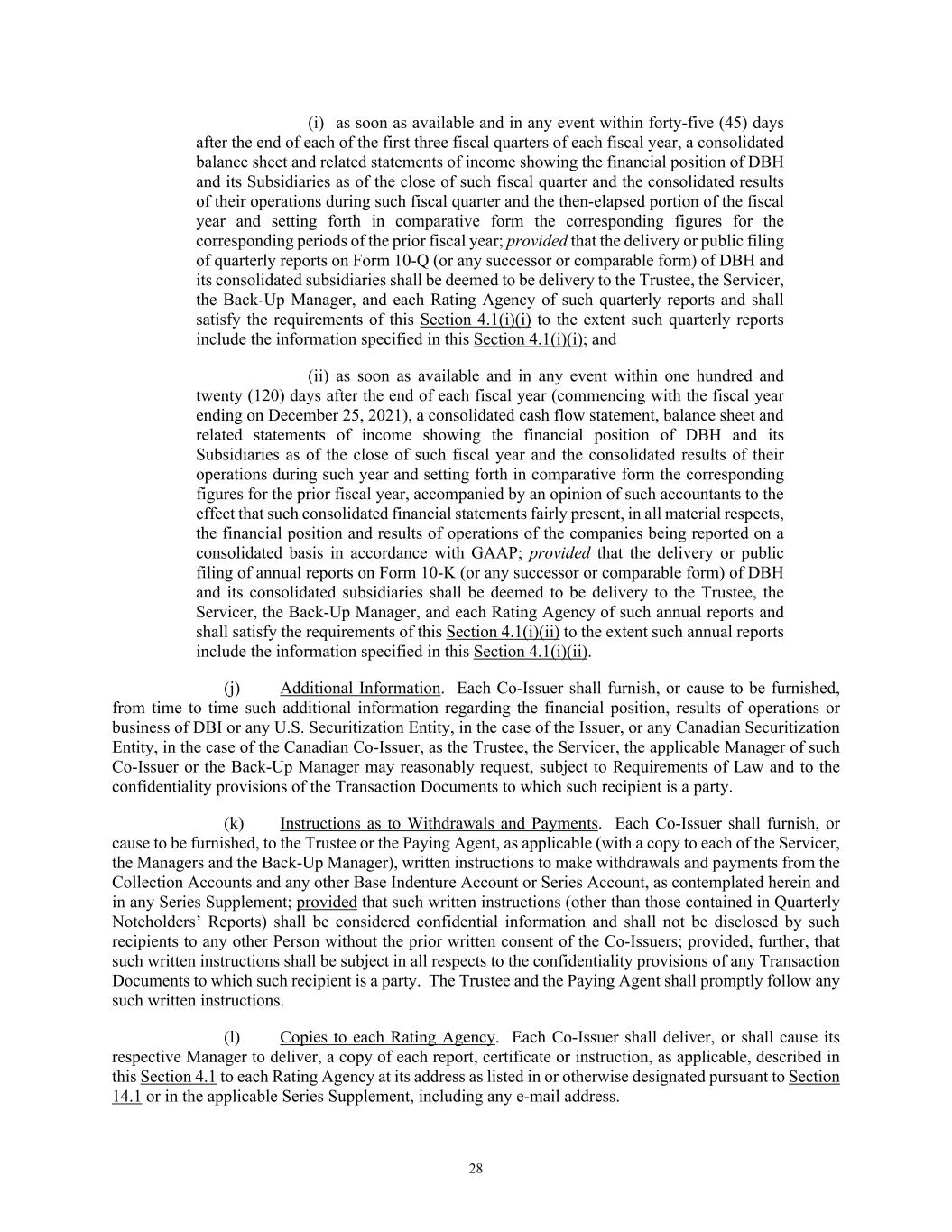 28 (i) as soon as available and in any event within forty-five (45) days after the end of each of the first three fiscal quarters of each fiscal year, a consolidated balance sheet and related statements of income showing the financial position of DBH and its Subsidiaries as of the close of such fiscal quarter and the consolidated results of their operations during such fiscal quarter and the then-elapsed portion of the fiscal year and setting forth in comparative form the corresponding figures for the corresponding periods of the prior fiscal year; provided that the delivery or public filing of quarterly reports on Form 10-Q (or any successor or comparable form) of DBH and its consolidated subsidiaries shall be deemed to be delivery to the Trustee, the Servicer, the Back-Up Manager, and each Rating Agency of such quarterly reports and shall satisfy the requirements of this Section 4.1(i)(i) to the extent such quarterly reports include the information specified in this Section 4.1(i)(i); and (ii) as soon as available and in any event within one hundred and twenty (120) days after the end of each fiscal year (commencing with the fiscal year ending on December 25, 2021), a consolidated cash flow statement, balance sheet and related statements of income showing the financial position of DBH and its Subsidiaries as of the close of such fiscal year and the consolidated results of their operations during such year and setting forth in comparative form the corresponding figures for the prior fiscal year, accompanied by an opinion of such accountants to the effect that such consolidated financial statements fairly present, in all material respects, the financial position and results of operations of the companies being reported on a consolidated basis in accordance with GAAP; provided that the delivery or public filing of annual reports on Form 10-K (or any successor or comparable form) of DBH and its consolidated subsidiaries shall be deemed to be delivery to the Trustee, the Servicer, the Back-Up Manager, and each Rating Agency of such annual reports and shall satisfy the requirements of this Section 4.1(i)(ii) to the extent such annual reports include the information specified in this Section 4.1(i)(ii). (j) Additional Information. Each Co-Issuer shall furnish, or cause to be furnished, from time to time such additional information regarding the financial position, results of operations or business of DBI or any U.S. Securitization Entity, in the case of the Issuer, or any Canadian Securitization Entity, in the case of the Canadian Co-Issuer, as the Trustee, the Servicer, the applicable Manager of such Co-Issuer or the Back-Up Manager may reasonably request, subject to Requirements of Law and to the confidentiality provisions of the Transaction Documents to which such recipient is a party. (k) Instructions as to Withdrawals and Payments. Each Co-Issuer shall furnish, or cause to be furnished, to the Trustee or the Paying Agent, as applicable (with a copy to each of the Servicer, the Managers and the Back-Up Manager), written instructions to make withdrawals and payments from the Collection Accounts and any other Base Indenture Account or Series Account, as contemplated herein and in any Series Supplement; provided that such written instructions (other than those contained in Quarterly Noteholders’ Reports) shall be considered confidential information and shall not be disclosed by such recipients to any other Person without the prior written consent of the Co-Issuers; provided, further, that such written instructions shall be subject in all respects to the confidentiality provisions of any Transaction Documents to which such recipient is a party. The Trustee and the Paying Agent shall promptly follow any such written instructions. (l) Copies to each Rating Agency. Each Co-Issuer shall deliver, or shall cause its respective Manager to deliver, a copy of each report, certificate or instruction, as applicable, described in this Section 4.1 to each Rating Agency at its address as listed in or otherwise designated pursuant to Section 14.1 or in the applicable Series Supplement, including any e-mail address.