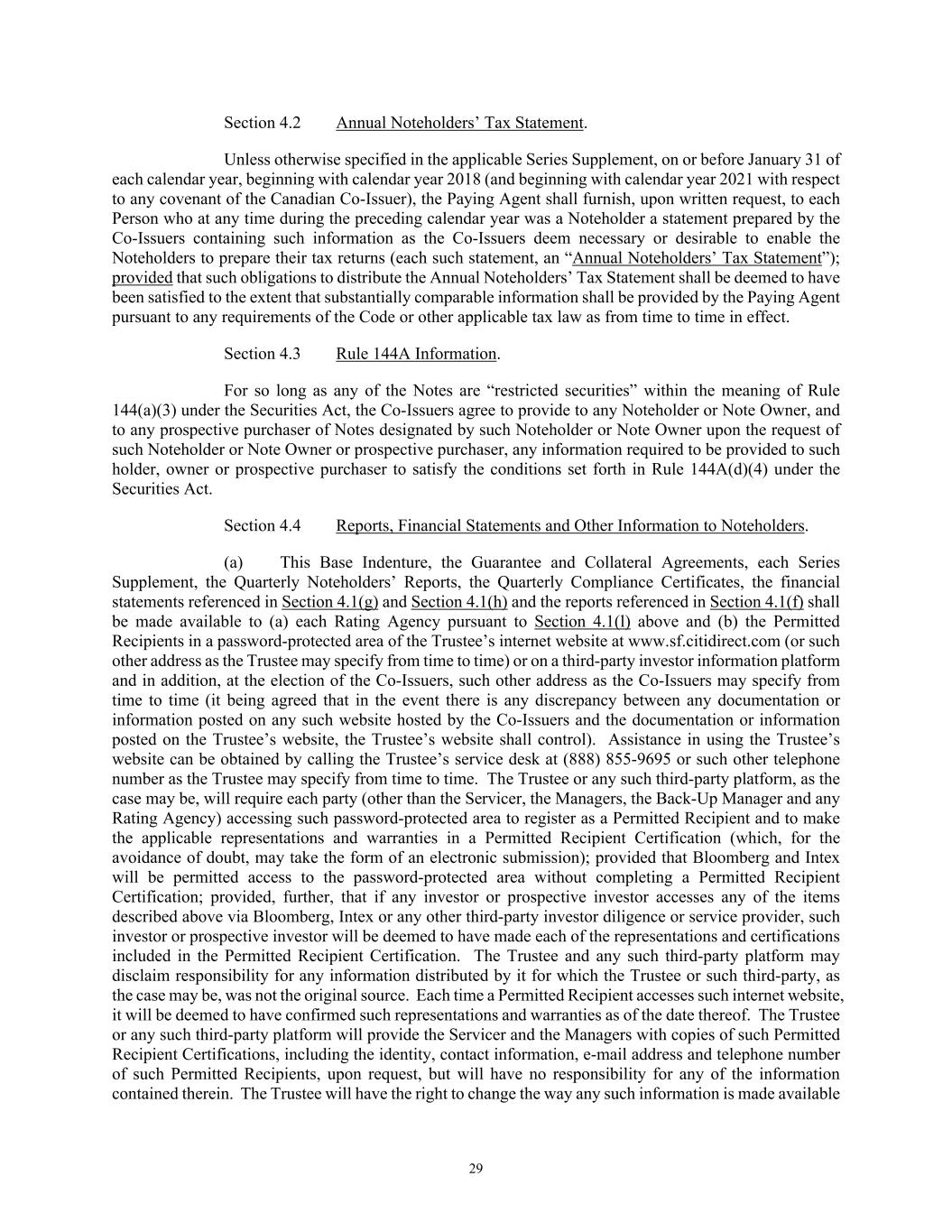 29 Section 4.2 Annual Noteholders’ Tax Statement. Unless otherwise specified in the applicable Series Supplement, on or before January 31 of each calendar year, beginning with calendar year 2018 (and beginning with calendar year 2021 with respect to any covenant of the Canadian Co-Issuer), the Paying Agent shall furnish, upon written request, to each Person who at any time during the preceding calendar year was a Noteholder a statement prepared by the Co-Issuers containing such information as the Co-Issuers deem necessary or desirable to enable the Noteholders to prepare their tax returns (each such statement, an “Annual Noteholders’ Tax Statement”); provided that such obligations to distribute the Annual Noteholders’ Tax Statement shall be deemed to have been satisfied to the extent that substantially comparable information shall be provided by the Paying Agent pursuant to any requirements of the Code or other applicable tax law as from time to time in effect. Section 4.3 Rule 144A Information. For so long as any of the Notes are “restricted securities” within the meaning of Rule 144(a)(3) under the Securities Act, the Co-Issuers agree to provide to any Noteholder or Note Owner, and to any prospective purchaser of Notes designated by such Noteholder or Note Owner upon the request of such Noteholder or Note Owner or prospective purchaser, any information required to be provided to such holder, owner or prospective purchaser to satisfy the conditions set forth in Rule 144A(d)(4) under the Securities Act. Section 4.4 Reports, Financial Statements and Other Information to Noteholders. (a) This Base Indenture, the Guarantee and Collateral Agreements, each Series Supplement, the Quarterly Noteholders’ Reports, the Quarterly Compliance Certificates, the financial statements referenced in Section 4.1(g) and Section 4.1(h) and the reports referenced in Section 4.1(f) shall be made available to (a) each Rating Agency pursuant to Section 4.1(l) above and (b) the Permitted Recipients in a password-protected area of the Trustee’s internet website at www.sf.citidirect.com (or such other address as the Trustee may specify from time to time) or on a third-party investor information platform and in addition, at the election of the Co-Issuers, such other address as the Co-Issuers may specify from time to time (it being agreed that in the event there is any discrepancy between any documentation or information posted on any such website hosted by the Co-Issuers and the documentation or information posted on the Trustee’s website, the Trustee’s website shall control). Assistance in using the Trustee’s website can be obtained by calling the Trustee’s service desk at (888) 855-9695 or such other telephone number as the Trustee may specify from time to time. The Trustee or any such third-party platform, as the case may be, will require each party (other than the Servicer, the Managers, the Back-Up Manager and any Rating Agency) accessing such password-protected area to register as a Permitted Recipient and to make the applicable representations and warranties in a Permitted Recipient Certification (which, for the avoidance of doubt, may take the form of an electronic submission); provided that Bloomberg and Intex will be permitted access to the password-protected area without completing a Permitted Recipient Certification; provided, further, that if any investor or prospective investor accesses any of the items described above via Bloomberg, Intex or any other third-party investor diligence or service provider, such investor or prospective investor will be deemed to have made each of the representations and certifications included in the Permitted Recipient Certification. The Trustee and any such third-party platform may disclaim responsibility for any information distributed by it for which the Trustee or such third-party, as the case may be, was not the original source. Each time a Permitted Recipient accesses such internet website, it will be deemed to have confirmed such representations and warranties as of the date thereof. The Trustee or any such third-party platform will provide the Servicer and the Managers with copies of such Permitted Recipient Certifications, including the identity, contact information, e-mail address and telephone number of such Permitted Recipients, upon request, but will have no responsibility for any of the information contained therein. The Trustee will have the right to change the way any such information is made available