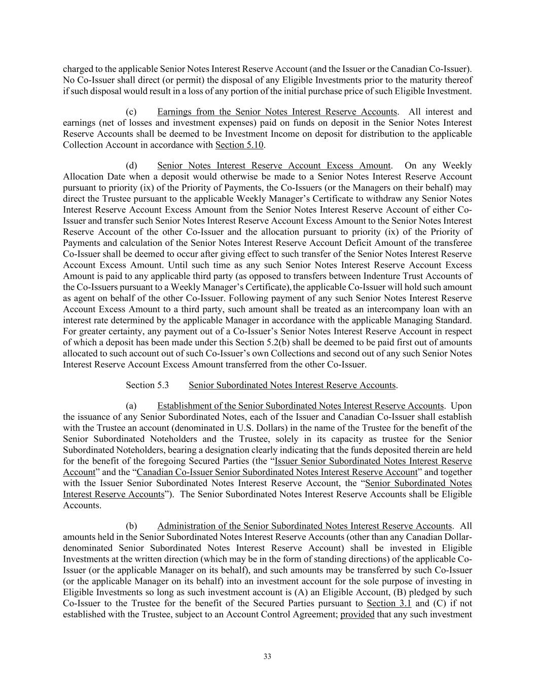 33 charged to the applicable Senior Notes Interest Reserve Account (and the Issuer or the Canadian Co-Issuer). No Co-Issuer shall direct (or permit) the disposal of any Eligible Investments prior to the maturity thereof if such disposal would result in a loss of any portion of the initial purchase price of such Eligible Investment. (c) Earnings from the Senior Notes Interest Reserve Accounts. All interest and earnings (net of losses and investment expenses) paid on funds on deposit in the Senior Notes Interest Reserve Accounts shall be deemed to be Investment Income on deposit for distribution to the applicable Collection Account in accordance with Section 5.10. (d) Senior Notes Interest Reserve Account Excess Amount. On any Weekly Allocation Date when a deposit would otherwise be made to a Senior Notes Interest Reserve Account pursuant to priority (ix) of the Priority of Payments, the Co-Issuers (or the Managers on their behalf) may direct the Trustee pursuant to the applicable Weekly Manager’s Certificate to withdraw any Senior Notes Interest Reserve Account Excess Amount from the Senior Notes Interest Reserve Account of either Co- Issuer and transfer such Senior Notes Interest Reserve Account Excess Amount to the Senior Notes Interest Reserve Account of the other Co-Issuer and the allocation pursuant to priority (ix) of the Priority of Payments and calculation of the Senior Notes Interest Reserve Account Deficit Amount of the transferee Co-Issuer shall be deemed to occur after giving effect to such transfer of the Senior Notes Interest Reserve Account Excess Amount. Until such time as any such Senior Notes Interest Reserve Account Excess Amount is paid to any applicable third party (as opposed to transfers between Indenture Trust Accounts of the Co-Issuers pursuant to a Weekly Manager’s Certificate), the applicable Co-Issuer will hold such amount as agent on behalf of the other Co-Issuer. Following payment of any such Senior Notes Interest Reserve Account Excess Amount to a third party, such amount shall be treated as an intercompany loan with an interest rate determined by the applicable Manager in accordance with the applicable Managing Standard. For greater certainty, any payment out of a Co-Issuer’s Senior Notes Interest Reserve Account in respect of which a deposit has been made under this Section 5.2(b) shall be deemed to be paid first out of amounts allocated to such account out of such Co-Issuer’s own Collections and second out of any such Senior Notes Interest Reserve Account Excess Amount transferred from the other Co-Issuer. Section 5.3 Senior Subordinated Notes Interest Reserve Accounts. (a) Establishment of the Senior Subordinated Notes Interest Reserve Accounts. Upon the issuance of any Senior Subordinated Notes, each of the Issuer and Canadian Co-Issuer shall establish with the Trustee an account (denominated in U.S. Dollars) in the name of the Trustee for the benefit of the Senior Subordinated Noteholders and the Trustee, solely in its capacity as trustee for the Senior Subordinated Noteholders, bearing a designation clearly indicating that the funds deposited therein are held for the benefit of the foregoing Secured Parties (the “Issuer Senior Subordinated Notes Interest Reserve Account” and the “Canadian Co-Issuer Senior Subordinated Notes Interest Reserve Account” and together with the Issuer Senior Subordinated Notes Interest Reserve Account, the “Senior Subordinated Notes Interest Reserve Accounts”). The Senior Subordinated Notes Interest Reserve Accounts shall be Eligible Accounts. (b) Administration of the Senior Subordinated Notes Interest Reserve Accounts. All amounts held in the Senior Subordinated Notes Interest Reserve Accounts (other than any Canadian Dollar- denominated Senior Subordinated Notes Interest Reserve Account) shall be invested in Eligible Investments at the written direction (which may be in the form of standing directions) of the applicable Co- Issuer (or the applicable Manager on its behalf), and such amounts may be transferred by such Co-Issuer (or the applicable Manager on its behalf) into an investment account for the sole purpose of investing in Eligible Investments so long as such investment account is (A) an Eligible Account, (B) pledged by such Co-Issuer to the Trustee for the benefit of the Secured Parties pursuant to Section 3.1 and (C) if not established with the Trustee, subject to an Account Control Agreement; provided that any such investment