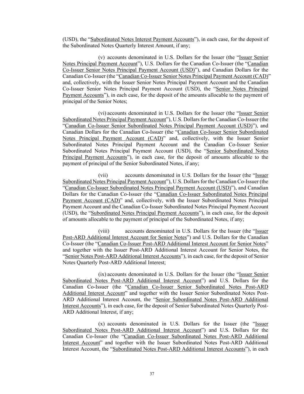 37 (USD), the “Subordinated Notes Interest Payment Accounts”), in each case, for the deposit of the Subordinated Notes Quarterly Interest Amount, if any; (v) accounts denominated in U.S. Dollars for the Issuer (the “Issuer Senior Notes Principal Payment Account”), U.S. Dollars for the Canadian Co-Issuer (the “Canadian Co-Issuer Senior Notes Principal Payment Account (USD)”), and Canadian Dollars for the Canadian Co-Issuer (the “Canadian Co-Issuer Senior Notes Principal Payment Account (CAD)” and, collectively, with the Issuer Senior Notes Principal Payment Account and the Canadian Co-Issuer Senior Notes Principal Payment Account (USD), the “Senior Notes Principal Payment Accounts”), in each case, for the deposit of the amounts allocable to the payment of principal of the Senior Notes; (vi) accounts denominated in U.S. Dollars for the Issuer (the “Issuer Senior Subordinated Notes Principal Payment Account”), U.S. Dollars for the Canadian Co-Issuer (the “Canadian Co-Issuer Senior Subordinated Notes Principal Payment Account (USD)”), and Canadian Dollars for the Canadian Co-Issuer (the “Canadian Co-Issuer Senior Subordinated Notes Principal Payment Account (CAD)” and, collectively, with the Issuer Senior Subordinated Notes Principal Payment Account and the Canadian Co-Issuer Senior Subordinated Notes Principal Payment Account (USD), the “Senior Subordinated Notes Principal Payment Accounts”), in each case, for the deposit of amounts allocable to the payment of principal of the Senior Subordinated Notes, if any; (vii) accounts denominated in U.S. Dollars for the Issuer (the “Issuer Subordinated Notes Principal Payment Account”), U.S. Dollars for the Canadian Co-Issuer (the “Canadian Co-Issuer Subordinated Notes Principal Payment Account (USD)”), and Canadian Dollars for the Canadian Co-Issuer (the “Canadian Co-Issuer Subordinated Notes Principal Payment Account (CAD)” and, collectively, with the Issuer Subordinated Notes Principal Payment Account and the Canadian Co-Issuer Subordinated Notes Principal Payment Account (USD), the “Subordinated Notes Principal Payment Accounts”), in each case, for the deposit of amounts allocable to the payment of principal of the Subordinated Notes, if any; (viii) accounts denominated in U.S. Dollars for the Issuer (the “Issuer Post-ARD Additional Interest Account for Senior Notes”) and U.S. Dollars for the Canadian Co-Issuer (the “Canadian Co-Issuer Post-ARD Additional Interest Account for Senior Notes” and together with the Issuer Post-ARD Additional Interest Account for Senior Notes, the “Senior Notes Post-ARD Additional Interest Accounts”), in each case, for the deposit of Senior Notes Quarterly Post-ARD Additional Interest; (ix) accounts denominated in U.S. Dollars for the Issuer (the “Issuer Senior Subordinated Notes Post-ARD Additional Interest Account”) and U.S. Dollars for the Canadian Co-Issuer (the “Canadian Co-Issuer Senior Subordinated Notes Post-ARD Additional Interest Account” and together with the Issuer Senior Subordinated Notes Post- ARD Additional Interest Account, the “Senior Subordinated Notes Post-ARD Additional Interest Accounts”), in each case, for the deposit of Senior Subordinated Notes Quarterly Post- ARD Additional Interest, if any; (x) accounts denominated in U.S. Dollars for the Issuer (the “Issuer Subordinated Notes Post-ARD Additional Interest Account”) and U.S. Dollars for the Canadian Co-Issuer (the “Canadian Co-Issuer Subordinated Notes Post-ARD Additional Interest Account” and together with the Issuer Subordinated Notes Post-ARD Additional Interest Account, the “Subordinated Notes Post-ARD Additional Interest Accounts”), in each