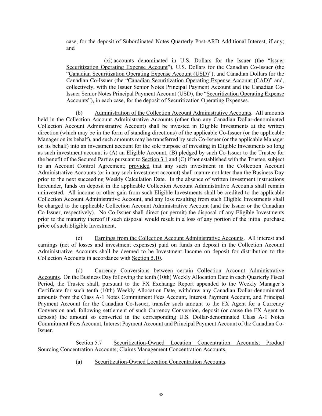 38 case, for the deposit of Subordinated Notes Quarterly Post-ARD Additional Interest, if any; and (xi) accounts denominated in U.S. Dollars for the Issuer (the “Issuer Securitization Operating Expense Account”), U.S. Dollars for the Canadian Co-Issuer (the “Canadian Securitization Operating Expense Account (USD)”), and Canadian Dollars for the Canadian Co-Issuer (the “Canadian Securitization Operating Expense Account (CAD)” and, collectively, with the Issuer Senior Notes Principal Payment Account and the Canadian Co- Issuer Senior Notes Principal Payment Account (USD), the “Securitization Operating Expense Accounts”), in each case, for the deposit of Securitization Operating Expenses. (b) Administration of the Collection Account Administrative Accounts. All amounts held in the Collection Account Administrative Accounts (other than any Canadian Dollar-denominated Collection Account Administrative Account) shall be invested in Eligible Investments at the written direction (which may be in the form of standing directions) of the applicable Co-Issuer (or the applicable Manager on its behalf), and such amounts may be transferred by such Co-Issuer (or the applicable Manager on its behalf) into an investment account for the sole purpose of investing in Eligible Investments so long as such investment account is (A) an Eligible Account, (B) pledged by such Co-Issuer to the Trustee for the benefit of the Secured Parties pursuant to Section 3.1 and (C) if not established with the Trustee, subject to an Account Control Agreement; provided that any such investment in the Collection Account Administrative Accounts (or in any such investment account) shall mature not later than the Business Day prior to the next succeeding Weekly Calculation Date. In the absence of written investment instructions hereunder, funds on deposit in the applicable Collection Account Administrative Accounts shall remain uninvested. All income or other gain from such Eligible Investments shall be credited to the applicable Collection Account Administrative Account, and any loss resulting from such Eligible Investments shall be charged to the applicable Collection Account Administrative Account (and the Issuer or the Canadian Co-Issuer, respectively). No Co-Issuer shall direct (or permit) the disposal of any Eligible Investments prior to the maturity thereof if such disposal would result in a loss of any portion of the initial purchase price of such Eligible Investment. (c) Earnings from the Collection Account Administrative Accounts. All interest and earnings (net of losses and investment expenses) paid on funds on deposit in the Collection Account Administrative Accounts shall be deemed to be Investment Income on deposit for distribution to the Collection Accounts in accordance with Section 5.10. (d) Currency Conversions between certain Collection Account Administrative Accounts. On the Business Day following the tenth (10th) Weekly Allocation Date in each Quarterly Fiscal Period, the Trustee shall, pursuant to the FX Exchange Report appended to the Weekly Manager’s Certificate for such tenth (10th) Weekly Allocation Date, withdraw any Canadian Dollar-denominated amounts from the Class A-1 Notes Commitment Fees Account, Interest Payment Account, and Principal Payment Account for the Canadian Co-Issuer, transfer such amount to the FX Agent for a Currency Conversion and, following settlement of such Currency Conversion, deposit (or cause the FX Agent to deposit) the amount so converted in the corresponding U.S. Dollar-denominated Class A-1 Notes Commitment Fees Account, Interest Payment Account and Principal Payment Account of the Canadian Co- Issuer. Section 5.7 Securitization-Owned Location Concentration Accounts; Product Sourcing Concentration Accounts; Claims Management Concentration Accounts. (a) Securitization-Owned Location Concentration Accounts.