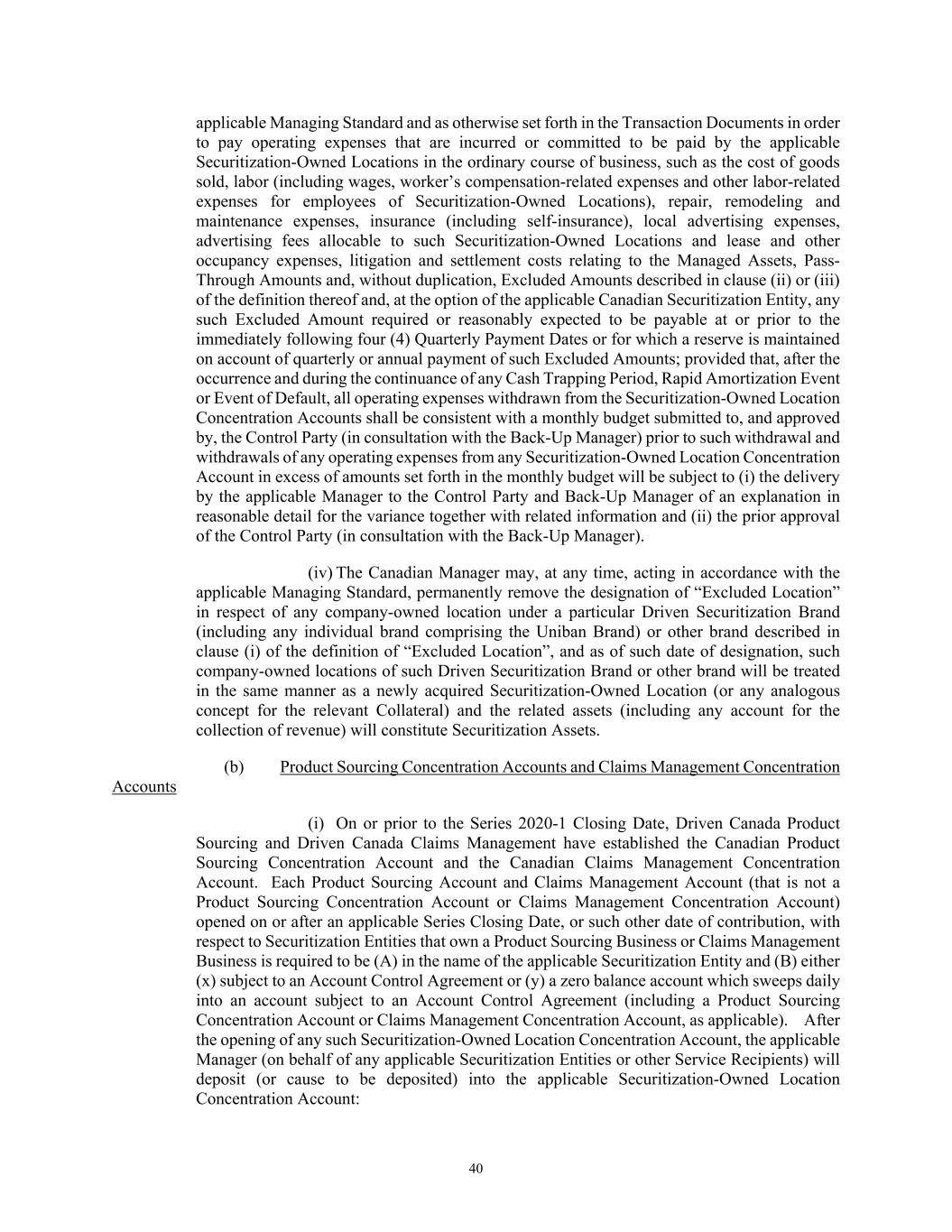 40 applicable Managing Standard and as otherwise set forth in the Transaction Documents in order to pay operating expenses that are incurred or committed to be paid by the applicable Securitization-Owned Locations in the ordinary course of business, such as the cost of goods sold, labor (including wages, worker’s compensation-related expenses and other labor-related expenses for employees of Securitization-Owned Locations), repair, remodeling and maintenance expenses, insurance (including self-insurance), local advertising expenses, advertising fees allocable to such Securitization-Owned Locations and lease and other occupancy expenses, litigation and settlement costs relating to the Managed Assets, Pass- Through Amounts and, without duplication, Excluded Amounts described in clause (ii) or (iii) of the definition thereof and, at the option of the applicable Canadian Securitization Entity, any such Excluded Amount required or reasonably expected to be payable at or prior to the immediately following four (4) Quarterly Payment Dates or for which a reserve is maintained on account of quarterly or annual payment of such Excluded Amounts; provided that, after the occurrence and during the continuance of any Cash Trapping Period, Rapid Amortization Event or Event of Default, all operating expenses withdrawn from the Securitization-Owned Location Concentration Accounts shall be consistent with a monthly budget submitted to, and approved by, the Control Party (in consultation with the Back-Up Manager) prior to such withdrawal and withdrawals of any operating expenses from any Securitization-Owned Location Concentration Account in excess of amounts set forth in the monthly budget will be subject to (i) the delivery by the applicable Manager to the Control Party and Back-Up Manager of an explanation in reasonable detail for the variance together with related information and (ii) the prior approval of the Control Party (in consultation with the Back-Up Manager). (iv) The Canadian Manager may, at any time, acting in accordance with the applicable Managing Standard, permanently remove the designation of “Excluded Location” in respect of any company-owned location under a particular Driven Securitization Brand (including any individual brand comprising the Uniban Brand) or other brand described in clause (i) of the definition of “Excluded Location”, and as of such date of designation, such company-owned locations of such Driven Securitization Brand or other brand will be treated in the same manner as a newly acquired Securitization-Owned Location (or any analogous concept for the relevant Collateral) and the related assets (including any account for the collection of revenue) will constitute Securitization Assets. (b) Product Sourcing Concentration Accounts and Claims Management Concentration Accounts (i) On or prior to the Series 2020-1 Closing Date, Driven Canada Product Sourcing and Driven Canada Claims Management have established the Canadian Product Sourcing Concentration Account and the Canadian Claims Management Concentration Account. Each Product Sourcing Account and Claims Management Account (that is not a Product Sourcing Concentration Account or Claims Management Concentration Account) opened on or after an applicable Series Closing Date, or such other date of contribution, with respect to Securitization Entities that own a Product Sourcing Business or Claims Management Business is required to be (A) in the name of the applicable Securitization Entity and (B) either (x) subject to an Account Control Agreement or (y) a zero balance account which sweeps daily into an account subject to an Account Control Agreement (including a Product Sourcing Concentration Account or Claims Management Concentration Account, as applicable). After the opening of any such Securitization-Owned Location Concentration Account, the applicable Manager (on behalf of any applicable Securitization Entities or other Service Recipients) will deposit (or cause to be deposited) into the applicable Securitization-Owned Location Concentration Account: