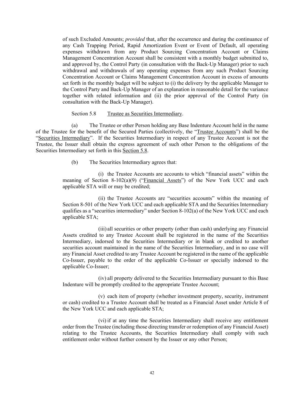42 of such Excluded Amounts; provided that, after the occurrence and during the continuance of any Cash Trapping Period, Rapid Amortization Event or Event of Default, all operating expenses withdrawn from any Product Sourcing Concentration Account or Claims Management Concentration Account shall be consistent with a monthly budget submitted to, and approved by, the Control Party (in consultation with the Back-Up Manager) prior to such withdrawal and withdrawals of any operating expenses from any such Product Sourcing Concentration Account or Claims Management Concentration Account in excess of amounts set forth in the monthly budget will be subject to (i) the delivery by the applicable Manager to the Control Party and Back-Up Manager of an explanation in reasonable detail for the variance together with related information and (ii) the prior approval of the Control Party (in consultation with the Back-Up Manager). Section 5.8 Trustee as Securities Intermediary. (a) The Trustee or other Person holding any Base Indenture Account held in the name of the Trustee for the benefit of the Secured Parties (collectively, the “Trustee Accounts”) shall be the “Securities Intermediary”. If the Securities Intermediary in respect of any Trustee Account is not the Trustee, the Issuer shall obtain the express agreement of such other Person to the obligations of the Securities Intermediary set forth in this Section 5.8. (b) The Securities Intermediary agrees that: (i) the Trustee Accounts are accounts to which “financial assets” within the meaning of Section 8-102(a)(9) (“Financial Assets”) of the New York UCC and each applicable STA will or may be credited; (ii) the Trustee Accounts are “securities accounts” within the meaning of Section 8-501 of the New York UCC and each applicable STA and the Securities Intermediary qualifies as a “securities intermediary” under Section 8-102(a) of the New York UCC and each applicable STA; (iii) all securities or other property (other than cash) underlying any Financial Assets credited to any Trustee Account shall be registered in the name of the Securities Intermediary, indorsed to the Securities Intermediary or in blank or credited to another securities account maintained in the name of the Securities Intermediary, and in no case will any Financial Asset credited to any Trustee Account be registered in the name of the applicable Co-Issuer, payable to the order of the applicable Co-Issuer or specially indorsed to the applicable Co-Issuer; (iv) all property delivered to the Securities Intermediary pursuant to this Base Indenture will be promptly credited to the appropriate Trustee Account; (v) each item of property (whether investment property, security, instrument or cash) credited to a Trustee Account shall be treated as a Financial Asset under Article 8 of the New York UCC and each applicable STA; (vi) if at any time the Securities Intermediary shall receive any entitlement order from the Trustee (including those directing transfer or redemption of any Financial Asset) relating to the Trustee Accounts, the Securities Intermediary shall comply with such entitlement order without further consent by the Issuer or any other Person;