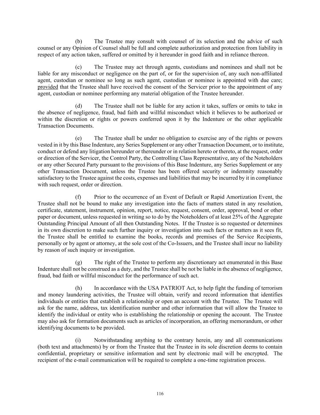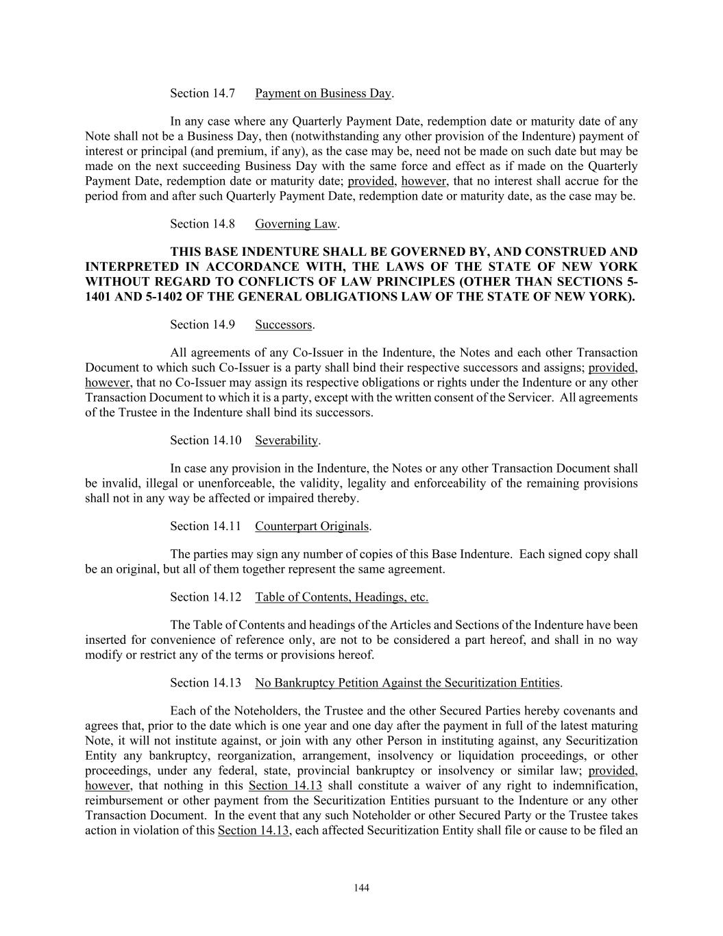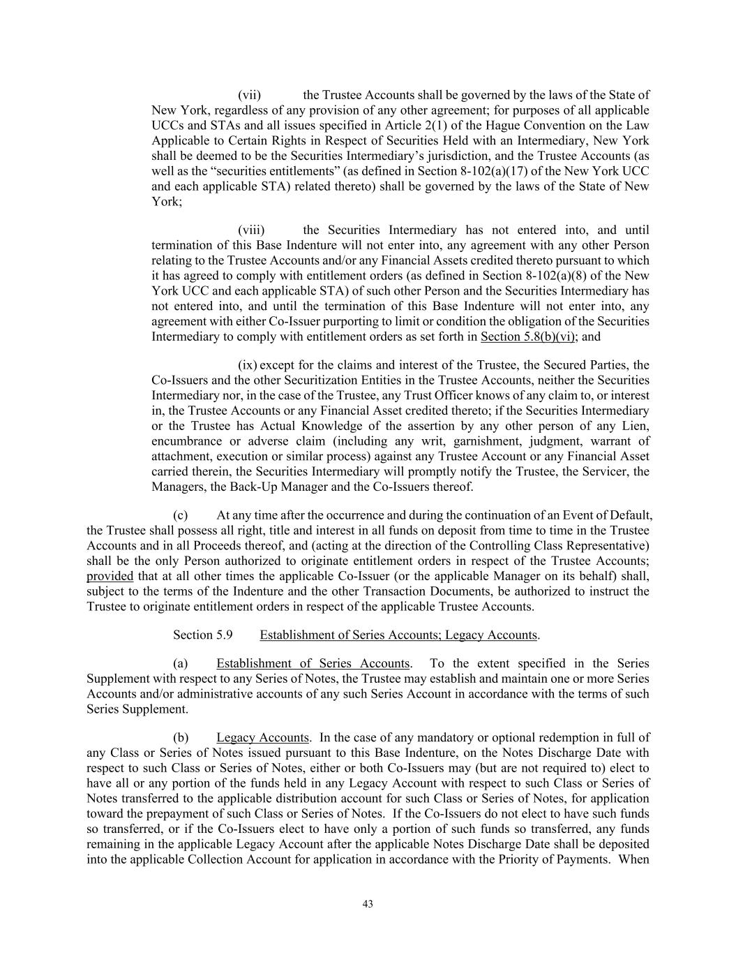 43 (vii) the Trustee Accounts shall be governed by the laws of the State of New York, regardless of any provision of any other agreement; for purposes of all applicable UCCs and STAs and all issues specified in Article 2(1) of the Hague Convention on the Law Applicable to Certain Rights in Respect of Securities Held with an Intermediary, New York shall be deemed to be the Securities Intermediary’s jurisdiction, and the Trustee Accounts (as well as the “securities entitlements” (as defined in Section 8-102(a)(17) of the New York UCC and each applicable STA) related thereto) shall be governed by the laws of the State of New York; (viii) the Securities Intermediary has not entered into, and until termination of this Base Indenture will not enter into, any agreement with any other Person relating to the Trustee Accounts and/or any Financial Assets credited thereto pursuant to which it has agreed to comply with entitlement orders (as defined in Section 8-102(a)(8) of the New York UCC and each applicable STA) of such other Person and the Securities Intermediary has not entered into, and until the termination of this Base Indenture will not enter into, any agreement with either Co-Issuer purporting to limit or condition the obligation of the Securities Intermediary to comply with entitlement orders as set forth in Section 5.8(b)(vi); and (ix) except for the claims and interest of the Trustee, the Secured Parties, the Co-Issuers and the other Securitization Entities in the Trustee Accounts, neither the Securities Intermediary nor, in the case of the Trustee, any Trust Officer knows of any claim to, or interest in, the Trustee Accounts or any Financial Asset credited thereto; if the Securities Intermediary or the Trustee has Actual Knowledge of the assertion by any other person of any Lien, encumbrance or adverse claim (including any writ, garnishment, judgment, warrant of attachment, execution or similar process) against any Trustee Account or any Financial Asset carried therein, the Securities Intermediary will promptly notify the Trustee, the Servicer, the Managers, the Back-Up Manager and the Co-Issuers thereof. (c) At any time after the occurrence and during the continuation of an Event of Default, the Trustee shall possess all right, title and interest in all funds on deposit from time to time in the Trustee Accounts and in all Proceeds thereof, and (acting at the direction of the Controlling Class Representative) shall be the only Person authorized to originate entitlement orders in respect of the Trustee Accounts; provided that at all other times the applicable Co-Issuer (or the applicable Manager on its behalf) shall, subject to the terms of the Indenture and the other Transaction Documents, be authorized to instruct the Trustee to originate entitlement orders in respect of the applicable Trustee Accounts. Section 5.9 Establishment of Series Accounts; Legacy Accounts. (a) Establishment of Series Accounts. To the extent specified in the Series Supplement with respect to any Series of Notes, the Trustee may establish and maintain one or more Series Accounts and/or administrative accounts of any such Series Account in accordance with the terms of such Series Supplement. (b) Legacy Accounts. In the case of any mandatory or optional redemption in full of any Class or Series of Notes issued pursuant to this Base Indenture, on the Notes Discharge Date with respect to such Class or Series of Notes, either or both Co-Issuers may (but are not required to) elect to have all or any portion of the funds held in any Legacy Account with respect to such Class or Series of Notes transferred to the applicable distribution account for such Class or Series of Notes, for application toward the prepayment of such Class or Series of Notes. If the Co-Issuers do not elect to have such funds so transferred, or if the Co-Issuers elect to have only a portion of such funds so transferred, any funds remaining in the applicable Legacy Account after the applicable Notes Discharge Date shall be deposited into the applicable Collection Account for application in accordance with the Priority of Payments. When