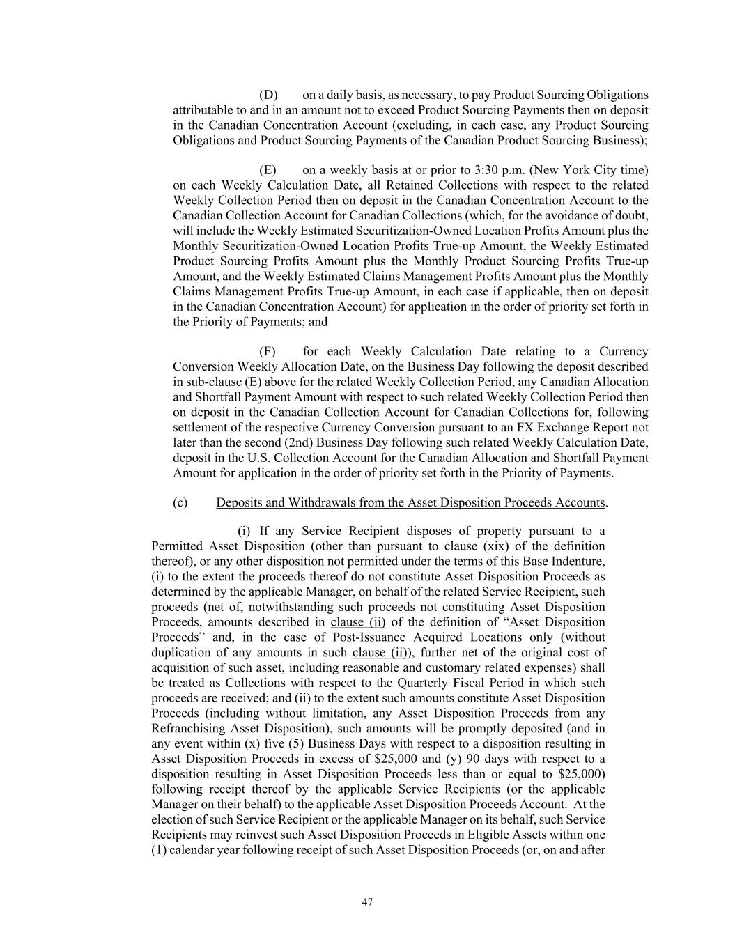47 (D) on a daily basis, as necessary, to pay Product Sourcing Obligations attributable to and in an amount not to exceed Product Sourcing Payments then on deposit in the Canadian Concentration Account (excluding, in each case, any Product Sourcing Obligations and Product Sourcing Payments of the Canadian Product Sourcing Business); (E) on a weekly basis at or prior to 3:30 p.m. (New York City time) on each Weekly Calculation Date, all Retained Collections with respect to the related Weekly Collection Period then on deposit in the Canadian Concentration Account to the Canadian Collection Account for Canadian Collections (which, for the avoidance of doubt, will include the Weekly Estimated Securitization-Owned Location Profits Amount plus the Monthly Securitization-Owned Location Profits True-up Amount, the Weekly Estimated Product Sourcing Profits Amount plus the Monthly Product Sourcing Profits True-up Amount, and the Weekly Estimated Claims Management Profits Amount plus the Monthly Claims Management Profits True-up Amount, in each case if applicable, then on deposit in the Canadian Concentration Account) for application in the order of priority set forth in the Priority of Payments; and (F) for each Weekly Calculation Date relating to a Currency Conversion Weekly Allocation Date, on the Business Day following the deposit described in sub-clause (E) above for the related Weekly Collection Period, any Canadian Allocation and Shortfall Payment Amount with respect to such related Weekly Collection Period then on deposit in the Canadian Collection Account for Canadian Collections for, following settlement of the respective Currency Conversion pursuant to an FX Exchange Report not later than the second (2nd) Business Day following such related Weekly Calculation Date, deposit in the U.S. Collection Account for the Canadian Allocation and Shortfall Payment Amount for application in the order of priority set forth in the Priority of Payments. (c) Deposits and Withdrawals from the Asset Disposition Proceeds Accounts. (i) If any Service Recipient disposes of property pursuant to a Permitted Asset Disposition (other than pursuant to clause (xix) of the definition thereof), or any other disposition not permitted under the terms of this Base Indenture, (i) to the extent the proceeds thereof do not constitute Asset Disposition Proceeds as determined by the applicable Manager, on behalf of the related Service Recipient, such proceeds (net of, notwithstanding such proceeds not constituting Asset Disposition Proceeds, amounts described in clause (ii) of the definition of “Asset Disposition Proceeds” and, in the case of Post-Issuance Acquired Locations only (without duplication of any amounts in such clause (ii)), further net of the original cost of acquisition of such asset, including reasonable and customary related expenses) shall be treated as Collections with respect to the Quarterly Fiscal Period in which such proceeds are received; and (ii) to the extent such amounts constitute Asset Disposition Proceeds (including without limitation, any Asset Disposition Proceeds from any Refranchising Asset Disposition), such amounts will be promptly deposited (and in any event within (x) five (5) Business Days with respect to a disposition resulting in Asset Disposition Proceeds in excess of $25,000 and (y) 90 days with respect to a disposition resulting in Asset Disposition Proceeds less than or equal to $25,000) following receipt thereof by the applicable Service Recipients (or the applicable Manager on their behalf) to the applicable Asset Disposition Proceeds Account. At the election of such Service Recipient or the applicable Manager on its behalf, such Service Recipients may reinvest such Asset Disposition Proceeds in Eligible Assets within one (1) calendar year following receipt of such Asset Disposition Proceeds (or, on and after