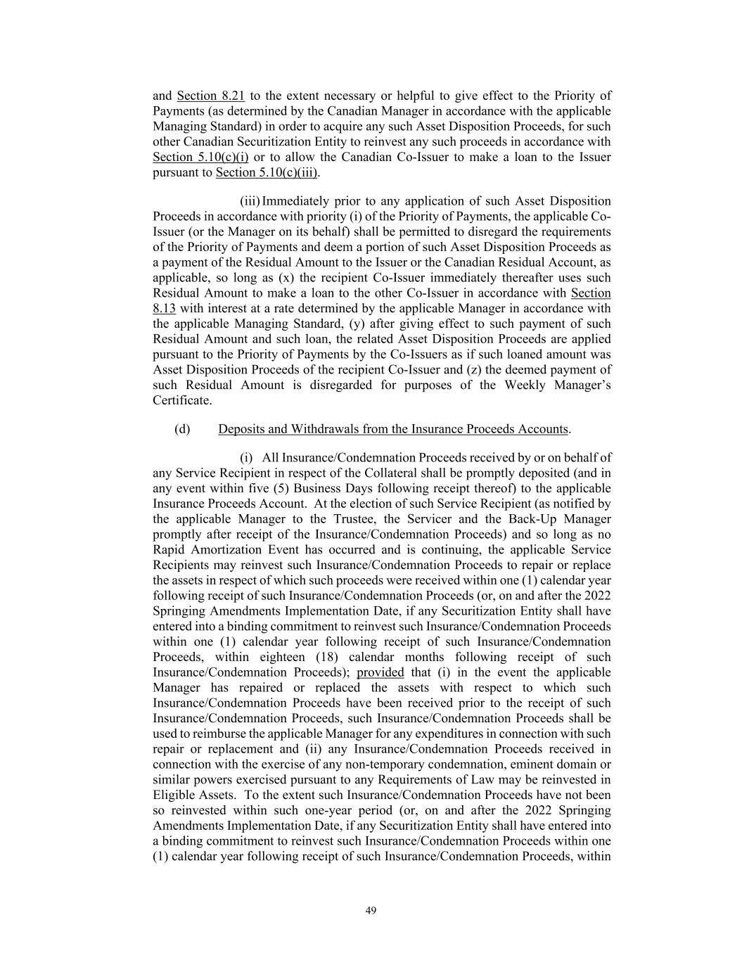 49 and Section 8.21 to the extent necessary or helpful to give effect to the Priority of Payments (as determined by the Canadian Manager in accordance with the applicable Managing Standard) in order to acquire any such Asset Disposition Proceeds, for such other Canadian Securitization Entity to reinvest any such proceeds in accordance with Section 5.10(c)(i) or to allow the Canadian Co-Issuer to make a loan to the Issuer pursuant to Section 5.10(c)(iii). (iii) Immediately prior to any application of such Asset Disposition Proceeds in accordance with priority (i) of the Priority of Payments, the applicable Co- Issuer (or the Manager on its behalf) shall be permitted to disregard the requirements of the Priority of Payments and deem a portion of such Asset Disposition Proceeds as a payment of the Residual Amount to the Issuer or the Canadian Residual Account, as applicable, so long as (x) the recipient Co-Issuer immediately thereafter uses such Residual Amount to make a loan to the other Co-Issuer in accordance with Section 8.13 with interest at a rate determined by the applicable Manager in accordance with the applicable Managing Standard, (y) after giving effect to such payment of such Residual Amount and such loan, the related Asset Disposition Proceeds are applied pursuant to the Priority of Payments by the Co-Issuers as if such loaned amount was Asset Disposition Proceeds of the recipient Co-Issuer and (z) the deemed payment of such Residual Amount is disregarded for purposes of the Weekly Manager’s Certificate. (d) Deposits and Withdrawals from the Insurance Proceeds Accounts. (i) All Insurance/Condemnation Proceeds received by or on behalf of any Service Recipient in respect of the Collateral shall be promptly deposited (and in any event within five (5) Business Days following receipt thereof) to the applicable Insurance Proceeds Account. At the election of such Service Recipient (as notified by the applicable Manager to the Trustee, the Servicer and the Back-Up Manager promptly after receipt of the Insurance/Condemnation Proceeds) and so long as no Rapid Amortization Event has occurred and is continuing, the applicable Service Recipients may reinvest such Insurance/Condemnation Proceeds to repair or replace the assets in respect of which such proceeds were received within one (1) calendar year following receipt of such Insurance/Condemnation Proceeds (or, on and after the 2022 Springing Amendments Implementation Date, if any Securitization Entity shall have entered into a binding commitment to reinvest such Insurance/Condemnation Proceeds within one (1) calendar year following receipt of such Insurance/Condemnation Proceeds, within eighteen (18) calendar months following receipt of such Insurance/Condemnation Proceeds); provided that (i) in the event the applicable Manager has repaired or replaced the assets with respect to which such Insurance/Condemnation Proceeds have been received prior to the receipt of such Insurance/Condemnation Proceeds, such Insurance/Condemnation Proceeds shall be used to reimburse the applicable Manager for any expenditures in connection with such repair or replacement and (ii) any Insurance/Condemnation Proceeds received in connection with the exercise of any non-temporary condemnation, eminent domain or similar powers exercised pursuant to any Requirements of Law may be reinvested in Eligible Assets. To the extent such Insurance/Condemnation Proceeds have not been so reinvested within such one-year period (or, on and after the 2022 Springing Amendments Implementation Date, if any Securitization Entity shall have entered into a binding commitment to reinvest such Insurance/Condemnation Proceeds within one (1) calendar year following receipt of such Insurance/Condemnation Proceeds, within