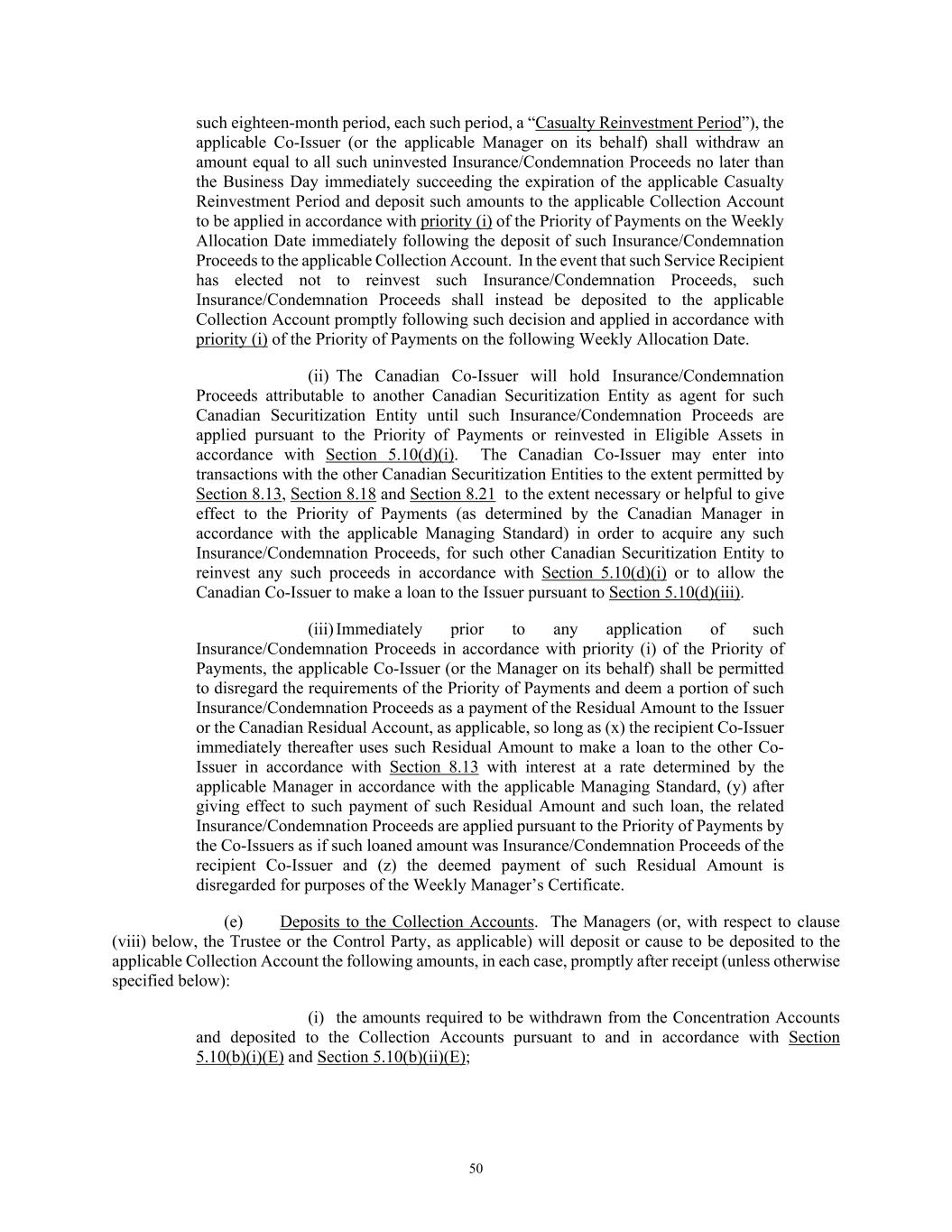 50 such eighteen-month period, each such period, a “Casualty Reinvestment Period”), the applicable Co-Issuer (or the applicable Manager on its behalf) shall withdraw an amount equal to all such uninvested Insurance/Condemnation Proceeds no later than the Business Day immediately succeeding the expiration of the applicable Casualty Reinvestment Period and deposit such amounts to the applicable Collection Account to be applied in accordance with priority (i) of the Priority of Payments on the Weekly Allocation Date immediately following the deposit of such Insurance/Condemnation Proceeds to the applicable Collection Account. In the event that such Service Recipient has elected not to reinvest such Insurance/Condemnation Proceeds, such Insurance/Condemnation Proceeds shall instead be deposited to the applicable Collection Account promptly following such decision and applied in accordance with priority (i) of the Priority of Payments on the following Weekly Allocation Date. (ii) The Canadian Co-Issuer will hold Insurance/Condemnation Proceeds attributable to another Canadian Securitization Entity as agent for such Canadian Securitization Entity until such Insurance/Condemnation Proceeds are applied pursuant to the Priority of Payments or reinvested in Eligible Assets in accordance with Section 5.10(d)(i). The Canadian Co-Issuer may enter into transactions with the other Canadian Securitization Entities to the extent permitted by Section 8.13, Section 8.18 and Section 8.21 to the extent necessary or helpful to give effect to the Priority of Payments (as determined by the Canadian Manager in accordance with the applicable Managing Standard) in order to acquire any such Insurance/Condemnation Proceeds, for such other Canadian Securitization Entity to reinvest any such proceeds in accordance with Section 5.10(d)(i) or to allow the Canadian Co-Issuer to make a loan to the Issuer pursuant to Section 5.10(d)(iii). (iii) Immediately prior to any application of such Insurance/Condemnation Proceeds in accordance with priority (i) of the Priority of Payments, the applicable Co-Issuer (or the Manager on its behalf) shall be permitted to disregard the requirements of the Priority of Payments and deem a portion of such Insurance/Condemnation Proceeds as a payment of the Residual Amount to the Issuer or the Canadian Residual Account, as applicable, so long as (x) the recipient Co-Issuer immediately thereafter uses such Residual Amount to make a loan to the other Co- Issuer in accordance with Section 8.13 with interest at a rate determined by the applicable Manager in accordance with the applicable Managing Standard, (y) after giving effect to such payment of such Residual Amount and such loan, the related Insurance/Condemnation Proceeds are applied pursuant to the Priority of Payments by the Co-Issuers as if such loaned amount was Insurance/Condemnation Proceeds of the recipient Co-Issuer and (z) the deemed payment of such Residual Amount is disregarded for purposes of the Weekly Manager’s Certificate. (e) Deposits to the Collection Accounts. The Managers (or, with respect to clause (viii) below, the Trustee or the Control Party, as applicable) will deposit or cause to be deposited to the applicable Collection Account the following amounts, in each case, promptly after receipt (unless otherwise specified below): (i) the amounts required to be withdrawn from the Concentration Accounts and deposited to the Collection Accounts pursuant to and in accordance with Section 5.10(b)(i)(E) and Section 5.10(b)(ii)(E);