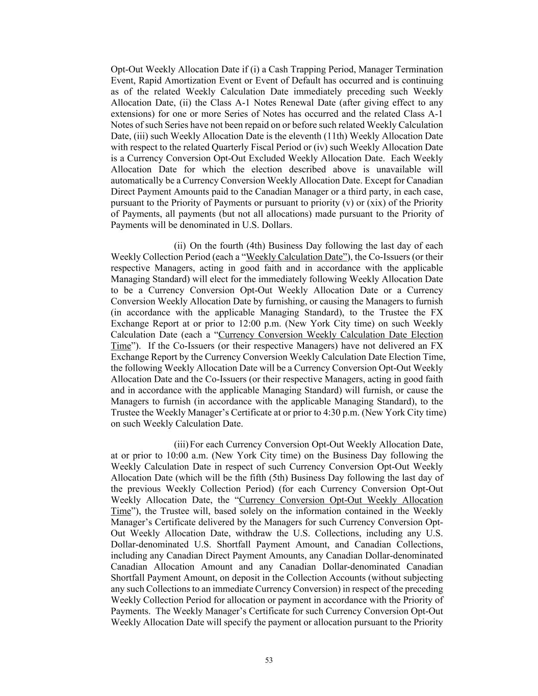 53 Opt-Out Weekly Allocation Date if (i) a Cash Trapping Period, Manager Termination Event, Rapid Amortization Event or Event of Default has occurred and is continuing as of the related Weekly Calculation Date immediately preceding such Weekly Allocation Date, (ii) the Class A-1 Notes Renewal Date (after giving effect to any extensions) for one or more Series of Notes has occurred and the related Class A-1 Notes of such Series have not been repaid on or before such related Weekly Calculation Date, (iii) such Weekly Allocation Date is the eleventh (11th) Weekly Allocation Date with respect to the related Quarterly Fiscal Period or (iv) such Weekly Allocation Date is a Currency Conversion Opt-Out Excluded Weekly Allocation Date. Each Weekly Allocation Date for which the election described above is unavailable will automatically be a Currency Conversion Weekly Allocation Date. Except for Canadian Direct Payment Amounts paid to the Canadian Manager or a third party, in each case, pursuant to the Priority of Payments or pursuant to priority (v) or (xix) of the Priority of Payments, all payments (but not all allocations) made pursuant to the Priority of Payments will be denominated in U.S. Dollars. (ii) On the fourth (4th) Business Day following the last day of each Weekly Collection Period (each a “Weekly Calculation Date”), the Co-Issuers (or their respective Managers, acting in good faith and in accordance with the applicable Managing Standard) will elect for the immediately following Weekly Allocation Date to be a Currency Conversion Opt-Out Weekly Allocation Date or a Currency Conversion Weekly Allocation Date by furnishing, or causing the Managers to furnish (in accordance with the applicable Managing Standard), to the Trustee the FX Exchange Report at or prior to 12:00 p.m. (New York City time) on such Weekly Calculation Date (each a “Currency Conversion Weekly Calculation Date Election Time”). If the Co-Issuers (or their respective Managers) have not delivered an FX Exchange Report by the Currency Conversion Weekly Calculation Date Election Time, the following Weekly Allocation Date will be a Currency Conversion Opt-Out Weekly Allocation Date and the Co-Issuers (or their respective Managers, acting in good faith and in accordance with the applicable Managing Standard) will furnish, or cause the Managers to furnish (in accordance with the applicable Managing Standard), to the Trustee the Weekly Manager’s Certificate at or prior to 4:30 p.m. (New York City time) on such Weekly Calculation Date. (iii) For each Currency Conversion Opt-Out Weekly Allocation Date, at or prior to 10:00 a.m. (New York City time) on the Business Day following the Weekly Calculation Date in respect of such Currency Conversion Opt-Out Weekly Allocation Date (which will be the fifth (5th) Business Day following the last day of the previous Weekly Collection Period) (for each Currency Conversion Opt-Out Weekly Allocation Date, the “Currency Conversion Opt-Out Weekly Allocation Time”), the Trustee will, based solely on the information contained in the Weekly Manager’s Certificate delivered by the Managers for such Currency Conversion Opt- Out Weekly Allocation Date, withdraw the U.S. Collections, including any U.S. Dollar-denominated U.S. Shortfall Payment Amount, and Canadian Collections, including any Canadian Direct Payment Amounts, any Canadian Dollar-denominated Canadian Allocation Amount and any Canadian Dollar-denominated Canadian Shortfall Payment Amount, on deposit in the Collection Accounts (without subjecting any such Collections to an immediate Currency Conversion) in respect of the preceding Weekly Collection Period for allocation or payment in accordance with the Priority of Payments. The Weekly Manager’s Certificate for such Currency Conversion Opt-Out Weekly Allocation Date will specify the payment or allocation pursuant to the Priority