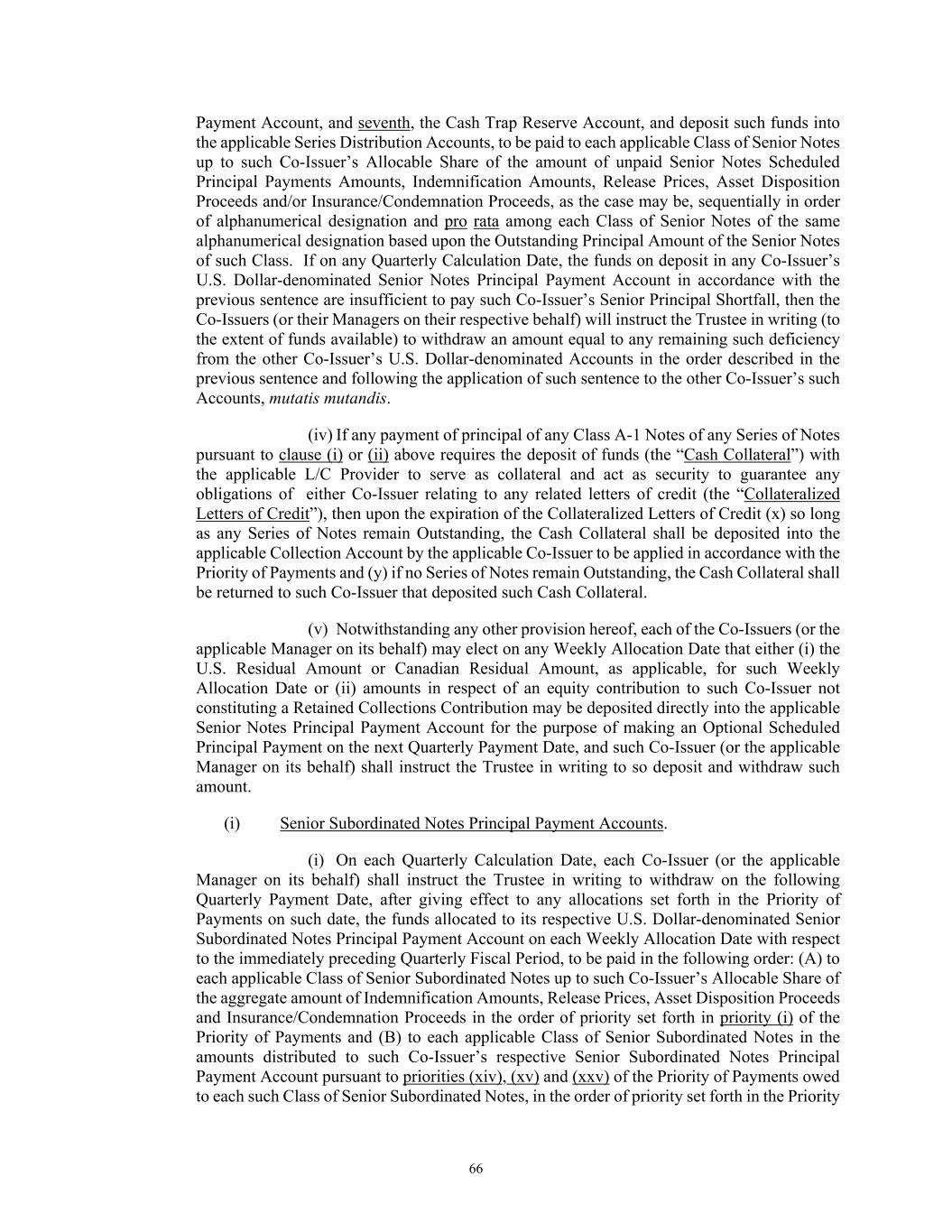 66 Payment Account, and seventh, the Cash Trap Reserve Account, and deposit such funds into the applicable Series Distribution Accounts, to be paid to each applicable Class of Senior Notes up to such Co-Issuer’s Allocable Share of the amount of unpaid Senior Notes Scheduled Principal Payments Amounts, Indemnification Amounts, Release Prices, Asset Disposition Proceeds and/or Insurance/Condemnation Proceeds, as the case may be, sequentially in order of alphanumerical designation and pro rata among each Class of Senior Notes of the same alphanumerical designation based upon the Outstanding Principal Amount of the Senior Notes of such Class. If on any Quarterly Calculation Date, the funds on deposit in any Co-Issuer’s U.S. Dollar-denominated Senior Notes Principal Payment Account in accordance with the previous sentence are insufficient to pay such Co-Issuer’s Senior Principal Shortfall, then the Co-Issuers (or their Managers on their respective behalf) will instruct the Trustee in writing (to the extent of funds available) to withdraw an amount equal to any remaining such deficiency from the other Co-Issuer’s U.S. Dollar-denominated Accounts in the order described in the previous sentence and following the application of such sentence to the other Co-Issuer’s such Accounts, mutatis mutandis. (iv) If any payment of principal of any Class A-1 Notes of any Series of Notes pursuant to clause (i) or (ii) above requires the deposit of funds (the “Cash Collateral”) with the applicable L/C Provider to serve as collateral and act as security to guarantee any obligations of either Co-Issuer relating to any related letters of credit (the “Collateralized Letters of Credit”), then upon the expiration of the Collateralized Letters of Credit (x) so long as any Series of Notes remain Outstanding, the Cash Collateral shall be deposited into the applicable Collection Account by the applicable Co-Issuer to be applied in accordance with the Priority of Payments and (y) if no Series of Notes remain Outstanding, the Cash Collateral shall be returned to such Co-Issuer that deposited such Cash Collateral. (v) Notwithstanding any other provision hereof, each of the Co-Issuers (or the applicable Manager on its behalf) may elect on any Weekly Allocation Date that either (i) the U.S. Residual Amount or Canadian Residual Amount, as applicable, for such Weekly Allocation Date or (ii) amounts in respect of an equity contribution to such Co-Issuer not constituting a Retained Collections Contribution may be deposited directly into the applicable Senior Notes Principal Payment Account for the purpose of making an Optional Scheduled Principal Payment on the next Quarterly Payment Date, and such Co-Issuer (or the applicable Manager on its behalf) shall instruct the Trustee in writing to so deposit and withdraw such amount. (i) Senior Subordinated Notes Principal Payment Accounts. (i) On each Quarterly Calculation Date, each Co-Issuer (or the applicable Manager on its behalf) shall instruct the Trustee in writing to withdraw on the following Quarterly Payment Date, after giving effect to any allocations set forth in the Priority of Payments on such date, the funds allocated to its respective U.S. Dollar-denominated Senior Subordinated Notes Principal Payment Account on each Weekly Allocation Date with respect to the immediately preceding Quarterly Fiscal Period, to be paid in the following order: (A) to each applicable Class of Senior Subordinated Notes up to such Co-Issuer’s Allocable Share of the aggregate amount of Indemnification Amounts, Release Prices, Asset Disposition Proceeds and Insurance/Condemnation Proceeds in the order of priority set forth in priority (i) of the Priority of Payments and (B) to each applicable Class of Senior Subordinated Notes in the amounts distributed to such Co-Issuer’s respective Senior Subordinated Notes Principal Payment Account pursuant to priorities (xiv), (xv) and (xxv) of the Priority of Payments owed to each such Class of Senior Subordinated Notes, in the order of priority set forth in the Priority
