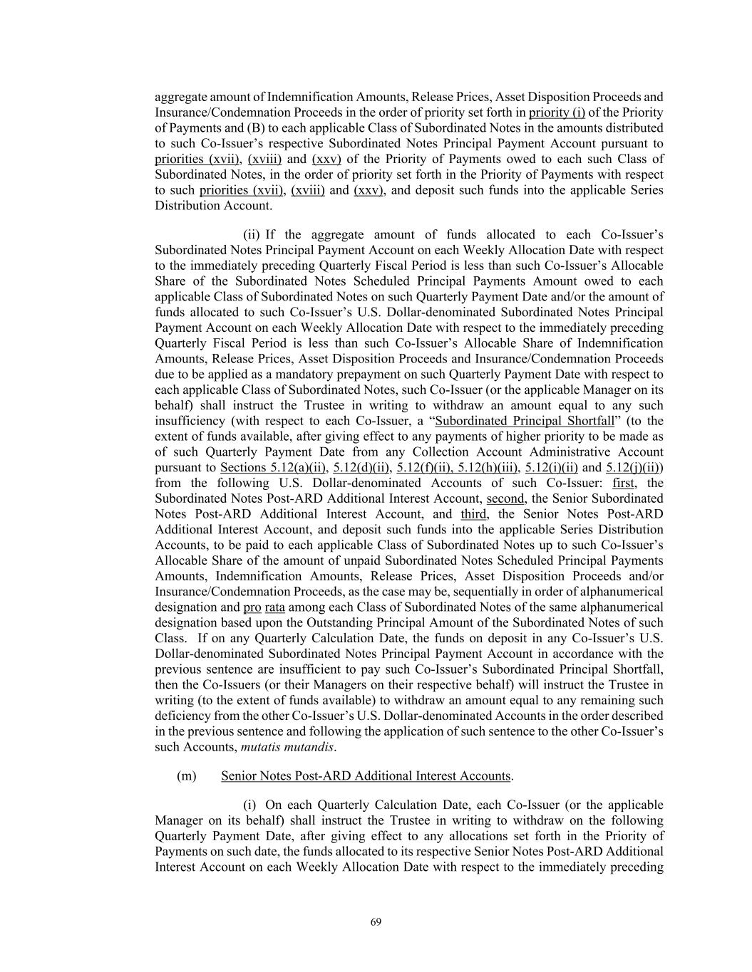 69 aggregate amount of Indemnification Amounts, Release Prices, Asset Disposition Proceeds and Insurance/Condemnation Proceeds in the order of priority set forth in priority (i) of the Priority of Payments and (B) to each applicable Class of Subordinated Notes in the amounts distributed to such Co-Issuer’s respective Subordinated Notes Principal Payment Account pursuant to priorities (xvii), (xviii) and (xxv) of the Priority of Payments owed to each such Class of Subordinated Notes, in the order of priority set forth in the Priority of Payments with respect to such priorities (xvii), (xviii) and (xxv), and deposit such funds into the applicable Series Distribution Account. (ii) If the aggregate amount of funds allocated to each Co-Issuer’s Subordinated Notes Principal Payment Account on each Weekly Allocation Date with respect to the immediately preceding Quarterly Fiscal Period is less than such Co-Issuer’s Allocable Share of the Subordinated Notes Scheduled Principal Payments Amount owed to each applicable Class of Subordinated Notes on such Quarterly Payment Date and/or the amount of funds allocated to such Co-Issuer’s U.S. Dollar-denominated Subordinated Notes Principal Payment Account on each Weekly Allocation Date with respect to the immediately preceding Quarterly Fiscal Period is less than such Co-Issuer’s Allocable Share of Indemnification Amounts, Release Prices, Asset Disposition Proceeds and Insurance/Condemnation Proceeds due to be applied as a mandatory prepayment on such Quarterly Payment Date with respect to each applicable Class of Subordinated Notes, such Co-Issuer (or the applicable Manager on its behalf) shall instruct the Trustee in writing to withdraw an amount equal to any such insufficiency (with respect to each Co-Issuer, a “Subordinated Principal Shortfall” (to the extent of funds available, after giving effect to any payments of higher priority to be made as of such Quarterly Payment Date from any Collection Account Administrative Account pursuant to Sections 5.12(a)(ii), 5.12(d)(ii), 5.12(f)(ii), 5.12(h)(iii), 5.12(i)(ii) and 5.12(j)(ii)) from the following U.S. Dollar-denominated Accounts of such Co-Issuer: first, the Subordinated Notes Post-ARD Additional Interest Account, second, the Senior Subordinated Notes Post-ARD Additional Interest Account, and third, the Senior Notes Post-ARD Additional Interest Account, and deposit such funds into the applicable Series Distribution Accounts, to be paid to each applicable Class of Subordinated Notes up to such Co-Issuer’s Allocable Share of the amount of unpaid Subordinated Notes Scheduled Principal Payments Amounts, Indemnification Amounts, Release Prices, Asset Disposition Proceeds and/or Insurance/Condemnation Proceeds, as the case may be, sequentially in order of alphanumerical designation and pro rata among each Class of Subordinated Notes of the same alphanumerical designation based upon the Outstanding Principal Amount of the Subordinated Notes of such Class. If on any Quarterly Calculation Date, the funds on deposit in any Co-Issuer’s U.S. Dollar-denominated Subordinated Notes Principal Payment Account in accordance with the previous sentence are insufficient to pay such Co-Issuer’s Subordinated Principal Shortfall, then the Co-Issuers (or their Managers on their respective behalf) will instruct the Trustee in writing (to the extent of funds available) to withdraw an amount equal to any remaining such deficiency from the other Co-Issuer’s U.S. Dollar-denominated Accounts in the order described in the previous sentence and following the application of such sentence to the other Co-Issuer’s such Accounts, mutatis mutandis. (m) Senior Notes Post-ARD Additional Interest Accounts. (i) On each Quarterly Calculation Date, each Co-Issuer (or the applicable Manager on its behalf) shall instruct the Trustee in writing to withdraw on the following Quarterly Payment Date, after giving effect to any allocations set forth in the Priority of Payments on such date, the funds allocated to its respective Senior Notes Post-ARD Additional Interest Account on each Weekly Allocation Date with respect to the immediately preceding