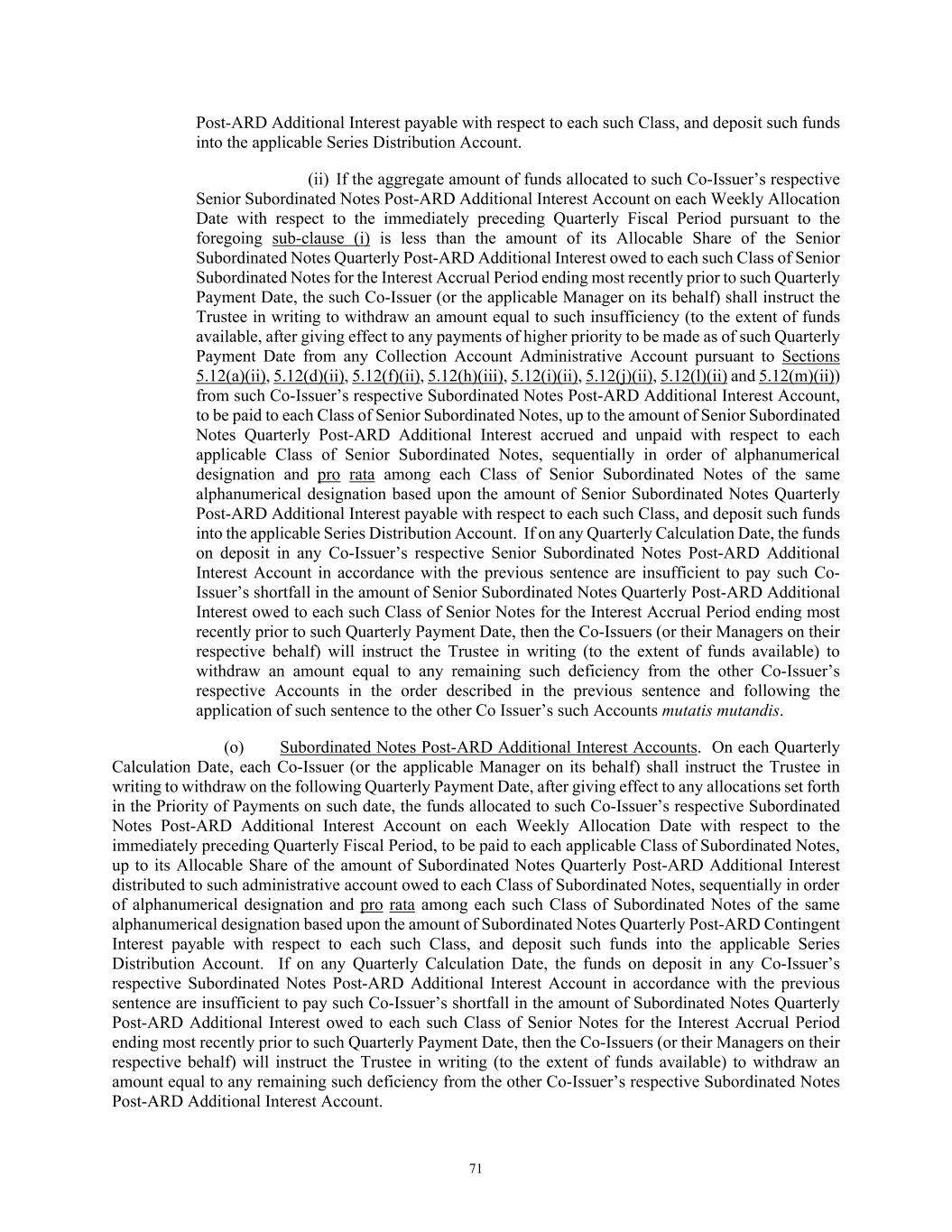 71 Post-ARD Additional Interest payable with respect to each such Class, and deposit such funds into the applicable Series Distribution Account. (ii) If the aggregate amount of funds allocated to such Co-Issuer’s respective Senior Subordinated Notes Post-ARD Additional Interest Account on each Weekly Allocation Date with respect to the immediately preceding Quarterly Fiscal Period pursuant to the foregoing sub-clause (i) is less than the amount of its Allocable Share of the Senior Subordinated Notes Quarterly Post-ARD Additional Interest owed to each such Class of Senior Subordinated Notes for the Interest Accrual Period ending most recently prior to such Quarterly Payment Date, the such Co-Issuer (or the applicable Manager on its behalf) shall instruct the Trustee in writing to withdraw an amount equal to such insufficiency (to the extent of funds available, after giving effect to any payments of higher priority to be made as of such Quarterly Payment Date from any Collection Account Administrative Account pursuant to Sections 5.12(a)(ii), 5.12(d)(ii), 5.12(f)(ii), 5.12(h)(iii), 5.12(i)(ii), 5.12(j)(ii), 5.12(l)(ii) and 5.12(m)(ii)) from such Co-Issuer’s respective Subordinated Notes Post-ARD Additional Interest Account, to be paid to each Class of Senior Subordinated Notes, up to the amount of Senior Subordinated Notes Quarterly Post-ARD Additional Interest accrued and unpaid with respect to each applicable Class of Senior Subordinated Notes, sequentially in order of alphanumerical designation and pro rata among each Class of Senior Subordinated Notes of the same alphanumerical designation based upon the amount of Senior Subordinated Notes Quarterly Post-ARD Additional Interest payable with respect to each such Class, and deposit such funds into the applicable Series Distribution Account. If on any Quarterly Calculation Date, the funds on deposit in any Co-Issuer’s respective Senior Subordinated Notes Post-ARD Additional Interest Account in accordance with the previous sentence are insufficient to pay such Co- Issuer’s shortfall in the amount of Senior Subordinated Notes Quarterly Post-ARD Additional Interest owed to each such Class of Senior Notes for the Interest Accrual Period ending most recently prior to such Quarterly Payment Date, then the Co-Issuers (or their Managers on their respective behalf) will instruct the Trustee in writing (to the extent of funds available) to withdraw an amount equal to any remaining such deficiency from the other Co-Issuer’s respective Accounts in the order described in the previous sentence and following the application of such sentence to the other Co Issuer’s such Accounts mutatis mutandis. (o) Subordinated Notes Post-ARD Additional Interest Accounts. On each Quarterly Calculation Date, each Co-Issuer (or the applicable Manager on its behalf) shall instruct the Trustee in writing to withdraw on the following Quarterly Payment Date, after giving effect to any allocations set forth in the Priority of Payments on such date, the funds allocated to such Co-Issuer’s respective Subordinated Notes Post-ARD Additional Interest Account on each Weekly Allocation Date with respect to the immediately preceding Quarterly Fiscal Period, to be paid to each applicable Class of Subordinated Notes, up to its Allocable Share of the amount of Subordinated Notes Quarterly Post-ARD Additional Interest distributed to such administrative account owed to each Class of Subordinated Notes, sequentially in order of alphanumerical designation and pro rata among each such Class of Subordinated Notes of the same alphanumerical designation based upon the amount of Subordinated Notes Quarterly Post-ARD Contingent Interest payable with respect to each such Class, and deposit such funds into the applicable Series Distribution Account. If on any Quarterly Calculation Date, the funds on deposit in any Co-Issuer’s respective Subordinated Notes Post-ARD Additional Interest Account in accordance with the previous sentence are insufficient to pay such Co-Issuer’s shortfall in the amount of Subordinated Notes Quarterly Post-ARD Additional Interest owed to each such Class of Senior Notes for the Interest Accrual Period ending most recently prior to such Quarterly Payment Date, then the Co-Issuers (or their Managers on their respective behalf) will instruct the Trustee in writing (to the extent of funds available) to withdraw an amount equal to any remaining such deficiency from the other Co-Issuer’s respective Subordinated Notes Post-ARD Additional Interest Account.