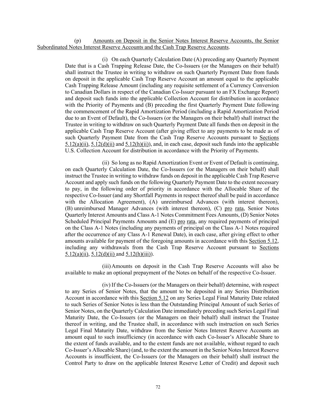 72 (p) Amounts on Deposit in the Senior Notes Interest Reserve Accounts, the Senior Subordinated Notes Interest Reserve Accounts and the Cash Trap Reserve Accounts. (i) On each Quarterly Calculation Date (A) preceding any Quarterly Payment Date that is a Cash Trapping Release Date, the Co-Issuers (or the Managers on their behalf) shall instruct the Trustee in writing to withdraw on such Quarterly Payment Date from funds on deposit in the applicable Cash Trap Reserve Account an amount equal to the applicable Cash Trapping Release Amount (including any requisite settlement of a Currency Conversion to Canadian Dollars in respect of the Canadian Co-Issuer pursuant to an FX Exchange Report) and deposit such funds into the applicable Collection Account for distribution in accordance with the Priority of Payments and (B) preceding the first Quarterly Payment Date following the commencement of the Rapid Amortization Period (including a Rapid Amortization Period due to an Event of Default), the Co-Issuers (or the Managers on their behalf) shall instruct the Trustee in writing to withdraw on such Quarterly Payment Date all funds then on deposit in the applicable Cash Trap Reserve Account (after giving effect to any payments to be made as of such Quarterly Payment Date from the Cash Trap Reserve Accounts pursuant to Sections 5.12(a)(ii), 5.12(d)(ii) and 5.12(h)(ii)), and, in each case, deposit such funds into the applicable U.S. Collection Account for distribution in accordance with the Priority of Payments. (ii) So long as no Rapid Amortization Event or Event of Default is continuing, on each Quarterly Calculation Date, the Co-Issuers (or the Managers on their behalf) shall instruct the Trustee in writing to withdraw funds on deposit in the applicable Cash Trap Reserve Account and apply such funds on the following Quarterly Payment Date to the extent necessary to pay, in the following order of priority in accordance with the Allocable Share of the respective Co-Issuer (and any Shortfall Payments in respect thereof shall be paid in accordance with the Allocation Agreement), (A) unreimbursed Advances (with interest thereon), (B) unreimbursed Manager Advances (with interest thereon), (C) pro rata, Senior Notes Quarterly Interest Amounts and Class A-1 Notes Commitment Fees Amounts, (D) Senior Notes Scheduled Principal Payments Amounts and (E) pro rata, any required payments of principal on the Class A-1 Notes (including any payments of principal on the Class A-1 Notes required after the occurrence of any Class A-1 Renewal Date), in each case, after giving effect to other amounts available for payment of the foregoing amounts in accordance with this Section 5.12, including any withdrawals from the Cash Trap Reserve Account pursuant to Sections 5.12(a)(ii), 5.12(d)(ii) and 5.12(h)(iii)). (iii) Amounts on deposit in the Cash Trap Reserve Accounts will also be available to make an optional prepayment of the Notes on behalf of the respective Co-Issuer. (iv) If the Co-Issuers (or the Managers on their behalf) determine, with respect to any Series of Senior Notes, that the amount to be deposited in any Series Distribution Account in accordance with this Section 5.12 on any Series Legal Final Maturity Date related to such Series of Senior Notes is less than the Outstanding Principal Amount of such Series of Senior Notes, on the Quarterly Calculation Date immediately preceding such Series Legal Final Maturity Date, the Co-Issuers (or the Managers on their behalf) shall instruct the Trustee thereof in writing, and the Trustee shall, in accordance with such instruction on such Series Legal Final Maturity Date, withdraw from the Senior Notes Interest Reserve Accounts an amount equal to such insufficiency (in accordance with each Co-Issuer’s Allocable Share to the extent of funds available, and to the extent funds are not available, without regard to each Co-Issuer’s Allocable Share) (and, to the extent the amount in the Senior Notes Interest Reserve Accounts is insufficient, the Co-Issuers (or the Managers on their behalf) shall instruct the Control Party to draw on the applicable Interest Reserve Letter of Credit) and deposit such