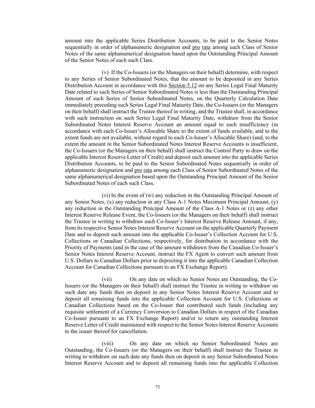 73 amount into the applicable Series Distribution Accounts, to be paid to the Senior Notes sequentially in order of alphanumeric designation and pro rata among each Class of Senior Notes of the same alphanumerical designation based upon the Outstanding Principal Amount of the Senior Notes of each such Class. (v) If the Co-Issuers (or the Managers on their behalf) determine, with respect to any Series of Senior Subordinated Notes, that the amount to be deposited in any Series Distribution Account in accordance with this Section 5.12 on any Series Legal Final Maturity Date related to such Series of Senior Subordinated Notes is less than the Outstanding Principal Amount of such Series of Senior Subordinated Notes, on the Quarterly Calculation Date immediately preceding such Series Legal Final Maturity Date, the Co-Issuers (or the Managers on their behalf) shall instruct the Trustee thereof in writing, and the Trustee shall, in accordance with such instruction on such Series Legal Final Maturity Date, withdraw from the Senior Subordinated Notes Interest Reserve Account an amount equal to such insufficiency (in accordance with each Co-Issuer’s Allocable Share to the extent of funds available, and to the extent funds are not available, without regard to each Co-Issuer’s Allocable Share) (and, to the extent the amount in the Senior Subordinated Notes Interest Reserve Accounts is insufficient, the Co-Issuers (or the Managers on their behalf) shall instruct the Control Party to draw on the applicable Interest Reserve Letter of Credit) and deposit such amount into the applicable Series Distribution Accounts, to be paid to the Senior Subordinated Notes sequentially in order of alphanumeric designation and pro rata among each Class of Senior Subordinated Notes of the same alphanumerical designation based upon the Outstanding Principal Amount of the Senior Subordinated Notes of each such Class. (vi) In the event of (w) any reduction in the Outstanding Principal Amount of any Senior Notes, (x) any reduction in any Class A-1 Notes Maximum Principal Amount, (y) any reduction in the Outstanding Principal Amount of the Class A-1 Notes or (z) any other Interest Reserve Release Event, the Co-Issuers (or the Managers on their behalf) shall instruct the Trustee in writing to withdraw each Co-Issuer’s Interest Reserve Release Amount, if any, from its respective Senior Notes Interest Reserve Account on the applicable Quarterly Payment Date and to deposit such amount into the applicable Co-Issuer’s Collection Account for U.S. Collections or Canadian Collections, respectively, for distribution in accordance with the Priority of Payments (and in the case of the amount withdrawn from the Canadian Co-Issuer’s Senior Notes Interest Reserve Account, instruct the FX Agent to convert such amount from U.S. Dollars to Canadian Dollars prior to depositing it into the applicable Canadian Collection Account for Canadian Collections pursuant to an FX Exchange Report). (vii) On any date on which no Senior Notes are Outstanding, the Co- Issuers (or the Managers on their behalf) shall instruct the Trustee in writing to withdraw on such date any funds then on deposit in any Senior Notes Interest Reserve Account and to deposit all remaining funds into the applicable Collection Account for U.S. Collections or Canadian Collections based on the Co-Issuer that contributed such funds (including any requisite settlement of a Currency Conversion to Canadian Dollars in respect of the Canadian Co-Issuer pursuant to an FX Exchange Report) and/or to return any outstanding Interest Reserve Letter of Credit maintained with respect to the Senior Notes Interest Reserve Accounts to the issuer thereof for cancellation. (viii) On any date on which no Senior Subordinated Notes are Outstanding, the Co-Issuers (or the Managers on their behalf) shall instruct the Trustee in writing to withdraw on such date any funds then on deposit in any Senior Subordinated Notes Interest Reserve Account and to deposit all remaining funds into the applicable Collection