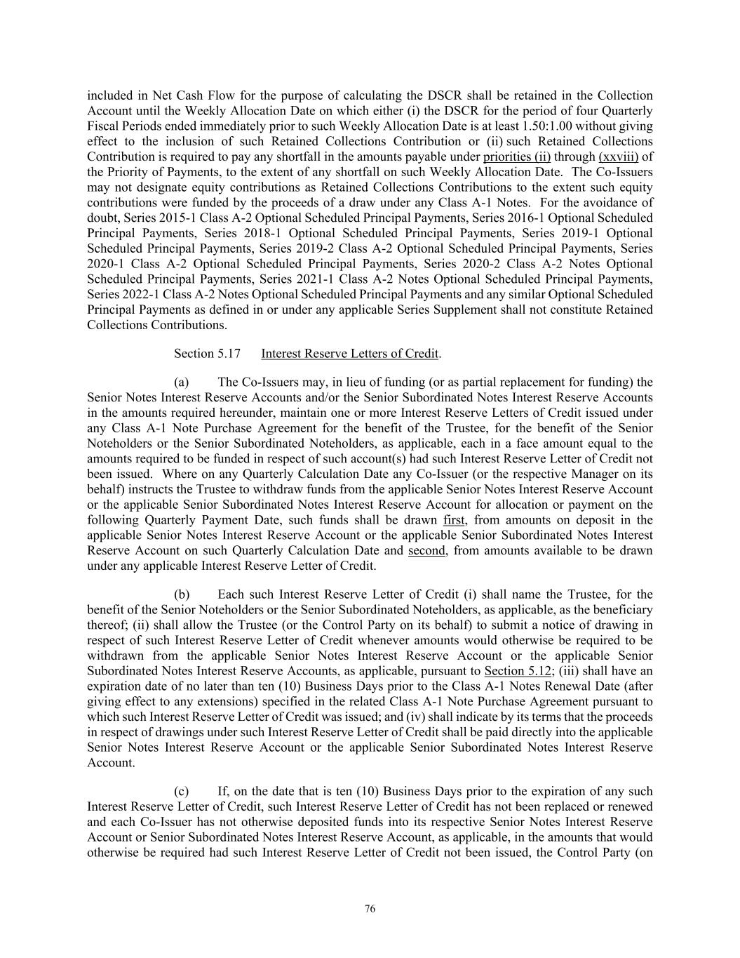 76 included in Net Cash Flow for the purpose of calculating the DSCR shall be retained in the Collection Account until the Weekly Allocation Date on which either (i) the DSCR for the period of four Quarterly Fiscal Periods ended immediately prior to such Weekly Allocation Date is at least 1.50:1.00 without giving effect to the inclusion of such Retained Collections Contribution or (ii) such Retained Collections Contribution is required to pay any shortfall in the amounts payable under priorities (ii) through (xxviii) of the Priority of Payments, to the extent of any shortfall on such Weekly Allocation Date. The Co-Issuers may not designate equity contributions as Retained Collections Contributions to the extent such equity contributions were funded by the proceeds of a draw under any Class A-1 Notes. For the avoidance of doubt, Series 2015-1 Class A-2 Optional Scheduled Principal Payments, Series 2016-1 Optional Scheduled Principal Payments, Series 2018-1 Optional Scheduled Principal Payments, Series 2019-1 Optional Scheduled Principal Payments, Series 2019-2 Class A-2 Optional Scheduled Principal Payments, Series 2020-1 Class A-2 Optional Scheduled Principal Payments, Series 2020-2 Class A-2 Notes Optional Scheduled Principal Payments, Series 2021-1 Class A-2 Notes Optional Scheduled Principal Payments, Series 2022-1 Class A-2 Notes Optional Scheduled Principal Payments and any similar Optional Scheduled Principal Payments as defined in or under any applicable Series Supplement shall not constitute Retained Collections Contributions. Section 5.17 Interest Reserve Letters of Credit. (a) The Co-Issuers may, in lieu of funding (or as partial replacement for funding) the Senior Notes Interest Reserve Accounts and/or the Senior Subordinated Notes Interest Reserve Accounts in the amounts required hereunder, maintain one or more Interest Reserve Letters of Credit issued under any Class A-1 Note Purchase Agreement for the benefit of the Trustee, for the benefit of the Senior Noteholders or the Senior Subordinated Noteholders, as applicable, each in a face amount equal to the amounts required to be funded in respect of such account(s) had such Interest Reserve Letter of Credit not been issued. Where on any Quarterly Calculation Date any Co-Issuer (or the respective Manager on its behalf) instructs the Trustee to withdraw funds from the applicable Senior Notes Interest Reserve Account or the applicable Senior Subordinated Notes Interest Reserve Account for allocation or payment on the following Quarterly Payment Date, such funds shall be drawn first, from amounts on deposit in the applicable Senior Notes Interest Reserve Account or the applicable Senior Subordinated Notes Interest Reserve Account on such Quarterly Calculation Date and second, from amounts available to be drawn under any applicable Interest Reserve Letter of Credit. (b) Each such Interest Reserve Letter of Credit (i) shall name the Trustee, for the benefit of the Senior Noteholders or the Senior Subordinated Noteholders, as applicable, as the beneficiary thereof; (ii) shall allow the Trustee (or the Control Party on its behalf) to submit a notice of drawing in respect of such Interest Reserve Letter of Credit whenever amounts would otherwise be required to be withdrawn from the applicable Senior Notes Interest Reserve Account or the applicable Senior Subordinated Notes Interest Reserve Accounts, as applicable, pursuant to Section 5.12; (iii) shall have an expiration date of no later than ten (10) Business Days prior to the Class A-1 Notes Renewal Date (after giving effect to any extensions) specified in the related Class A-1 Note Purchase Agreement pursuant to which such Interest Reserve Letter of Credit was issued; and (iv) shall indicate by its terms that the proceeds in respect of drawings under such Interest Reserve Letter of Credit shall be paid directly into the applicable Senior Notes Interest Reserve Account or the applicable Senior Subordinated Notes Interest Reserve Account. (c) If, on the date that is ten (10) Business Days prior to the expiration of any such Interest Reserve Letter of Credit, such Interest Reserve Letter of Credit has not been replaced or renewed and each Co-Issuer has not otherwise deposited funds into its respective Senior Notes Interest Reserve Account or Senior Subordinated Notes Interest Reserve Account, as applicable, in the amounts that would otherwise be required had such Interest Reserve Letter of Credit not been issued, the Control Party (on