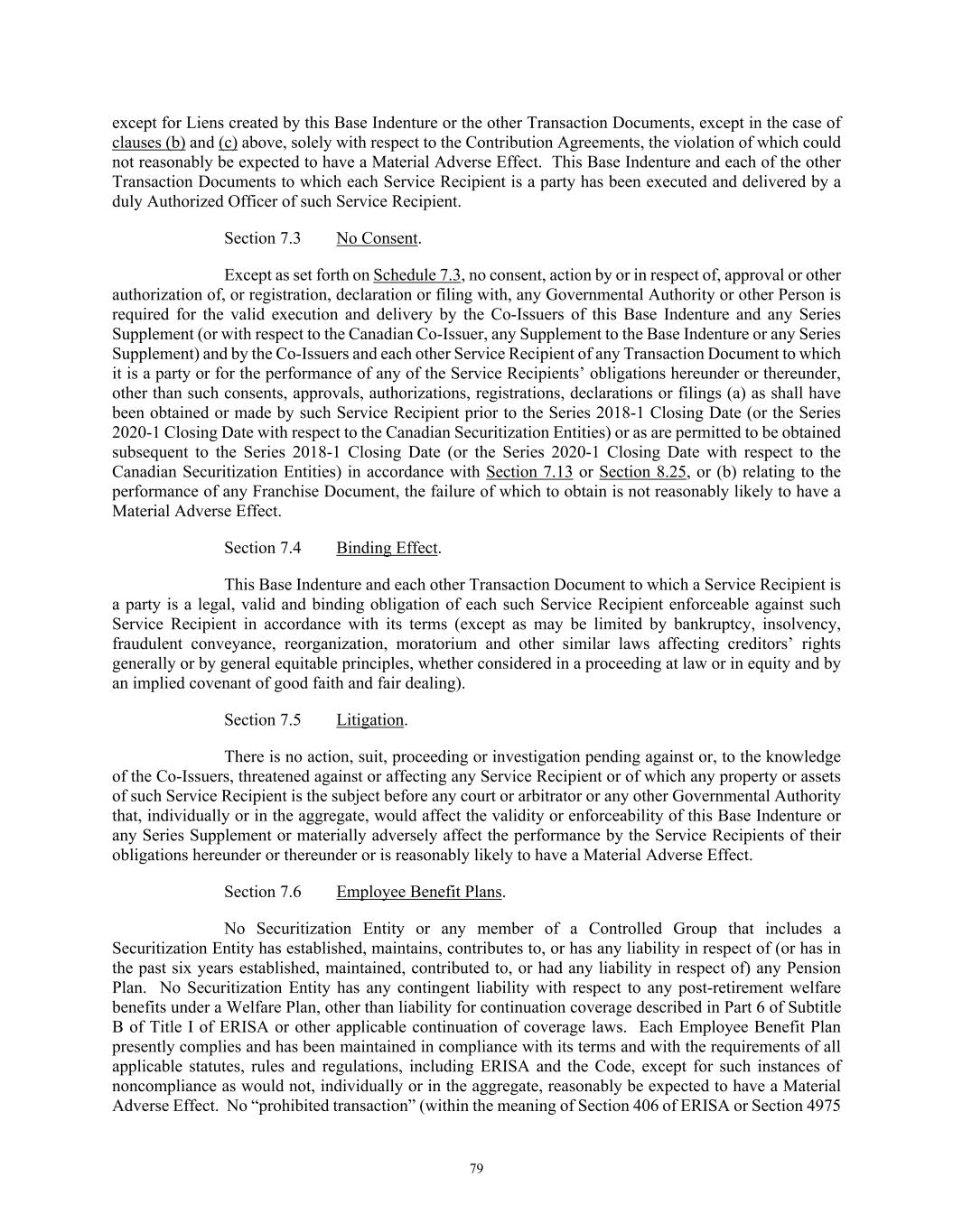 79 except for Liens created by this Base Indenture or the other Transaction Documents, except in the case of clauses (b) and (c) above, solely with respect to the Contribution Agreements, the violation of which could not reasonably be expected to have a Material Adverse Effect. This Base Indenture and each of the other Transaction Documents to which each Service Recipient is a party has been executed and delivered by a duly Authorized Officer of such Service Recipient. Section 7.3 No Consent. Except as set forth on Schedule 7.3, no consent, action by or in respect of, approval or other authorization of, or registration, declaration or filing with, any Governmental Authority or other Person is required for the valid execution and delivery by the Co-Issuers of this Base Indenture and any Series Supplement (or with respect to the Canadian Co-Issuer, any Supplement to the Base Indenture or any Series Supplement) and by the Co-Issuers and each other Service Recipient of any Transaction Document to which it is a party or for the performance of any of the Service Recipients’ obligations hereunder or thereunder, other than such consents, approvals, authorizations, registrations, declarations or filings (a) as shall have been obtained or made by such Service Recipient prior to the Series 2018-1 Closing Date (or the Series 2020-1 Closing Date with respect to the Canadian Securitization Entities) or as are permitted to be obtained subsequent to the Series 2018-1 Closing Date (or the Series 2020-1 Closing Date with respect to the Canadian Securitization Entities) in accordance with Section 7.13 or Section 8.25, or (b) relating to the performance of any Franchise Document, the failure of which to obtain is not reasonably likely to have a Material Adverse Effect. Section 7.4 Binding Effect. This Base Indenture and each other Transaction Document to which a Service Recipient is a party is a legal, valid and binding obligation of each such Service Recipient enforceable against such Service Recipient in accordance with its terms (except as may be limited by bankruptcy, insolvency, fraudulent conveyance, reorganization, moratorium and other similar laws affecting creditors’ rights generally or by general equitable principles, whether considered in a proceeding at law or in equity and by an implied covenant of good faith and fair dealing). Section 7.5 Litigation. There is no action, suit, proceeding or investigation pending against or, to the knowledge of the Co-Issuers, threatened against or affecting any Service Recipient or of which any property or assets of such Service Recipient is the subject before any court or arbitrator or any other Governmental Authority that, individually or in the aggregate, would affect the validity or enforceability of this Base Indenture or any Series Supplement or materially adversely affect the performance by the Service Recipients of their obligations hereunder or thereunder or is reasonably likely to have a Material Adverse Effect. Section 7.6 Employee Benefit Plans. No Securitization Entity or any member of a Controlled Group that includes a Securitization Entity has established, maintains, contributes to, or has any liability in respect of (or has in the past six years established, maintained, contributed to, or had any liability in respect of) any Pension Plan. No Securitization Entity has any contingent liability with respect to any post-retirement welfare benefits under a Welfare Plan, other than liability for continuation coverage described in Part 6 of Subtitle B of Title I of ERISA or other applicable continuation of coverage laws. Each Employee Benefit Plan presently complies and has been maintained in compliance with its terms and with the requirements of all applicable statutes, rules and regulations, including ERISA and the Code, except for such instances of noncompliance as would not, individually or in the aggregate, reasonably be expected to have a Material Adverse Effect. No “prohibited transaction” (within the meaning of Section 406 of ERISA or Section 4975