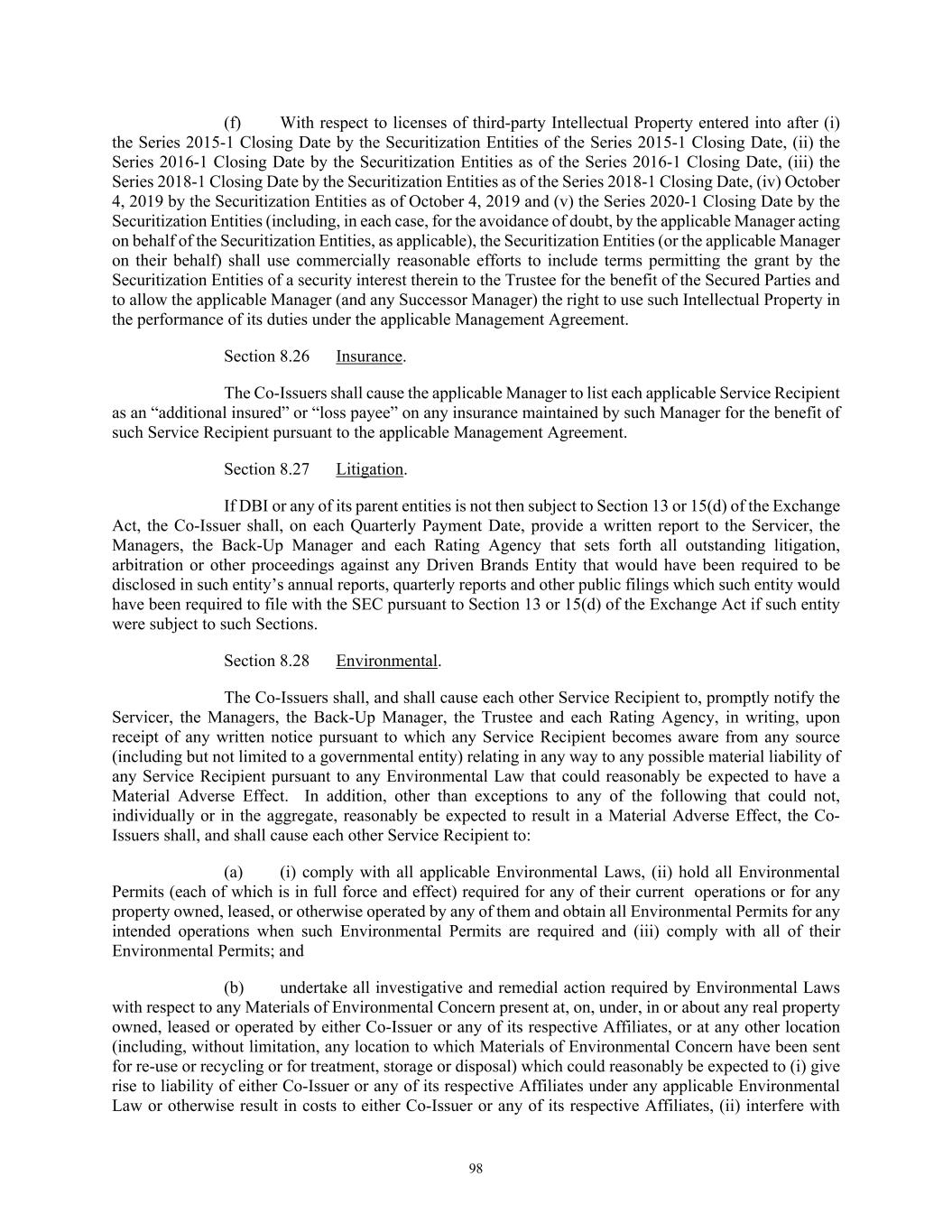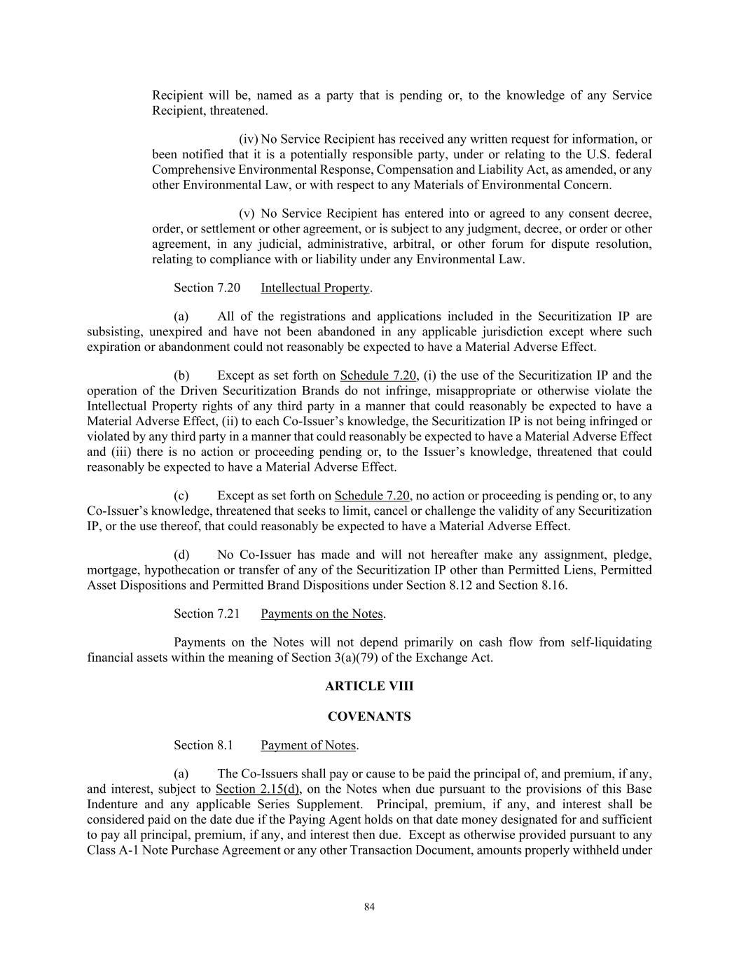84 Recipient will be, named as a party that is pending or, to the knowledge of any Service Recipient, threatened. (iv) No Service Recipient has received any written request for information, or been notified that it is a potentially responsible party, under or relating to the U.S. federal Comprehensive Environmental Response, Compensation and Liability Act, as amended, or any other Environmental Law, or with respect to any Materials of Environmental Concern. (v) No Service Recipient has entered into or agreed to any consent decree, order, or settlement or other agreement, or is subject to any judgment, decree, or order or other agreement, in any judicial, administrative, arbitral, or other forum for dispute resolution, relating to compliance with or liability under any Environmental Law. Section 7.20 Intellectual Property. (a) All of the registrations and applications included in the Securitization IP are subsisting, unexpired and have not been abandoned in any applicable jurisdiction except where such expiration or abandonment could not reasonably be expected to have a Material Adverse Effect. (b) Except as set forth on Schedule 7.20, (i) the use of the Securitization IP and the operation of the Driven Securitization Brands do not infringe, misappropriate or otherwise violate the Intellectual Property rights of any third party in a manner that could reasonably be expected to have a Material Adverse Effect, (ii) to each Co-Issuer’s knowledge, the Securitization IP is not being infringed or violated by any third party in a manner that could reasonably be expected to have a Material Adverse Effect and (iii) there is no action or proceeding pending or, to the Issuer’s knowledge, threatened that could reasonably be expected to have a Material Adverse Effect. (c) Except as set forth on Schedule 7.20, no action or proceeding is pending or, to any Co-Issuer’s knowledge, threatened that seeks to limit, cancel or challenge the validity of any Securitization IP, or the use thereof, that could reasonably be expected to have a Material Adverse Effect. (d) No Co-Issuer has made and will not hereafter make any assignment, pledge, mortgage, hypothecation or transfer of any of the Securitization IP other than Permitted Liens, Permitted Asset Dispositions and Permitted Brand Dispositions under Section 8.12 and Section 8.16. Section 7.21 Payments on the Notes. Payments on the Notes will not depend primarily on cash flow from self-liquidating financial assets within the meaning of Section 3(a)(79) of the Exchange Act. ARTICLE VIII COVENANTS Section 8.1 Payment of Notes. (a) The Co-Issuers shall pay or cause to be paid the principal of, and premium, if any, and interest, subject to Section 2.15(d), on the Notes when due pursuant to the provisions of this Base Indenture and any applicable Series Supplement. Principal, premium, if any, and interest shall be considered paid on the date due if the Paying Agent holds on that date money designated for and sufficient to pay all principal, premium, if any, and interest then due. Except as otherwise provided pursuant to any Class A-1 Note Purchase Agreement or any other Transaction Document, amounts properly withheld under