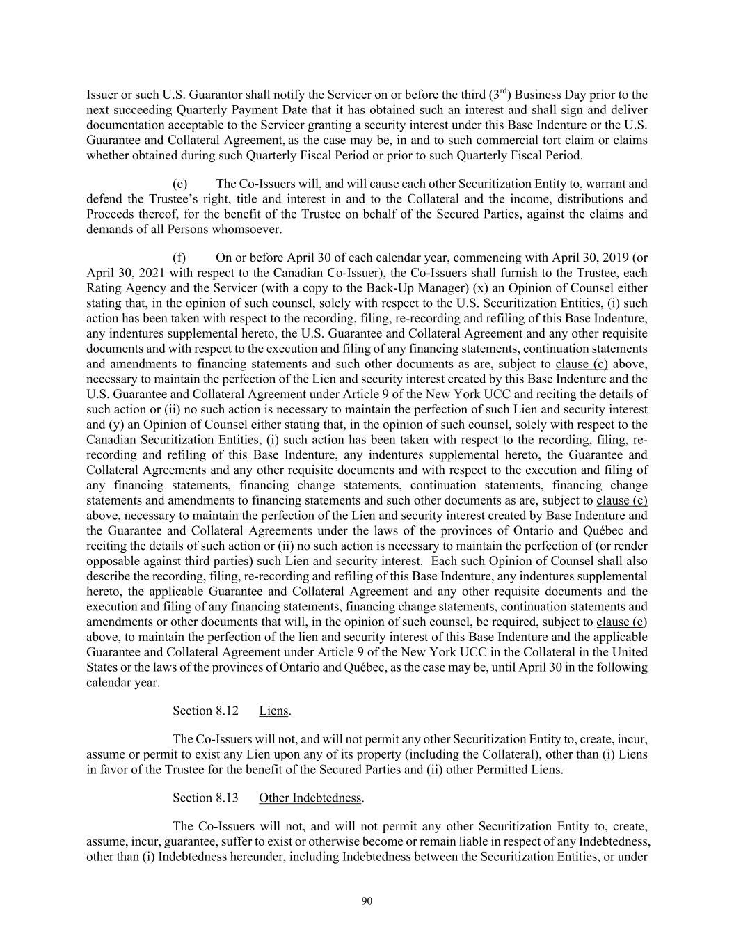 90 Issuer or such U.S. Guarantor shall notify the Servicer on or before the third (3rd) Business Day prior to the next succeeding Quarterly Payment Date that it has obtained such an interest and shall sign and deliver documentation acceptable to the Servicer granting a security interest under this Base Indenture or the U.S. Guarantee and Collateral Agreement, as the case may be, in and to such commercial tort claim or claims whether obtained during such Quarterly Fiscal Period or prior to such Quarterly Fiscal Period. (e) The Co-Issuers will, and will cause each other Securitization Entity to, warrant and defend the Trustee’s right, title and interest in and to the Collateral and the income, distributions and Proceeds thereof, for the benefit of the Trustee on behalf of the Secured Parties, against the claims and demands of all Persons whomsoever. (f) On or before April 30 of each calendar year, commencing with April 30, 2019 (or April 30, 2021 with respect to the Canadian Co-Issuer), the Co-Issuers shall furnish to the Trustee, each Rating Agency and the Servicer (with a copy to the Back-Up Manager) (x) an Opinion of Counsel either stating that, in the opinion of such counsel, solely with respect to the U.S. Securitization Entities, (i) such action has been taken with respect to the recording, filing, re-recording and refiling of this Base Indenture, any indentures supplemental hereto, the U.S. Guarantee and Collateral Agreement and any other requisite documents and with respect to the execution and filing of any financing statements, continuation statements and amendments to financing statements and such other documents as are, subject to clause (c) above, necessary to maintain the perfection of the Lien and security interest created by this Base Indenture and the U.S. Guarantee and Collateral Agreement under Article 9 of the New York UCC and reciting the details of such action or (ii) no such action is necessary to maintain the perfection of such Lien and security interest and (y) an Opinion of Counsel either stating that, in the opinion of such counsel, solely with respect to the Canadian Securitization Entities, (i) such action has been taken with respect to the recording, filing, re- recording and refiling of this Base Indenture, any indentures supplemental hereto, the Guarantee and Collateral Agreements and any other requisite documents and with respect to the execution and filing of any financing statements, financing change statements, continuation statements, financing change statements and amendments to financing statements and such other documents as are, subject to clause (c) above, necessary to maintain the perfection of the Lien and security interest created by Base Indenture and the Guarantee and Collateral Agreements under the laws of the provinces of Ontario and Québec and reciting the details of such action or (ii) no such action is necessary to maintain the perfection of (or render opposable against third parties) such Lien and security interest. Each such Opinion of Counsel shall also describe the recording, filing, re-recording and refiling of this Base Indenture, any indentures supplemental hereto, the applicable Guarantee and Collateral Agreement and any other requisite documents and the execution and filing of any financing statements, financing change statements, continuation statements and amendments or other documents that will, in the opinion of such counsel, be required, subject to clause (c) above, to maintain the perfection of the lien and security interest of this Base Indenture and the applicable Guarantee and Collateral Agreement under Article 9 of the New York UCC in the Collateral in the United States or the laws of the provinces of Ontario and Québec, as the case may be, until April 30 in the following calendar year. Section 8.12 Liens. The Co-Issuers will not, and will not permit any other Securitization Entity to, create, incur, assume or permit to exist any Lien upon any of its property (including the Collateral), other than (i) Liens in favor of the Trustee for the benefit of the Secured Parties and (ii) other Permitted Liens. Section 8.13 Other Indebtedness. The Co-Issuers will not, and will not permit any other Securitization Entity to, create, assume, incur, guarantee, suffer to exist or otherwise become or remain liable in respect of any Indebtedness, other than (i) Indebtedness hereunder, including Indebtedness between the Securitization Entities, or under