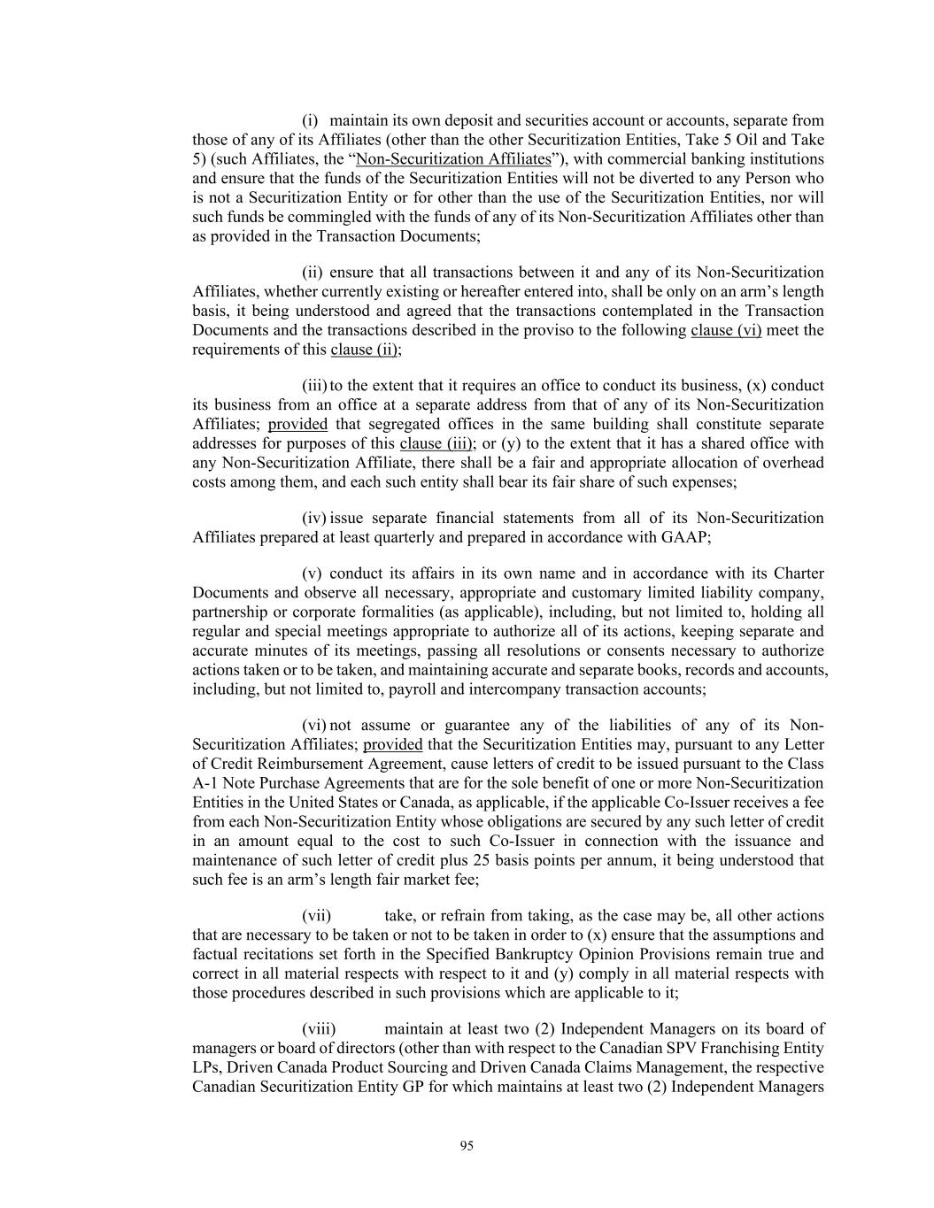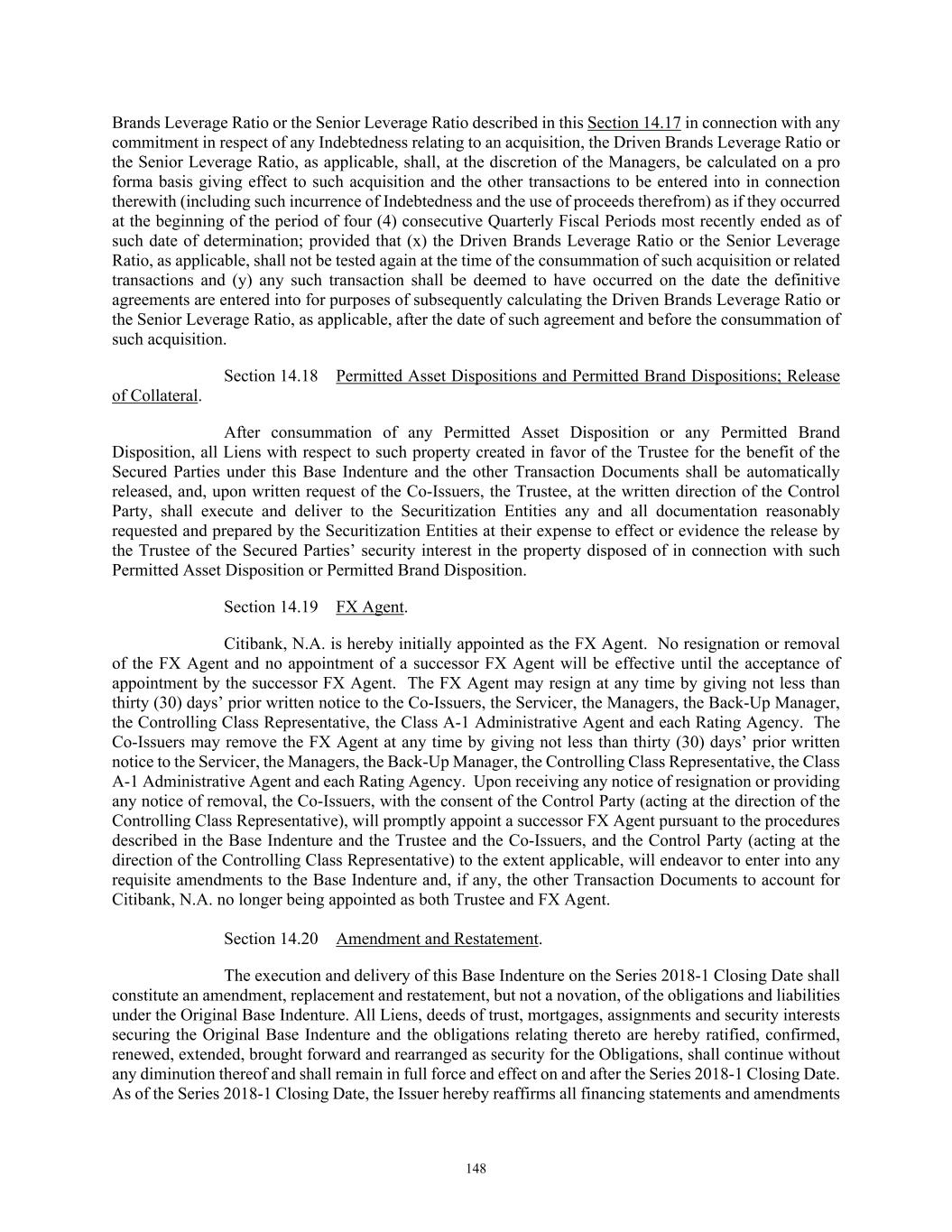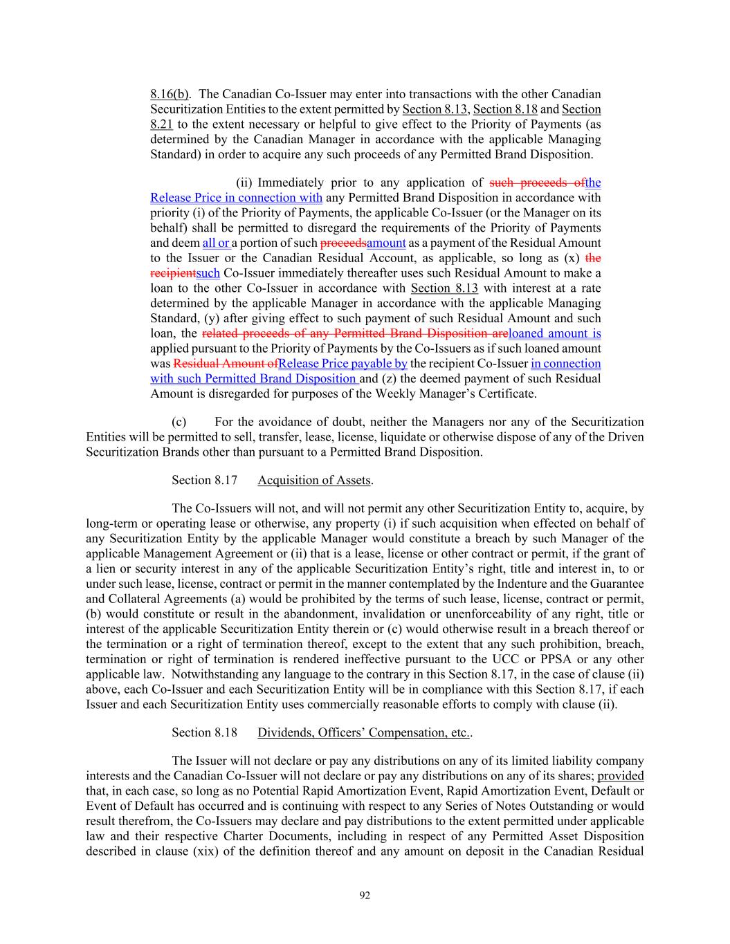 92 8.16(b). The Canadian Co-Issuer may enter into transactions with the other Canadian Securitization Entities to the extent permitted by Section 8.13, Section 8.18 and Section 8.21 to the extent necessary or helpful to give effect to the Priority of Payments (as determined by the Canadian Manager in accordance with the applicable Managing Standard) in order to acquire any such proceeds of any Permitted Brand Disposition. (ii) Immediately prior to any application of such proceeds ofthe Release Price in connection with any Permitted Brand Disposition in accordance with priority (i) of the Priority of Payments, the applicable Co-Issuer (or the Manager on its behalf) shall be permitted to disregard the requirements of the Priority of Payments and deem all or a portion of such proceedsamount as a payment of the Residual Amount to the Issuer or the Canadian Residual Account, as applicable, so long as (x) the recipientsuch Co-Issuer immediately thereafter uses such Residual Amount to make a loan to the other Co-Issuer in accordance with Section 8.13 with interest at a rate determined by the applicable Manager in accordance with the applicable Managing Standard, (y) after giving effect to such payment of such Residual Amount and such loan, the related proceeds of any Permitted Brand Disposition areloaned amount is applied pursuant to the Priority of Payments by the Co-Issuers as if such loaned amount was Residual Amount ofRelease Price payable by the recipient Co-Issuer in connection with such Permitted Brand Disposition and (z) the deemed payment of such Residual Amount is disregarded for purposes of the Weekly Manager’s Certificate. (c) For the avoidance of doubt, neither the Managers nor any of the Securitization Entities will be permitted to sell, transfer, lease, license, liquidate or otherwise dispose of any of the Driven Securitization Brands other than pursuant to a Permitted Brand Disposition. Section 8.17 Acquisition of Assets. The Co-Issuers will not, and will not permit any other Securitization Entity to, acquire, by long-term or operating lease or otherwise, any property (i) if such acquisition when effected on behalf of any Securitization Entity by the applicable Manager would constitute a breach by such Manager of the applicable Management Agreement or (ii) that is a lease, license or other contract or permit, if the grant of a lien or security interest in any of the applicable Securitization Entity’s right, title and interest in, to or under such lease, license, contract or permit in the manner contemplated by the Indenture and the Guarantee and Collateral Agreements (a) would be prohibited by the terms of such lease, license, contract or permit, (b) would constitute or result in the abandonment, invalidation or unenforceability of any right, title or interest of the applicable Securitization Entity therein or (c) would otherwise result in a breach thereof or the termination or a right of termination thereof, except to the extent that any such prohibition, breach, termination or right of termination is rendered ineffective pursuant to the UCC or PPSA or any other applicable law. Notwithstanding any language to the contrary in this Section 8.17, in the case of clause (ii) above, each Co-Issuer and each Securitization Entity will be in compliance with this Section 8.17, if each Issuer and each Securitization Entity uses commercially reasonable efforts to comply with clause (ii). Section 8.18 Dividends, Officers’ Compensation, etc.. The Issuer will not declare or pay any distributions on any of its limited liability company interests and the Canadian Co-Issuer will not declare or pay any distributions on any of its shares; provided that, in each case, so long as no Potential Rapid Amortization Event, Rapid Amortization Event, Default or Event of Default has occurred and is continuing with respect to any Series of Notes Outstanding or would result therefrom, the Co-Issuers may declare and pay distributions to the extent permitted under applicable law and their respective Charter Documents, including in respect of any Permitted Asset Disposition described in clause (xix) of the definition thereof and any amount on deposit in the Canadian Residual