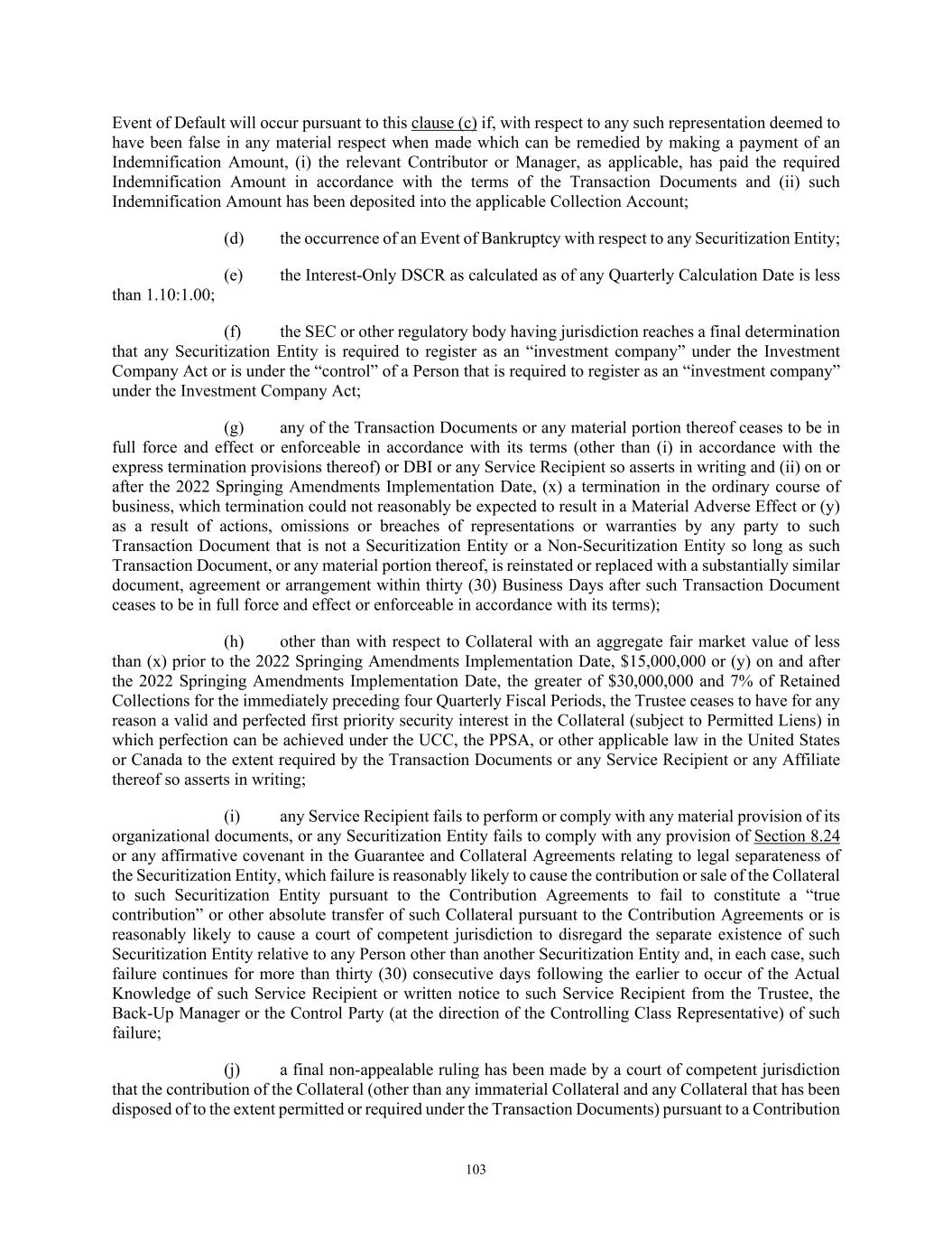 88 of the Transaction Documents to the extent that all affected Noteholders have provided consent, either directly or indirectly through the purchase of Notes that include such terms. In addition, notwithstanding anything to the contrary herein or in any other Transaction Document, at any time on and after the 2021 Springing Amendments Implementation Date, the Servicing Agreement, the Back-Up Management Agreement and the other Transaction Documents (other than the Indenture Documents) may be amended, amended and restated, supplemented or otherwise modified by the parties thereto, or the applicable Securitization Entities, the Managers, the Trustee and any other applicable party may enter into new Transaction Documents without the consent of the Control Party, the Servicer, the Back-Up Manager (except to the extent that such amendment, restatement, supplement, modification or new Transaction Document impacts the rights, indemnities, remedies, immunities, protections, liabilities, duties and/or obligations of the Control Party, the Servicer or the Back-Up Manager, in which case the consent of the Control Party, the Servicer or the Back-Up Manager, as applicable, shall be required to the extent that the Control Party, the Servicer or the Back-Up Manager, as applicable, shall continue to act as Control Party, Servicer or Back-Up Manager, as applicable, following the execution of any such amendment, restatement, supplement, modification or new Transaction Document, or to the extent any such party is no longer acting in its capacity as Control Party, Servicer or Back-Up Manager but such parties’ rights, indemnification, remedies, immunities, protections, liabilities, duties or obligations expressly survive), the Controlling Class Representative, or any Noteholder, for the purpose of modifying, replacing or subdividing the role of the Servicer, the Back-Up Manager, the Control Party or the Controlling Class Representative; provided that, Rating Agency Confirmation shall be required for any change in respect of any of such parties’ obligation(s) to make Advances. (e) Upon the occurrence of a Manager Termination Event under a Management Agreement, (i) the applicable Co-Issuer will not, nor will it permit any other applicable Service Recipient to, without the prior written consent of the Control Party, terminate the applicable Manager and appoint any Successor Manager in accordance with such Management Agreement and (ii) the applicable Co-Issuer will, and will cause each other applicable Service Recipient to, terminate the applicable Manager and appoint one or more Successor Managers in accordance with such Management Agreement if and when so directed by the Control Party. Section 8.8 Notice of Defaults and Other Events. Promptly (and in any event within two (2) Business Days) upon becoming aware of (i) any Potential Rapid Amortization Event, (ii) any Rapid Amortization Event, (iii) any Potential Manager Termination Event, (iv) any Manager Termination Event, (v) any Default, (vi) any Event of Default or (vii) any other default under any other Transaction Document, the applicable Co-Issuer shall give the Trustee, the Servicer, the Control Party, the Managers, the Back-Up Manager, the Controlling Class Representative and each Rating Agency with respect to each Series of Notes Outstanding notice thereof, together with an Officers’ Certificate setting forth the details thereof and any action with respect thereto taken or contemplated to be taken by the such Co-Issuer. The Co-Issuers shall, at their expense, promptly provide to the Servicer, the Managers, the Back-Up Manager, the Controlling Class Representative and the Trustee such additional information as the Servicer, the Managers, the Back-Up Manager, the Controlling Class Representative or the Trustee may reasonably request from time to time in connection with the matters so reported, and the actions so taken or contemplated to be taken. Section 8.9 Notice of Material Proceedings. Without limiting Section 8.27 or Section 8.25(b), promptly (and in any event within five (5) Business Days) upon the determination by either the Chief Financial Officer or the General Counsel of DBI that the commencement or existence of any litigation, arbitration or other proceeding with respect to