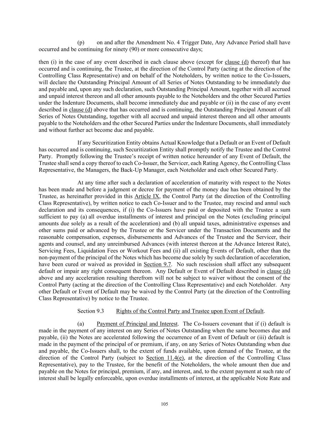 62 amount of interest shall accrue on the Senior Notes Interest Shortfall Amount for each subsequent Interest Accrual Period at the applicable Note Rate until the Senior Notes Interest Shortfall Amount is paid in full. (c) Debt Service Advances. If the Senior Notes Interest Shortfall Amount as determined on any Quarterly Calculation Date pursuant to Section 5.12(b) is greater than zero, in accordance with the terms and conditions of the Servicing Agreement, by 3:00 p.m. (New York City time) on the Business Day preceding such Quarterly Payment Date, the Servicer shall make a Debt Service Advance in such amount unless the Servicer notifies the Co-Issuers, the Managers, the Back-Up Manager and the Trustee by such time that it has, reasonably and in good faith, determined such Debt Service Advance (and interest thereon) is a Nonrecoverable Advance or, on or after the 2021 Springing Amendments Implementation Date, the Managers elect to eliminate the obligation of the Servicer and/or the Trustee to provide Advances upon satisfaction of the Rating Agency Condition or an Advance Suspension Period is then in effect. If the Servicer fails to make such Debt Service Advance (unless the Servicer has, reasonably and in good faith, determined that such Debt Service Advance (and interest thereon) would be a Nonrecoverable Advance), pursuant to Section 10.1(l), the Trustee shall make the Debt Service Advance unless it determines that such Debt Service Advance (and interest thereon) is a Nonrecoverable Advance or, on or after the 2021 Springing Amendments Implementation Date, the Managers elect to eliminate the obligation of the Servicer and/or the Trustee to provide Advances upon satisfaction of the Rating Agency Condition or an Advance Suspension Period is then in effect. In determining whether any Debt Service Advance (and interest thereon) is a Nonrecoverable Advance, the Trustee may conclusively rely on the determination of the Servicer. All Debt Service Advances shall be deposited into the Senior Notes Interest Payment Account of the applicable Co-Issuer. (d) Class A-1 Notes Commitment Fees Accounts. On each Quarterly Calculation Date, each Co-Issuer (or the applicable Manager on its behalf) shall instruct the Trustee in writing on the following Quarterly Payment Date, after giving effect to any allocations set forth in the Priority of Payments on such date, (i) to withdraw the funds allocated to its respective U.S. Dollar-denominated Class A-1 Notes Commitment Fees Account on each Weekly Allocation Date with respect to the immediately preceding Quarterly Fiscal Period to be paid to the applicable Class A-1 Notes, up to its Allocable Share of the Class A-1 Notes Commitment Fees Amount accrued and unpaid with respect to the applicable Class A-1 Notes, pro rata among each Series of Class A-1 Notes based upon such Allocable Share of the Class A-1 Notes Commitment Fees Amount payable with respect to each such Series, and deposit such funds into the applicable Series Distribution Account and (ii) if the amount of funds allocated to such Co-Issuer’s respective U.S. Dollar-denominated Class A-1 Notes Commitment Fees Account referred to in the foregoing sub-clause (i) with respect to the immediately preceding Quarterly Fiscal Period is less than its Allocable Share of the accrued and unpaid Class A-1 Notes Commitment Fees Amount for the Interest Accrual Period ending most recently prior to such Quarterly Payment Date, to withdraw an amount equal to such insufficiency (with respect to each Co-Issuer, a “Commitment Fees Shortfall”) (to the extent of funds available and pro rata with any Senior Interest Shortfall of such Co-Issuer) from the following U.S. Dollar-denominated Accounts of such Co-Issuer: first, the Subordinated Notes Post-ARD Additional Interest Account, second, the Senior Subordinated Notes Post-ARD Additional Interest Account, third, the Senior Notes Post-ARD Additional Interest Account, fourth, the Subordinated Notes Principal Payment Account, fifth, the Subordinated Notes Interest Payment Account, sixth, the Senior Subordinated Notes Principal Payment Account, seventh, the Cash Trap Reserve Account, eighth, the Senior Subordinated Notes Interest Payment Account, ninth the Senior Notes Principal Payment Account, and tenth the Senior Notes Interest Payment Account, to be paid to the Class A-1 Notes, up to the accrued and unpaid Class A- 1 Notes Commitment Fees Amount of such Co-Issuer, pro rata among each Series of Class A-1 Notes based upon the Class A-1 Notes Commitment Fees Amount of such Co-Issuer payable with respect to each such Series, and deposit such funds into the applicable Series Distribution Account. On each Quarterly Payment Date, the funds on deposit in such Co-Issuer’s Senior Notes Interest Reserve Account (or, if the funds on deposit in such Senior Notes Interest Reserve Account are insufficient for such purpose, funds available to