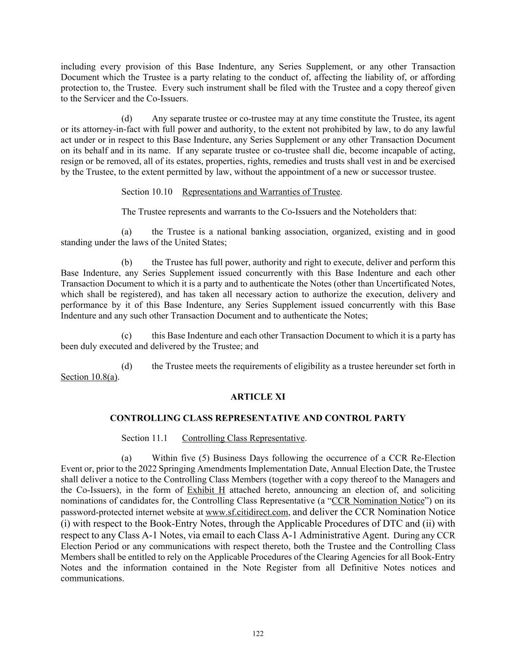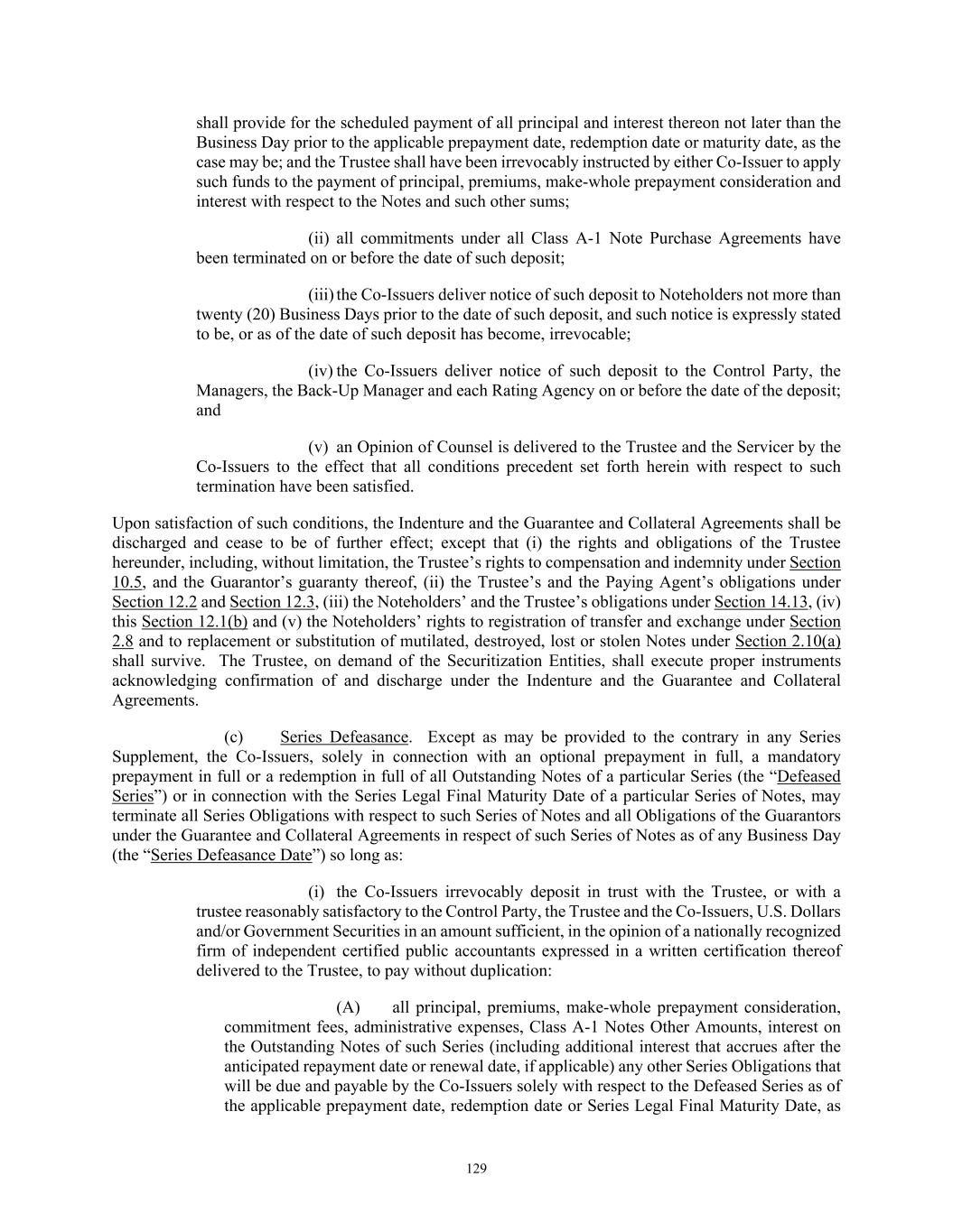 4 (b) With respect to the Series 2019-3 Class A-1 Note Purchase Agreement, the Series 2022-1 Class A-1 Note Purchase Agreement and any other Class A-1 Note Purchase Agreement entered into by the Co-Issuers in connection with the issuance of any Class A-1 Notes, whether or not any of the following shall have been specifically provided for in the applicable provision of the Indenture Documents, the following shall be true (except to the extent that the Series Supplement with respect to such Class of Notes or such Class A-1 Note Purchase Agreement provides otherwise): (i) for purposes of any provision of any Indenture Document relating to any vote, consent, direction, waiver or the like to be given by such Class on any date, with respect to the related Class A-1 Notes Outstanding, the relevant principal amount of such Class A-1 Notes to be used in tabulating the percentage of such Class voting, consenting, directing, waiving or the like will be deemed to be the related Class A-1 Notes Voting Amount; (ii) for purposes of any provisions of any Indenture Document relating to termination, discharge or the like, such Class shall continue to be deemed Outstanding unless and until all commitments to extend credit under such Class A-1 Note Purchase Agreement have been terminated thereunder and the Outstanding Principal Amount of such Class shall have been reduced to zero; and (iii) notwithstanding the foregoing, and for the avoidance of doubt, a Series Supplement or such Class A-1 Note Purchase Agreement may provide for different treatment of commitments of a Noteholder of a Class A-1 Note subject to such Series Supplement or such Class A-1 Note Purchase Agreement that has failed to make a payment required to be made by it under the terms of such Class A-1 Note Purchase Agreement, that has provided written notification that it does not intend to make a payment required to be made by it thereunder when due or that has become the subject of an Event of Bankruptcy. Section 2.2 Notes Issuable in Series. (a) The Notes may be issued in one or more Series. Each Series of Notes shall be created by a Series Supplement. Any series of Class A-1 Notes may be uncertificated if provided for in the related Series Supplement. (b) So long as each of the certifications described in clause (iii)(I) and clause (vi) below are true and correct as of the applicable Series Closing Date, Notes of a new Series may from time to time be executed by the Co-Issuers and delivered to the Trustee for authentication and thereupon the same shall be authenticated and delivered by the Trustee (or with respect to Uncertificated Notes, registered) upon the receipt by the Trustee of a Company Request at least five (5) Business Days (except in the case of the issuance of the Series of Notes on the Series 2015-1 Closing Date or in connection with a Series Refinancing Event) in advance of the related Series Closing Date (which Company Request will be revocable by the Co-Issuers upon notice to the Trustee no later than 5:00 p.m. (New York City time) two (2) Business Days prior to the related Series Closing Date) and upon performance or delivery by the Co- Issuers to the Trustee and the Control Party, and receipt by the Trustee and the Control Party, of the following: (i) a Company Order authorizing and directing the authentication and delivery (or with respect to Uncertificated Notes, registration) of the Notes of such new Series by the Trustee and specifying the designation of such new Series, the Initial Principal Amount (or the method for calculating the Initial Principal Amount) of such new Series to be authenticated and the Note Rate with respect to such new Series;