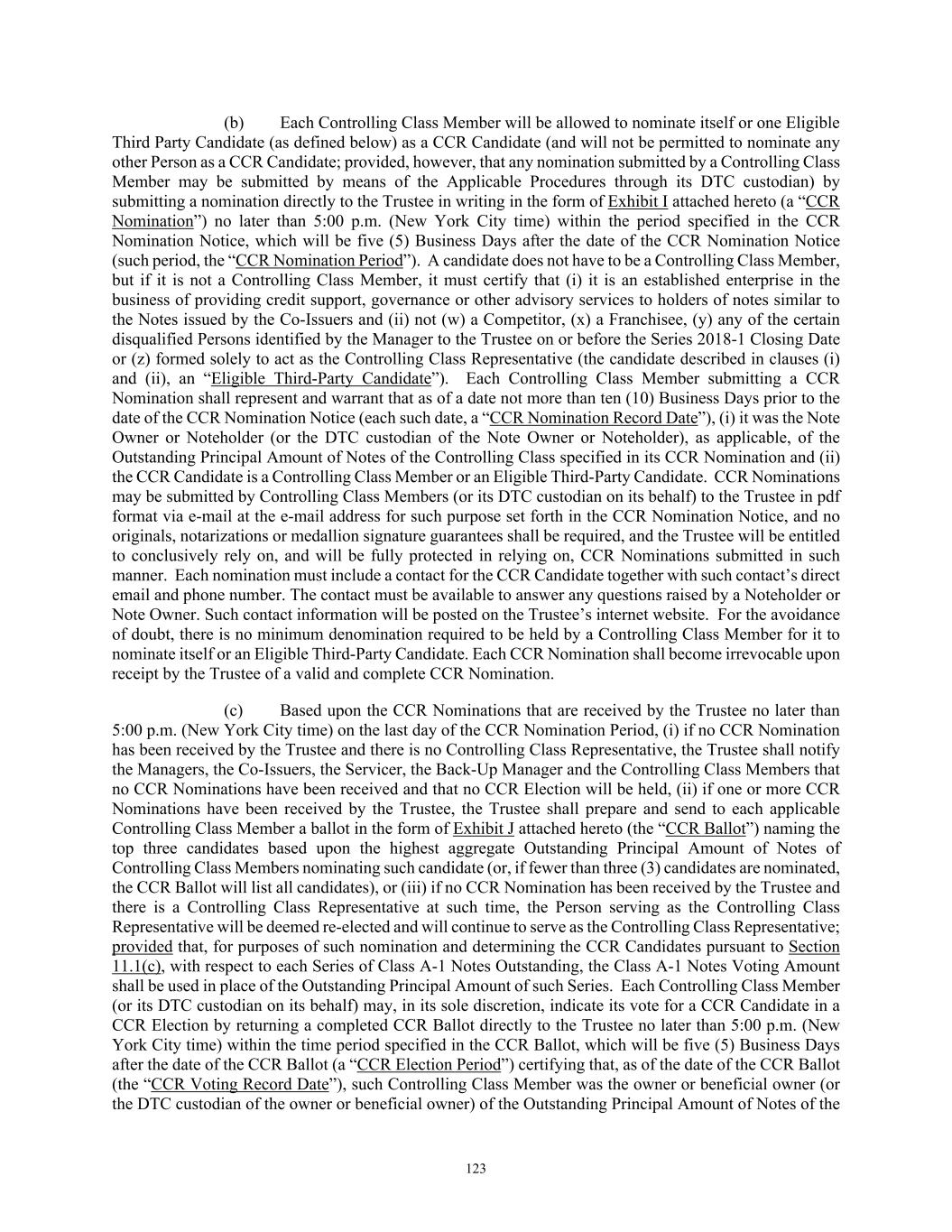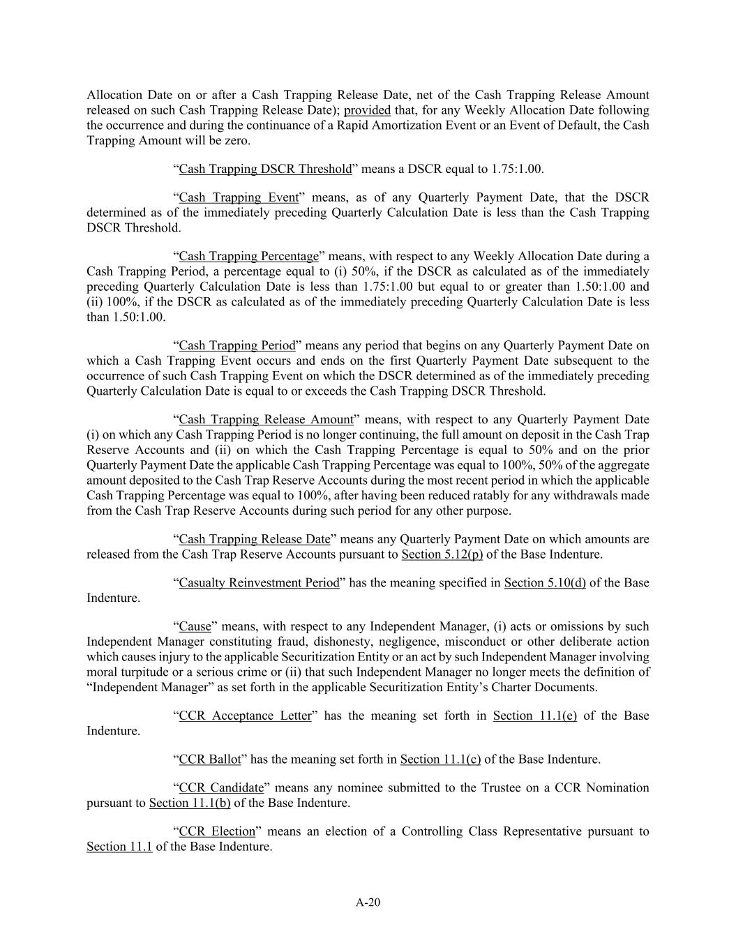 A-20 Allocation Date on or after a Cash Trapping Release Date, net of the Cash Trapping Release Amount released on such Cash Trapping Release Date); provided that, for any Weekly Allocation Date following the occurrence and during the continuance of a Rapid Amortization Event or an Event of Default, the Cash Trapping Amount will be zero. “Cash Trapping DSCR Threshold” means a DSCR equal to 1.75:1.00. “Cash Trapping Event” means, as of any Quarterly Payment Date, that the DSCR determined as of the immediately preceding Quarterly Calculation Date is less than the Cash Trapping DSCR Threshold. “Cash Trapping Percentage” means, with respect to any Weekly Allocation Date during a Cash Trapping Period, a percentage equal to (i) 50%, if the DSCR as calculated as of the immediately preceding Quarterly Calculation Date is less than 1.75:1.00 but equal to or greater than 1.50:1.00 and (ii) 100%, if the DSCR as calculated as of the immediately preceding Quarterly Calculation Date is less than 1.50:1.00. “Cash Trapping Period” means any period that begins on any Quarterly Payment Date on which a Cash Trapping Event occurs and ends on the first Quarterly Payment Date subsequent to the occurrence of such Cash Trapping Event on which the DSCR determined as of the immediately preceding Quarterly Calculation Date is equal to or exceeds the Cash Trapping DSCR Threshold. “Cash Trapping Release Amount” means, with respect to any Quarterly Payment Date (i) on which any Cash Trapping Period is no longer continuing, the full amount on deposit in the Cash Trap Reserve Accounts and (ii) on which the Cash Trapping Percentage is equal to 50% and on the prior Quarterly Payment Date the applicable Cash Trapping Percentage was equal to 100%, 50% of the aggregate amount deposited to the Cash Trap Reserve Accounts during the most recent period in which the applicable Cash Trapping Percentage was equal to 100%, after having been reduced ratably for any withdrawals made from the Cash Trap Reserve Accounts during such period for any other purpose. “Cash Trapping Release Date” means any Quarterly Payment Date on which amounts are released from the Cash Trap Reserve Accounts pursuant to Section 5.12(p) of the Base Indenture. “Casualty Reinvestment Period” has the meaning specified in Section 5.10(d) of the Base Indenture. “Cause” means, with respect to any Independent Manager, (i) acts or omissions by such Independent Manager constituting fraud, dishonesty, negligence, misconduct or other deliberate action which causes injury to the applicable Securitization Entity or an act by such Independent Manager involving moral turpitude or a serious crime or (ii) that such Independent Manager no longer meets the definition of “Independent Manager” as set forth in the applicable Securitization Entity’s Charter Documents. “CCR Acceptance Letter” has the meaning set forth in Section 11.1(e) of the Base Indenture. “CCR Ballot” has the meaning set forth in Section 11.1(c) of the Base Indenture. “CCR Candidate” means any nominee submitted to the Trustee on a CCR Nomination pursuant to Section 11.1(b) of the Base Indenture. “CCR Election” means an election of a Controlling Class Representative pursuant to Section 11.1 of the Base Indenture.