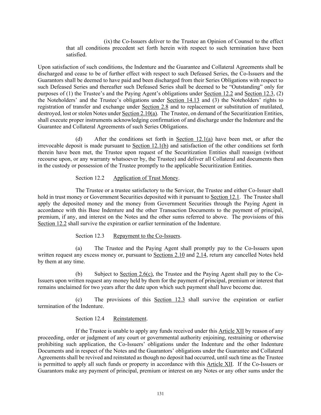 85 the Code, the Tax Act or any applicable federal, state, provincial, territorial, local or foreign law by any Person from a payment to any Noteholder of interest or principal or premium, if any, shall be considered as having been paid by the Issuer to such Noteholder for all purposes of the Indenture and the Notes. (b) By acceptance of its Notes, each Noteholder agrees that the failure to provide the Paying Agent with appropriate tax certifications (which includes (i) an Internal Revenue Service Form W-9 for United States persons (as defined under Section 7701(a)(30) of the Code), or any applicable successor form, or (ii) an applicable Internal Revenue Service Form W-8 for Persons other than United States persons, or any applicable successor form) may result in amounts being withheld from payments to such Noteholder under this Base Indenture and any Series Supplement and that amounts withheld pursuant to applicable laws shall be considered as having been paid by the Co-Issuers as provided in the foregoing clause (a). Section 8.2 Maintenance of Office or Agency. (a) The Co-Issuers will maintain an office or agency (which may be an office of the Trustee, the Registrar or co-registrar) where Notes may be surrendered for registration of transfer or exchange (or de-registration), where notices and demands to or upon the Co-Issuers in respect of the Notes and the Indenture may be served, and where, at any time when the Co-Issuers are obligated to make a payment of principal of, and premium, if any, on the Notes, the Notes may be surrendered for payment (or de-registered). The Co-Issuers will give prompt written notice to the Trustee and the Servicer of the location, and any change in the location, of such office or agency. If at any time the Co-Issuers shall fail to maintain any such required office or agency or shall fail to furnish the Trustee and the Servicer with the address thereof, such presentations and surrenders (or de-registrations) may be made or served at the Corporate Trust Office and notices and demands may be made at the address set forth in Section 14.1 hereof. (b) The Co-Issuers may also from time to time designate one or more other offices or agencies where the Notes may be presented or surrendered (or de-registered) for any or all such purposes and may from time to time rescind such designations. The Co-Issuers will give prompt written notice to the Trustee and the Servicer of any such designation or rescission and of any change in the location of any such other office or agency. The Co-Issuers hereby designate the Corporate Trust Office as one such office or agency of the Co-Issuers. Section 8.3 Payment and Performance of Obligations. The Co-Issuers will, and will cause each other Service Recipient to, pay and discharge and fully perform, at or before maturity, all of their respective material obligations and liabilities, including, without limitation, Tax liabilities and other governmental claims levied or imposed upon any Service Recipient or upon the income, properties or operations of any Service Recipient, judgments, settlement agreements and all obligations of each Service Recipient under the Collateral Documents, except where the same may be contested in good faith by appropriate proceedings (and without derogation from the material obligations of the Co-Issuers hereunder and the Guarantors under the Guarantee and Collateral Agreements regarding the protection of the Collateral from Liens (other than Permitted Liens)), and will maintain, in accordance with GAAP, reserves as appropriate for the accrual of any of the same. Section 8.4 Maintenance of Existence. Each Co-Issuer will, and will cause each other Service Recipient to, maintain its existence as a limited liability company, corporation or limited partnership validly existing and in good standing (or its equivalent) under the laws of its jurisdiction of organization and duly qualified (and licensed to the extent applicable) under the laws of each jurisdiction in which the failure to so qualify would be reasonably likely to result in a Material Adverse Effect. The Issuer will, and will cause each other U.S. Securitization Entity (other than any such Future Securitization Entity organized in the United States, any State thereof or the