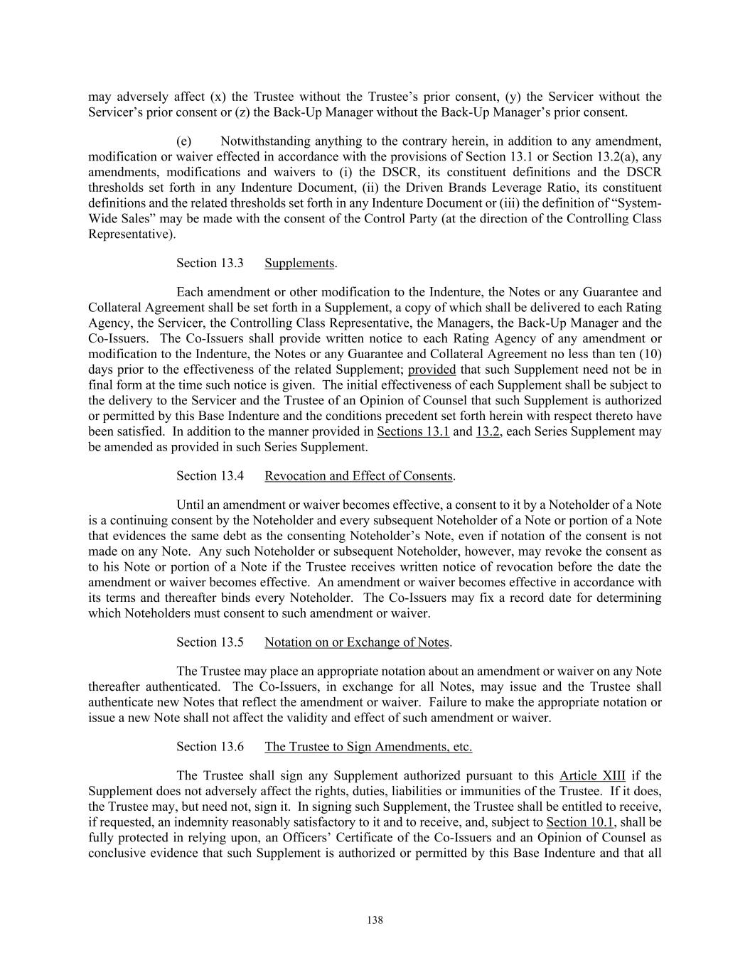 87 (b) Except as otherwise provided in Section 8.7(d), no Co-Issuer will, nor will it permit any other Service Recipient to, take any action which would permit any other Person party to a Franchise Document to have the right to refuse to perform any of its respective obligations under such Franchise Document or that would result in the amendment, waiver, hypothecation, subordination, termination or discharge of, or impair the validity or effectiveness of, such Franchise Document if such action when taken on behalf of any Service Recipient by the applicable Manager would constitute a breach by such Manager of the applicable Management Agreement. (c) No Co-Issuer will, nor will it permit any other Service Recipient to, without the prior written consent of the Control Party, exercise any right, remedy, power or privilege available to it with respect to any obligor under a Collateral Document or under any instrument or agreement included in the Collateral, take any action to compel or secure performance or observance by any such obligor of its obligations to such Co-Issuer or such other Service Recipient or give any consent, request, notice, direction or approval with respect to any such obligor if such action when taken on behalf of any Service Recipient by the applicable Manager would constitute a breach by such Manager of the applicable Management Agreement. (d) Each Co-Issuer agrees that it will not, and will cause each Service Recipient that is a Subsidiary of such Co-Issuer not to, without the prior written consent of the Control Party, amend, modify, waive, supplement, terminate or surrender, or agree to any amendment, modification, supplement, termination, waiver or surrender of, the terms of any of the Transaction Documents; provided, however, that each Co-Issuer and each Service Recipient may agree to any amendment, modification, supplement or waiver of any such term of any Transaction Document without any such consent (x) to the extent permitted under the terms of such other Transaction Documents, (y) solely with respect to any Indenture Document, as contemplated by Section 13.1 or (z) with respect to any Transaction Document that is not an Indenture Document, as follows: (i) to add to the covenants of any Securitization Entity for the benefit of the Secured Parties or to add to the covenants of any Driven Brands Entity for the benefit of any Securitization Entity; (ii) to terminate any Transaction Document if any party thereto (other than a Service Recipient) becomes, in the reasonable judgment of the Co-Issuers, unable to pay its debts as they become due, even if such party has not yet defaulted on its obligations under the Transaction Document, so long as the Co-Issuers enter into a replacement agreement with a new party within 90 days of the termination of the Transaction Document; (iii) to make such other provisions in regard to matters or questions arising under the Transaction Documents as the parties thereto may deem necessary or desirable, which are not inconsistent with the provisions thereof and which shall not materially and adversely affect the interests of any Noteholder, any Note Owner, or any other Secured Party; provided that an Officers’ Certificate shall be delivered to the Trustee and the Servicer to such effect; (iv) to make conforming changes related to the joinder or addition of new Service Recipients or Future Securitization Entities; or (v) in connection with a Series Refinancing Event. For the avoidance of doubt, the prior written consent of the Control Party shall not be required for any amendment, modification, supplement, termination, waiver or surrender of, the terms of any