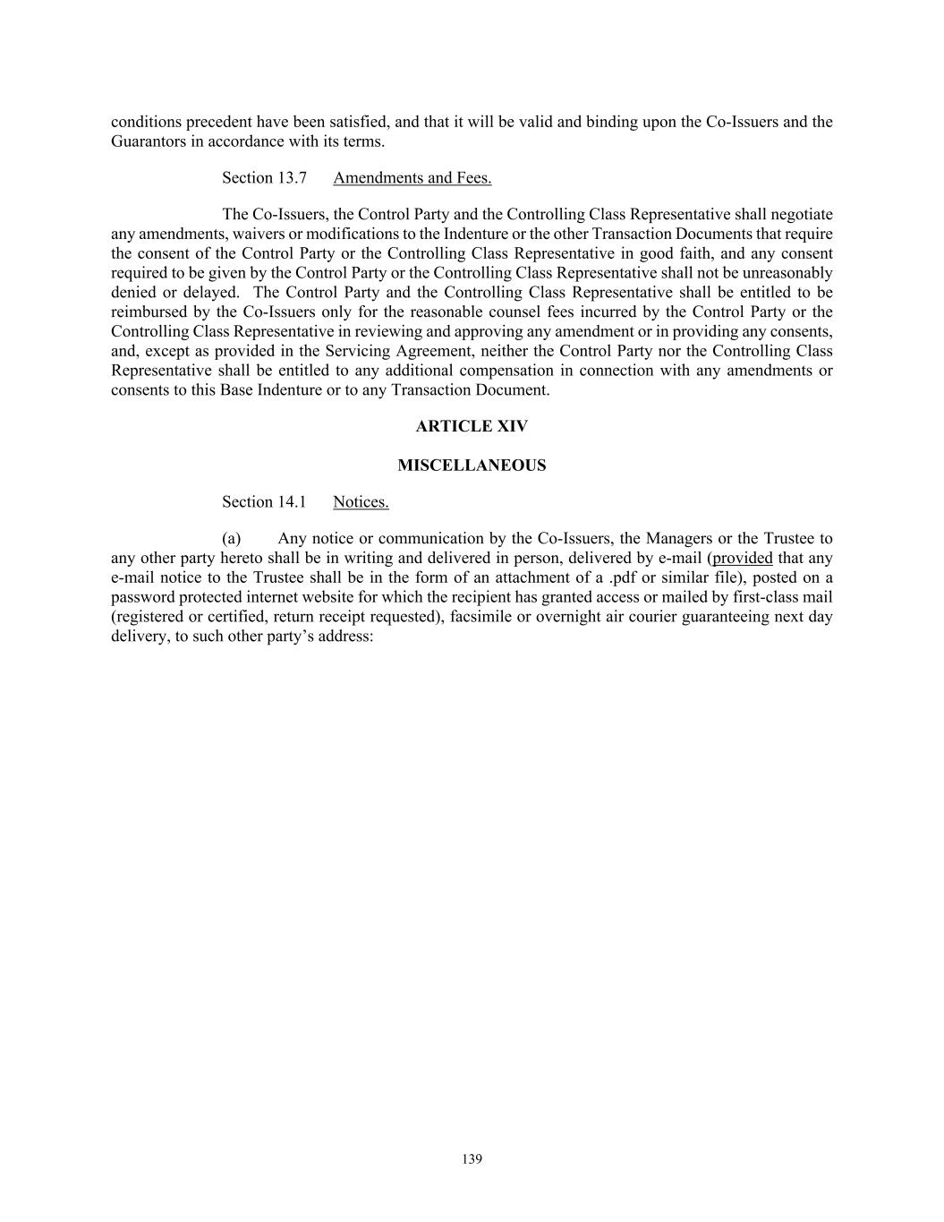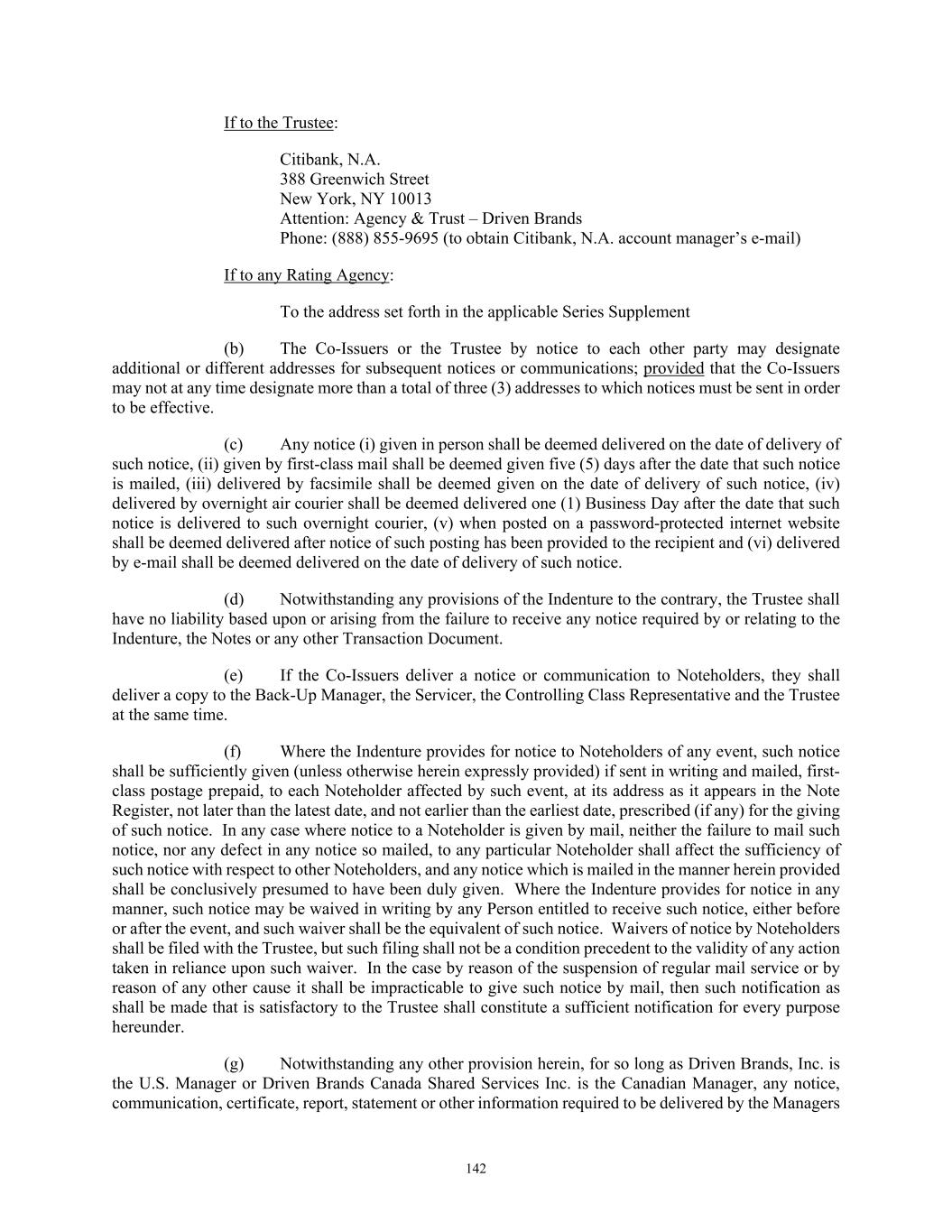 v Article XIII AMENDMENTS .................................................................................................................. 132 Section 13.1 Without Consent of the Controlling Class Representative or the Noteholders .. 132 Section 13.2 With Consent of the Controlling Class Representative or the Noteholders ....... 135 Section 13.3 Supplements ....................................................................................................... 138 Section 13.4 Revocation and Effect of Consents .................................................................... 139 Section 13.5 Notation on or Exchange of Notes ..................................................................... 139 Section 13.6 The Trustee to Sign Amendments, etc. .............................................................. 139 Section 13.7 Amendments and Fees. ...................................................................................... 139 Article XIV MISCELLANEOUS ............................................................................................................. 140 Section 14.1 Notices. .............................................................................................................. 140 Section 14.2 Communication by Noteholders With Other Noteholders ................................. 143 Section 14.3 Officers’ Certificate as to Conditions Precedent ............................................... 143 Section 14.4 Statements Required in Certificate .................................................................... 143 Section 14.5 Rules by the Trustee .......................................................................................... 143 Section 14.6 Benefits of Indenture ......................................................................................... 143 Section 14.7 Payment on Business Day .................................................................................. 144 Section 14.8 Governing Law .................................................................................................. 144 Section 14.9 Successors .......................................................................................................... 144 Section 14.10 Severability ........................................................................................................ 144 Section 14.11 Counterpart Originals ........................................................................................ 144 Section 14.12 Table of Contents, Headings, etc. ...................................................................... 144 Section 14.13 No Bankruptcy Petition Against the Securitization Entities .............................. 144 Section 14.14 Recording of Indenture ...................................................................................... 145 Section 14.15 Waiver of Jury Trial ........................................................................................... 145 Section 14.16 Submission to Jurisdiction; Waivers .................................................................. 145 Section 14.17 Calculation of Driven Brands Leverage Ratio and Senior Leverage Ratio ....... 145 Section 14.18 Permitted Asset Dispositions and Permitted Brand Dispositions; Release of Collateral ............................................................................................................ 148 Section 14.19 FX Agent ........................................................................................................... 148 Section 14.20 Amendment and Restatement. ........................................................................... 148 Section 14.21 Currency Indemnity. .......................................................................................... 149 Section 14.22 Hypothecary Representative .............................................................................. 149 Section 14.23 Electronic Signatures and Transmission ............................................................ 150