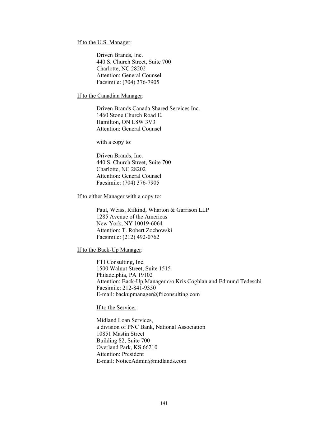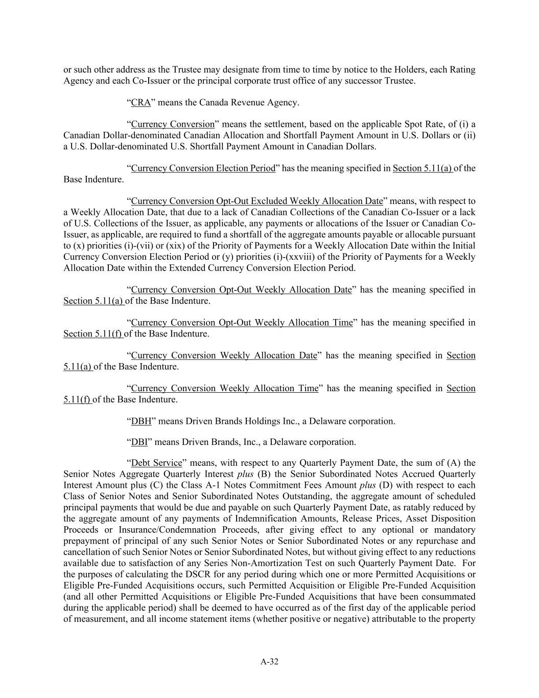 A-32 or such other address as the Trustee may designate from time to time by notice to the Holders, each Rating Agency and each Co-Issuer or the principal corporate trust office of any successor Trustee. “CRA” means the Canada Revenue Agency. “Currency Conversion” means the settlement, based on the applicable Spot Rate, of (i) a Canadian Dollar-denominated Canadian Allocation and Shortfall Payment Amount in U.S. Dollars or (ii) a U.S. Dollar-denominated U.S. Shortfall Payment Amount in Canadian Dollars. “Currency Conversion Election Period” has the meaning specified in Section 5.11(a) of the Base Indenture. “Currency Conversion Opt-Out Excluded Weekly Allocation Date” means, with respect to a Weekly Allocation Date, that due to a lack of Canadian Collections of the Canadian Co-Issuer or a lack of U.S. Collections of the Issuer, as applicable, any payments or allocations of the Issuer or Canadian Co- Issuer, as applicable, are required to fund a shortfall of the aggregate amounts payable or allocable pursuant to (x) priorities (i)-(vii) or (xix) of the Priority of Payments for a Weekly Allocation Date within the Initial Currency Conversion Election Period or (y) priorities (i)-(xxviii) of the Priority of Payments for a Weekly Allocation Date within the Extended Currency Conversion Election Period. “Currency Conversion Opt-Out Weekly Allocation Date” has the meaning specified in Section 5.11(a) of the Base Indenture. “Currency Conversion Opt-Out Weekly Allocation Time” has the meaning specified in Section 5.11(f) of the Base Indenture. “Currency Conversion Weekly Allocation Date” has the meaning specified in Section 5.11(a) of the Base Indenture. “Currency Conversion Weekly Allocation Time” has the meaning specified in Section 5.11(f) of the Base Indenture. “DBH” means Driven Brands Holdings Inc., a Delaware corporation. “DBI” means Driven Brands, Inc., a Delaware corporation. “Debt Service” means, with respect to any Quarterly Payment Date, the sum of (A) the Senior Notes Aggregate Quarterly Interest plus (B) the Senior Subordinated Notes Accrued Quarterly Interest Amount plus (C) the Class A-1 Notes Commitment Fees Amount plus (D) with respect to each Class of Senior Notes and Senior Subordinated Notes Outstanding, the aggregate amount of scheduled principal payments that would be due and payable on such Quarterly Payment Date, as ratably reduced by the aggregate amount of any payments of Indemnification Amounts, Release Prices, Asset Disposition Proceeds or Insurance/Condemnation Proceeds, after giving effect to any optional or mandatory prepayment of principal of any such Senior Notes or Senior Subordinated Notes or any repurchase and cancellation of such Senior Notes or Senior Subordinated Notes, but without giving effect to any reductions available due to satisfaction of any Series Non-Amortization Test on such Quarterly Payment Date. For the purposes of calculating the DSCR for any period during which one or more Permitted Acquisitions or Eligible Pre-Funded Acquisitions occurs, such Permitted Acquisition or Eligible Pre-Funded Acquisition (and all other Permitted Acquisitions or Eligible Pre-Funded Acquisitions that have been consummated during the applicable period) shall be deemed to have occurred as of the first day of the applicable period of measurement, and all income statement items (whether positive or negative) attributable to the property