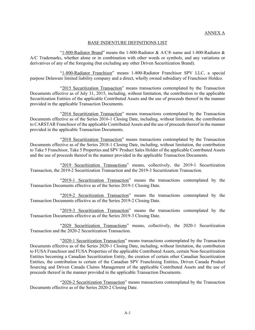 A-1 ANNEX A BASE INDENTURE DEFINITIONS LIST “1-800-Radiator Brand” means the 1-800-Radiator & A/C® name and 1-800-Radiator & A/C Trademarks, whether alone or in combination with other words or symbols, and any variations or derivatives of any of the foregoing (but excluding any other Driven Securitization Brand). “1-800-Radiator Franchisor” means 1-800-Radiator Franchisor SPV LLC, a special purpose Delaware limited liability company and a direct, wholly owned subsidiary of Franchisor Holdco. “2015 Securitization Transaction” means transactions contemplated by the Transaction Documents effective as of July 31, 2015, including, without limitation, the contribution to the applicable Securitization Entities of the applicable Contributed Assets and the use of proceeds thereof in the manner provided in the applicable Transaction Documents. “2016 Securitization Transaction” means transactions contemplated by the Transaction Documents effective as of the Series 2016-1 Closing Date, including, without limitation, the contribution to CARSTAR Franchisor of the applicable Contributed Assets and the use of proceeds thereof in the manner provided in the applicable Transaction Documents. “2018 Securitization Transaction” means transactions contemplated by the Transaction Documents effective as of the Series 2018-1 Closing Date, including, without limitation, the contribution to Take 5 Franchisor, Take 5 Properties and SPV Product Sales Holder of the applicable Contributed Assets and the use of proceeds thereof in the manner provided in the applicable Transaction Documents. “2019 Securitization Transactions” means, collectively, the 2019-1 Securitization Transaction, the 2019-2 Securitization Transaction and the 2019-3 Securitization Transaction. “2019-1 Securitization Transaction” means the transactions contemplated by the Transaction Documents effective as of the Series 2019-1 Closing Date. “2019-2 Securitization Transaction” means the transactions contemplated by the Transaction Documents effective as of the Series 2019-2 Closing Date. “2019-3 Securitization Transaction” means the transactions contemplated by the Transaction Documents effective as of the Series 2019-3 Closing Date. “2020 Securitization Transactions” means, collectively, the 2020-1 Securitization Transaction and the 2020-2 Securitization Transaction. “2020-1 Securitization Transaction” means transactions contemplated by the Transaction Documents effective as of the Series 2020-1 Closing Date, including, without limitation, the contribution to FUSA Franchisor and FUSA Properties of the applicable Contributed Assets, certain Non-Securitization Entities becoming a Canadian Securitization Entity, the creation of certain other Canadian Securitization Entities, the contribution to certain of the Canadian SPV Franchising Entities, Driven Canada Product Sourcing and Driven Canada Claims Management of the applicable Contributed Assets and the use of proceeds thereof in the manner provided in the applicable Transaction Documents. “2020-2 Securitization Transaction” means transactions contemplated by the Transaction Documents effective as of the Series 2020-2 Closing Date.