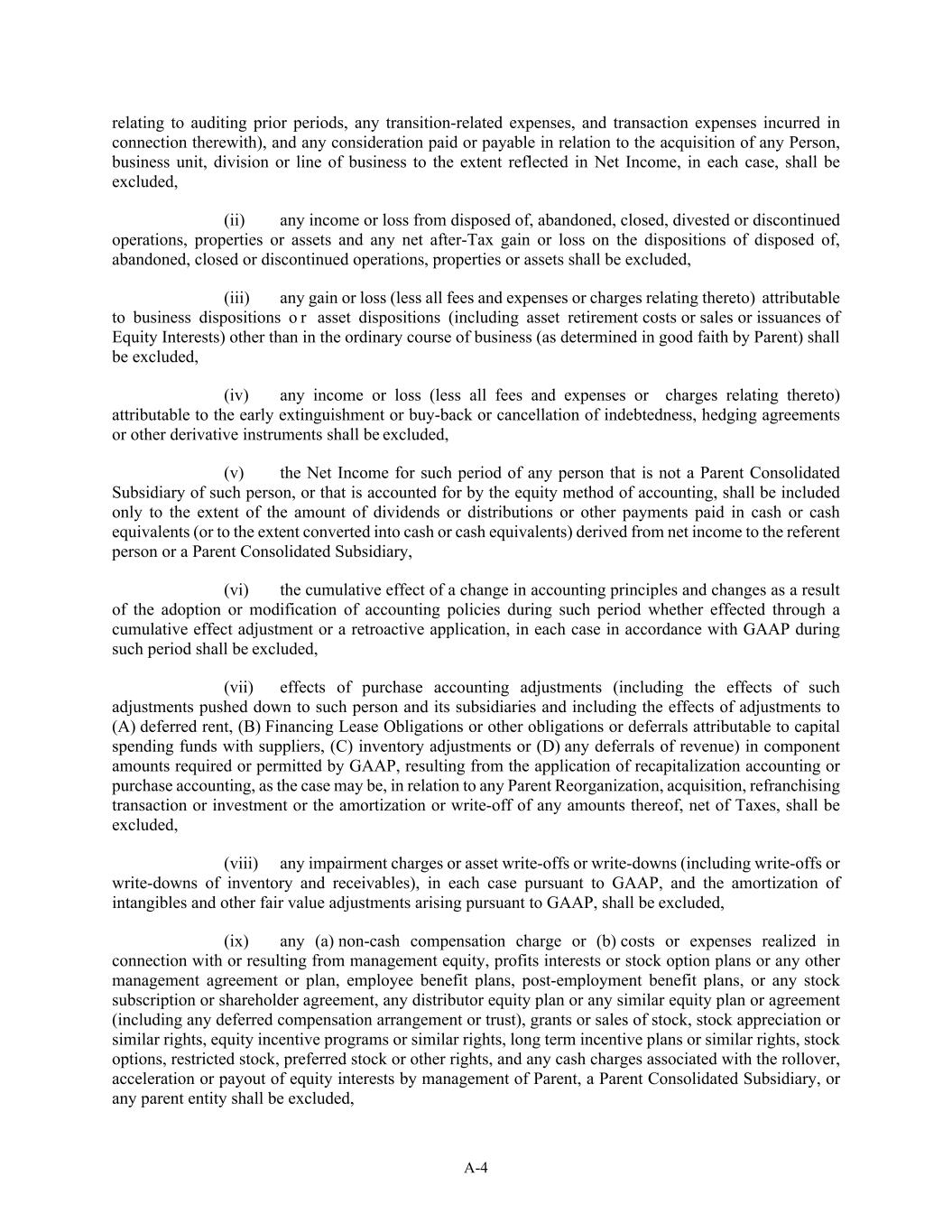 A-4 relating to auditing prior periods, any transition-related expenses, and transaction expenses incurred in connection therewith), and any consideration paid or payable in relation to the acquisition of any Person, business unit, division or line of business to the extent reflected in Net Income, in each case, shall be excluded, (ii) any income or loss from disposed of, abandoned, closed, divested or discontinued operations, properties or assets and any net after-Tax gain or loss on the dispositions of disposed of, abandoned, closed or discontinued operations, properties or assets shall be excluded, (iii) any gain or loss (less all fees and expenses or charges relating thereto) attributable to business dispositions o r asset dispositions (including asset retirement costs or sales or issuances of Equity Interests) other than in the ordinary course of business (as determined in good faith by Parent) shall be excluded, (iv) any income or loss (less all fees and expenses or charges relating thereto) attributable to the early extinguishment or buy-back or cancellation of indebtedness, hedging agreements or other derivative instruments shall be excluded, (v) the Net Income for such period of any person that is not a Parent Consolidated Subsidiary of such person, or that is accounted for by the equity method of accounting, shall be included only to the extent of the amount of dividends or distributions or other payments paid in cash or cash equivalents (or to the extent converted into cash or cash equivalents) derived from net income to the referent person or a Parent Consolidated Subsidiary, (vi) the cumulative effect of a change in accounting principles and changes as a result of the adoption or modification of accounting policies during such period whether effected through a cumulative effect adjustment or a retroactive application, in each case in accordance with GAAP during such period shall be excluded, (vii) effects of purchase accounting adjustments (including the effects of such adjustments pushed down to such person and its subsidiaries and including the effects of adjustments to (A) deferred rent, (B) Financing Lease Obligations or other obligations or deferrals attributable to capital spending funds with suppliers, (C) inventory adjustments or (D) any deferrals of revenue) in component amounts required or permitted by GAAP, resulting from the application of recapitalization accounting or purchase accounting, as the case may be, in relation to any Parent Reorganization, acquisition, refranchising transaction or investment or the amortization or write-off of any amounts thereof, net of Taxes, shall be excluded, (viii) any impairment charges or asset write-offs or write-downs (including write-offs or write-downs of inventory and receivables), in each case pursuant to GAAP, and the amortization of intangibles and other fair value adjustments arising pursuant to GAAP, shall be excluded, (ix) any (a) non-cash compensation charge or (b) costs or expenses realized in connection with or resulting from management equity, profits interests or stock option plans or any other management agreement or plan, employee benefit plans, post-employment benefit plans, or any stock subscription or shareholder agreement, any distributor equity plan or any similar equity plan or agreement (including any deferred compensation arrangement or trust), grants or sales of stock, stock appreciation or similar rights, equity incentive programs or similar rights, long term incentive plans or similar rights, stock options, restricted stock, preferred stock or other rights, and any cash charges associated with the rollover, acceleration or payout of equity interests by management of Parent, a Parent Consolidated Subsidiary, or any parent entity shall be excluded,