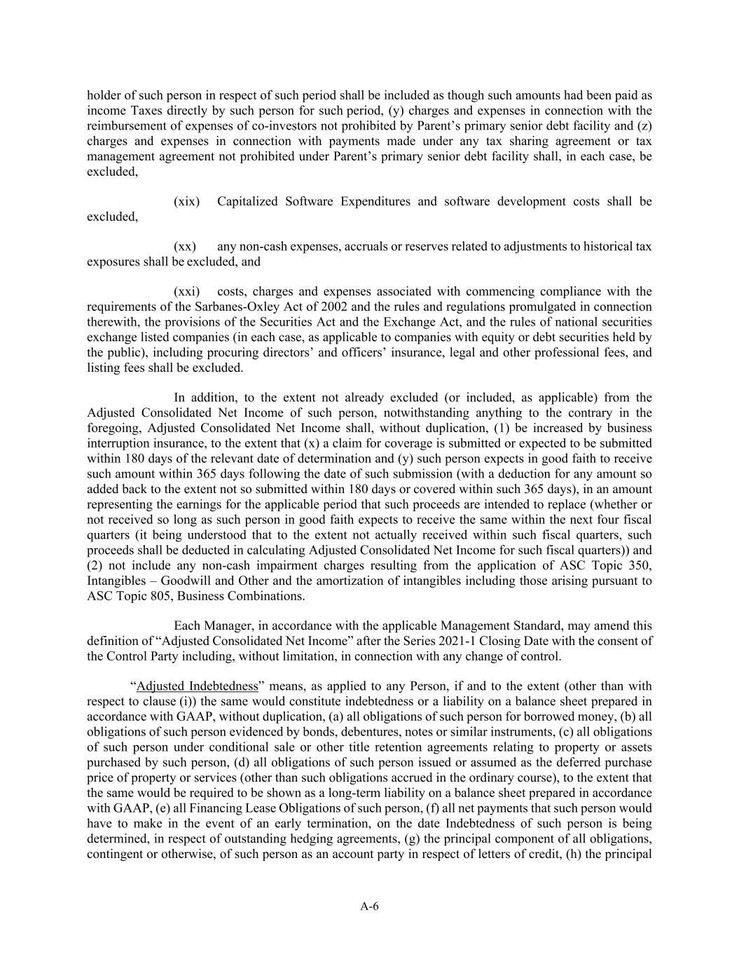 A-6 holder of such person in respect of such period shall be included as though such amounts had been paid as income Taxes directly by such person for such period, (y) charges and expenses in connection with the reimbursement of expenses of co-investors not prohibited by Parent’s primary senior debt facility and (z) charges and expenses in connection with payments made under any tax sharing agreement or tax management agreement not prohibited under Parent’s primary senior debt facility shall, in each case, be excluded, (xix) Capitalized Software Expenditures and software development costs shall be excluded, (xx) any non-cash expenses, accruals or reserves related to adjustments to historical tax exposures shall be excluded, and (xxi) costs, charges and expenses associated with commencing compliance with the requirements of the Sarbanes-Oxley Act of 2002 and the rules and regulations promulgated in connection therewith, the provisions of the Securities Act and the Exchange Act, and the rules of national securities exchange listed companies (in each case, as applicable to companies with equity or debt securities held by the public), including procuring directors’ and officers’ insurance, legal and other professional fees, and listing fees shall be excluded. In addition, to the extent not already excluded (or included, as applicable) from the Adjusted Consolidated Net Income of such person, notwithstanding anything to the contrary in the foregoing, Adjusted Consolidated Net Income shall, without duplication, (1) be increased by business interruption insurance, to the extent that (x) a claim for coverage is submitted or expected to be submitted within 180 days of the relevant date of determination and (y) such person expects in good faith to receive such amount within 365 days following the date of such submission (with a deduction for any amount so added back to the extent not so submitted within 180 days or covered within such 365 days), in an amount representing the earnings for the applicable period that such proceeds are intended to replace (whether or not received so long as such person in good faith expects to receive the same within the next four fiscal quarters (it being understood that to the extent not actually received within such fiscal quarters, such proceeds shall be deducted in calculating Adjusted Consolidated Net Income for such fiscal quarters)) and (2) not include any non-cash impairment charges resulting from the application of ASC Topic 350, Intangibles – Goodwill and Other and the amortization of intangibles including those arising pursuant to ASC Topic 805, Business Combinations. Each Manager, in accordance with the applicable Management Standard, may amend this definition of “Adjusted Consolidated Net Income” after the Series 2021-1 Closing Date with the consent of the Control Party including, without limitation, in connection with any change of control. “Adjusted Indebtedness” means, as applied to any Person, if and to the extent (other than with respect to clause (i)) the same would constitute indebtedness or a liability on a balance sheet prepared in accordance with GAAP, without duplication, (a) all obligations of such person for borrowed money, (b) all obligations of such person evidenced by bonds, debentures, notes or similar instruments, (c) all obligations of such person under conditional sale or other title retention agreements relating to property or assets purchased by such person, (d) all obligations of such person issued or assumed as the deferred purchase price of property or services (other than such obligations accrued in the ordinary course), to the extent that the same would be required to be shown as a long-term liability on a balance sheet prepared in accordance with GAAP, (e) all Financing Lease Obligations of such person, (f) all net payments that such person would have to make in the event of an early termination, on the date Indebtedness of such person is being determined, in respect of outstanding hedging agreements, (g) the principal component of all obligations, contingent or otherwise, of such person as an account party in respect of letters of credit, (h) the principal