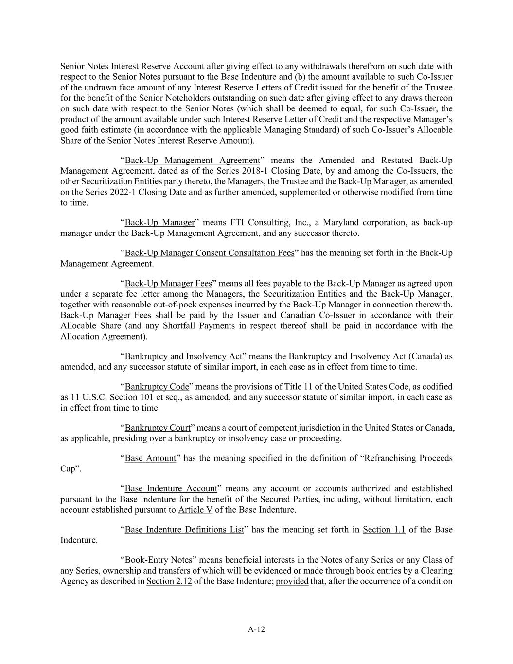 A-12 Senior Notes Interest Reserve Account after giving effect to any withdrawals therefrom on such date with respect to the Senior Notes pursuant to the Base Indenture and (b) the amount available to such Co-Issuer of the undrawn face amount of any Interest Reserve Letters of Credit issued for the benefit of the Trustee for the benefit of the Senior Noteholders outstanding on such date after giving effect to any draws thereon on such date with respect to the Senior Notes (which shall be deemed to equal, for such Co-Issuer, the product of the amount available under such Interest Reserve Letter of Credit and the respective Manager’s good faith estimate (in accordance with the applicable Managing Standard) of such Co-Issuer’s Allocable Share of the Senior Notes Interest Reserve Amount). “Back-Up Management Agreement” means the Amended and Restated Back-Up Management Agreement, dated as of the Series 2018-1 Closing Date, by and among the Co-Issuers, the other Securitization Entities party thereto, the Managers, the Trustee and the Back-Up Manager, as amended on the Series 2022-1 Closing Date and as further amended, supplemented or otherwise modified from time to time. “Back-Up Manager” means FTI Consulting, Inc., a Maryland corporation, as back-up manager under the Back-Up Management Agreement, and any successor thereto. “Back-Up Manager Consent Consultation Fees” has the meaning set forth in the Back-Up Management Agreement. “Back-Up Manager Fees” means all fees payable to the Back-Up Manager as agreed upon under a separate fee letter among the Managers, the Securitization Entities and the Back-Up Manager, together with reasonable out-of-pock expenses incurred by the Back-Up Manager in connection therewith. Back-Up Manager Fees shall be paid by the Issuer and Canadian Co-Issuer in accordance with their Allocable Share (and any Shortfall Payments in respect thereof shall be paid in accordance with the Allocation Agreement). “Bankruptcy and Insolvency Act” means the Bankruptcy and Insolvency Act (Canada) as amended, and any successor statute of similar import, in each case as in effect from time to time. “Bankruptcy Code” means the provisions of Title 11 of the United States Code, as codified as 11 U.S.C. Section 101 et seq., as amended, and any successor statute of similar import, in each case as in effect from time to time. “Bankruptcy Court” means a court of competent jurisdiction in the United States or Canada, as applicable, presiding over a bankruptcy or insolvency case or proceeding. “Base Amount” has the meaning specified in the definition of “Refranchising Proceeds Cap”. “Base Indenture Account” means any account or accounts authorized and established pursuant to the Base Indenture for the benefit of the Secured Parties, including, without limitation, each account established pursuant to Article V of the Base Indenture. “Base Indenture Definitions List” has the meaning set forth in Section 1.1 of the Base Indenture. “Book-Entry Notes” means beneficial interests in the Notes of any Series or any Class of any Series, ownership and transfers of which will be evidenced or made through book entries by a Clearing Agency as described in Section 2.12 of the Base Indenture; provided that, after the occurrence of a condition