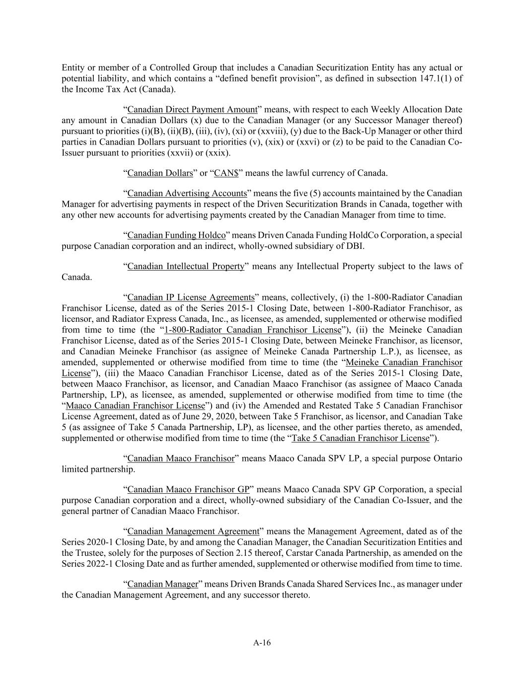 A-16 Entity or member of a Controlled Group that includes a Canadian Securitization Entity has any actual or potential liability, and which contains a “defined benefit provision”, as defined in subsection 147.1(1) of the Income Tax Act (Canada). “Canadian Direct Payment Amount” means, with respect to each Weekly Allocation Date any amount in Canadian Dollars (x) due to the Canadian Manager (or any Successor Manager thereof) pursuant to priorities (i)(B), (ii)(B), (iii), (iv), (xi) or (xxviii), (y) due to the Back-Up Manager or other third parties in Canadian Dollars pursuant to priorities (v), (xix) or (xxvi) or (z) to be paid to the Canadian Co- Issuer pursuant to priorities (xxvii) or (xxix). “Canadian Dollars” or “CAN$” means the lawful currency of Canada. “Canadian Advertising Accounts” means the five (5) accounts maintained by the Canadian Manager for advertising payments in respect of the Driven Securitization Brands in Canada, together with any other new accounts for advertising payments created by the Canadian Manager from time to time. “Canadian Funding Holdco” means Driven Canada Funding HoldCo Corporation, a special purpose Canadian corporation and an indirect, wholly-owned subsidiary of DBI. “Canadian Intellectual Property” means any Intellectual Property subject to the laws of Canada. “Canadian IP License Agreements” means, collectively, (i) the 1-800-Radiator Canadian Franchisor License, dated as of the Series 2015-1 Closing Date, between 1-800-Radiator Franchisor, as licensor, and Radiator Express Canada, Inc., as licensee, as amended, supplemented or otherwise modified from time to time (the “1-800-Radiator Canadian Franchisor License”), (ii) the Meineke Canadian Franchisor License, dated as of the Series 2015-1 Closing Date, between Meineke Franchisor, as licensor, and Canadian Meineke Franchisor (as assignee of Meineke Canada Partnership L.P.), as licensee, as amended, supplemented or otherwise modified from time to time (the “Meineke Canadian Franchisor License”), (iii) the Maaco Canadian Franchisor License, dated as of the Series 2015-1 Closing Date, between Maaco Franchisor, as licensor, and Canadian Maaco Franchisor (as assignee of Maaco Canada Partnership, LP), as licensee, as amended, supplemented or otherwise modified from time to time (the “Maaco Canadian Franchisor License”) and (iv) the Amended and Restated Take 5 Canadian Franchisor License Agreement, dated as of June 29, 2020, between Take 5 Franchisor, as licensor, and Canadian Take 5 (as assignee of Take 5 Canada Partnership, LP), as licensee, and the other parties thereto, as amended, supplemented or otherwise modified from time to time (the “Take 5 Canadian Franchisor License”). “Canadian Maaco Franchisor” means Maaco Canada SPV LP, a special purpose Ontario limited partnership. “Canadian Maaco Franchisor GP” means Maaco Canada SPV GP Corporation, a special purpose Canadian corporation and a direct, wholly-owned subsidiary of the Canadian Co-Issuer, and the general partner of Canadian Maaco Franchisor. “Canadian Management Agreement” means the Management Agreement, dated as of the Series 2020-1 Closing Date, by and among the Canadian Manager, the Canadian Securitization Entities and the Trustee, solely for the purposes of Section 2.15 thereof, Carstar Canada Partnership, as amended on the Series 2022-1 Closing Date and as further amended, supplemented or otherwise modified from time to time. “Canadian Manager” means Driven Brands Canada Shared Services Inc., as manager under the Canadian Management Agreement, and any successor thereto.