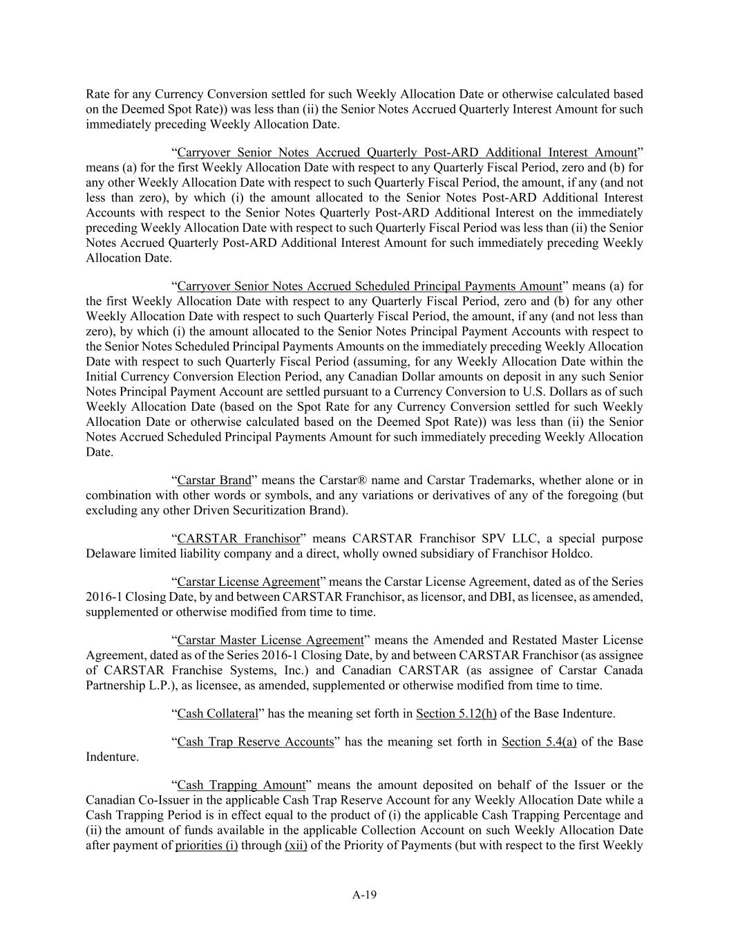 A-19 Rate for any Currency Conversion settled for such Weekly Allocation Date or otherwise calculated based on the Deemed Spot Rate)) was less than (ii) the Senior Notes Accrued Quarterly Interest Amount for such immediately preceding Weekly Allocation Date. “Carryover Senior Notes Accrued Quarterly Post-ARD Additional Interest Amount” means (a) for the first Weekly Allocation Date with respect to any Quarterly Fiscal Period, zero and (b) for any other Weekly Allocation Date with respect to such Quarterly Fiscal Period, the amount, if any (and not less than zero), by which (i) the amount allocated to the Senior Notes Post-ARD Additional Interest Accounts with respect to the Senior Notes Quarterly Post-ARD Additional Interest on the immediately preceding Weekly Allocation Date with respect to such Quarterly Fiscal Period was less than (ii) the Senior Notes Accrued Quarterly Post-ARD Additional Interest Amount for such immediately preceding Weekly Allocation Date. “Carryover Senior Notes Accrued Scheduled Principal Payments Amount” means (a) for the first Weekly Allocation Date with respect to any Quarterly Fiscal Period, zero and (b) for any other Weekly Allocation Date with respect to such Quarterly Fiscal Period, the amount, if any (and not less than zero), by which (i) the amount allocated to the Senior Notes Principal Payment Accounts with respect to the Senior Notes Scheduled Principal Payments Amounts on the immediately preceding Weekly Allocation Date with respect to such Quarterly Fiscal Period (assuming, for any Weekly Allocation Date within the Initial Currency Conversion Election Period, any Canadian Dollar amounts on deposit in any such Senior Notes Principal Payment Account are settled pursuant to a Currency Conversion to U.S. Dollars as of such Weekly Allocation Date (based on the Spot Rate for any Currency Conversion settled for such Weekly Allocation Date or otherwise calculated based on the Deemed Spot Rate)) was less than (ii) the Senior Notes Accrued Scheduled Principal Payments Amount for such immediately preceding Weekly Allocation Date. “Carstar Brand” means the Carstar® name and Carstar Trademarks, whether alone or in combination with other words or symbols, and any variations or derivatives of any of the foregoing (but excluding any other Driven Securitization Brand). “CARSTAR Franchisor” means CARSTAR Franchisor SPV LLC, a special purpose Delaware limited liability company and a direct, wholly owned subsidiary of Franchisor Holdco. “Carstar License Agreement” means the Carstar License Agreement, dated as of the Series 2016-1 Closing Date, by and between CARSTAR Franchisor, as licensor, and DBI, as licensee, as amended, supplemented or otherwise modified from time to time. “Carstar Master License Agreement” means the Amended and Restated Master License Agreement, dated as of the Series 2016-1 Closing Date, by and between CARSTAR Franchisor (as assignee of CARSTAR Franchise Systems, Inc.) and Canadian CARSTAR (as assignee of Carstar Canada Partnership L.P.), as licensee, as amended, supplemented or otherwise modified from time to time. “Cash Collateral” has the meaning set forth in Section 5.12(h) of the Base Indenture. “Cash Trap Reserve Accounts” has the meaning set forth in Section 5.4(a) of the Base Indenture. “Cash Trapping Amount” means the amount deposited on behalf of the Issuer or the Canadian Co-Issuer in the applicable Cash Trap Reserve Account for any Weekly Allocation Date while a Cash Trapping Period is in effect equal to the product of (i) the applicable Cash Trapping Percentage and (ii) the amount of funds available in the applicable Collection Account on such Weekly Allocation Date after payment of priorities (i) through (xii) of the Priority of Payments (but with respect to the first Weekly