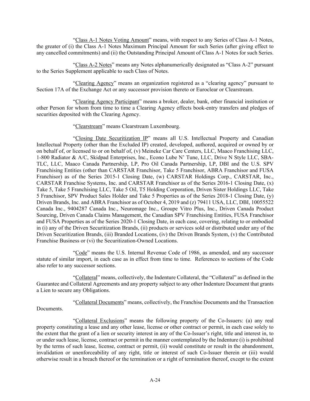 A-24 “Class A-1 Notes Voting Amount” means, with respect to any Series of Class A-1 Notes, the greater of (i) the Class A-1 Notes Maximum Principal Amount for such Series (after giving effect to any cancelled commitments) and (ii) the Outstanding Principal Amount of Class A-1 Notes for such Series. “Class A-2 Notes” means any Notes alphanumerically designated as “Class A-2” pursuant to the Series Supplement applicable to such Class of Notes. “Clearing Agency” means an organization registered as a “clearing agency” pursuant to Section 17A of the Exchange Act or any successor provision thereto or Euroclear or Clearstream. “Clearing Agency Participant” means a broker, dealer, bank, other financial institution or other Person for whom from time to time a Clearing Agency effects book-entry transfers and pledges of securities deposited with the Clearing Agency. “Clearstream” means Clearstream Luxembourg. “Closing Date Securitization IP” means all U.S. Intellectual Property and Canadian Intellectual Property (other than the Excluded IP) created, developed, authored, acquired or owned by or on behalf of, or licensed to or on behalf of, (v) Meineke Car Care Centers, LLC, Maaco Franchising LLC, 1-800 Radiator & A/C, Skidpad Enterprises, Inc., Econo Lube N’ Tune, LLC, Drive N Style LLC, SBA- TLC, LLC, Maaco Canada Partnership, LP, Pro Oil Canada Partnership, LP, DBI and the U.S. SPV Franchising Entities (other than CARSTAR Franchisor, Take 5 Franchisor, ABRA Franchisor and FUSA Franchisor) as of the Series 2015-1 Closing Date, (w) CARSTAR Holdings Corp., CARSTAR, Inc., CARSTAR Franchise Systems, Inc. and CARSTAR Franchisor as of the Series 2016-1 Closing Date, (x) Take 5, Take 5 Franchising LLC, Take 5 Oil, T5 Holding Corporation, Driven Sister Holdings LLC, Take 5 Franchisor, SPV Product Sales Holder and Take 5 Properties as of the Series 2018-1 Closing Date, (y) Driven Brands, Inc. and ABRA Franchisor as of October 4, 2019 and (z) 79411 USA, LLC, DBI, 10055522 Canada Inc., 9404287 Canada Inc., Neuromage Inc., Groupe Vitro Plus, Inc., Driven Canada Product Sourcing, Driven Canada Claims Management, the Canadian SPV Franchising Entities, FUSA Franchisor and FUSA Properties as of the Series 2020-1 Closing Date, in each case, covering, relating to or embodied in (i) any of the Driven Securitization Brands, (ii) products or services sold or distributed under any of the Driven Securitization Brands, (iii) Branded Locations, (iv) the Driven Brands System, (v) the Contributed Franchise Business or (vi) the Securitization-Owned Locations. “Code” means the U.S. Internal Revenue Code of 1986, as amended, and any successor statute of similar import, in each case as in effect from time to time. References to sections of the Code also refer to any successor sections. “Collateral” means, collectively, the Indenture Collateral, the “Collateral” as defined in the Guarantee and Collateral Agreements and any property subject to any other Indenture Document that grants a Lien to secure any Obligations. “Collateral Documents” means, collectively, the Franchise Documents and the Transaction Documents. “Collateral Exclusions” means the following property of the Co-Issuers: (a) any real property constituting a lease and any other lease, license or other contract or permit, in each case solely to the extent that the grant of a lien or security interest in any of the Co-Issuer’s right, title and interest in, to or under such lease, license, contract or permit in the manner contemplated by the Indenture (i) is prohibited by the terms of such lease, license, contract or permit, (ii) would constitute or result in the abandonment, invalidation or unenforceability of any right, title or interest of such Co-Issuer therein or (iii) would otherwise result in a breach thereof or the termination or a right of termination thereof, except to the extent