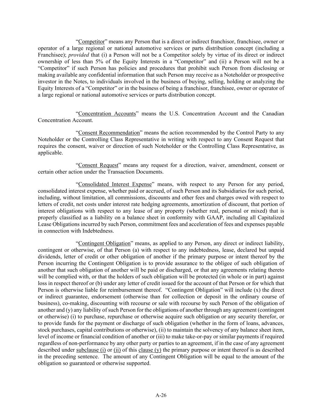 A-26 “Competitor” means any Person that is a direct or indirect franchisor, franchisee, owner or operator of a large regional or national automotive services or parts distribution concept (including a Franchisee); provided that (i) a Person will not be a Competitor solely by virtue of its direct or indirect ownership of less than 5% of the Equity Interests in a “Competitor” and (ii) a Person will not be a “Competitor” if such Person has policies and procedures that prohibit such Person from disclosing or making available any confidential information that such Person may receive as a Noteholder or prospective investor in the Notes, to individuals involved in the business of buying, selling, holding or analyzing the Equity Interests of a “Competitor” or in the business of being a franchisor, franchisee, owner or operator of a large regional or national automotive services or parts distribution concept. “Concentration Accounts” means the U.S. Concentration Account and the Canadian Concentration Account. “Consent Recommendation” means the action recommended by the Control Party to any Noteholder or the Controlling Class Representative in writing with respect to any Consent Request that requires the consent, waiver or direction of such Noteholder or the Controlling Class Representative, as applicable. “Consent Request” means any request for a direction, waiver, amendment, consent or certain other action under the Transaction Documents. “Consolidated Interest Expense” means, with respect to any Person for any period, consolidated interest expense, whether paid or accrued, of such Person and its Subsidiaries for such period, including, without limitation, all commissions, discounts and other fees and charges owed with respect to letters of credit, net costs under interest rate hedging agreements, amortization of discount, that portion of interest obligations with respect to any lease of any property (whether real, personal or mixed) that is properly classified as a liability on a balance sheet in conformity with GAAP, including all Capitalized Lease Obligations incurred by such Person, commitment fees and acceleration of fees and expenses payable in connection with Indebtedness. “Contingent Obligation” means, as applied to any Person, any direct or indirect liability, contingent or otherwise, of that Person (a) with respect to any indebtedness, lease, declared but unpaid dividends, letter of credit or other obligation of another if the primary purpose or intent thereof by the Person incurring the Contingent Obligation is to provide assurance to the obligee of such obligation of another that such obligation of another will be paid or discharged, or that any agreements relating thereto will be complied with, or that the holders of such obligation will be protected (in whole or in part) against loss in respect thereof or (b) under any letter of credit issued for the account of that Person or for which that Person is otherwise liable for reimbursement thereof. “Contingent Obligation” will include (x) the direct or indirect guarantee, endorsement (otherwise than for collection or deposit in the ordinary course of business), co-making, discounting with recourse or sale with recourse by such Person of the obligation of another and (y) any liability of such Person for the obligations of another through any agreement (contingent or otherwise) (i) to purchase, repurchase or otherwise acquire such obligation or any security therefor, or to provide funds for the payment or discharge of such obligation (whether in the form of loans, advances, stock purchases, capital contributions or otherwise), (ii) to maintain the solvency of any balance sheet item, level of income or financial condition of another or (iii) to make take-or-pay or similar payments if required regardless of non-performance by any other party or parties to an agreement, if in the case of any agreement described under subclause (i) or (ii) of this clause (y) the primary purpose or intent thereof is as described in the preceding sentence. The amount of any Contingent Obligation will be equal to the amount of the obligation so guaranteed or otherwise supported.