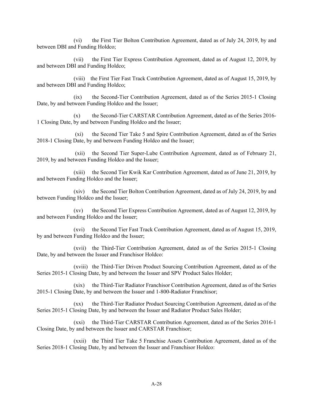 A-28 (vi) the First Tier Bolton Contribution Agreement, dated as of July 24, 2019, by and between DBI and Funding Holdco; (vii) the First Tier Express Contribution Agreement, dated as of August 12, 2019, by and between DBI and Funding Holdco; (viii) the First Tier Fast Track Contribution Agreement, dated as of August 15, 2019, by and between DBI and Funding Holdco; (ix) the Second-Tier Contribution Agreement, dated as of the Series 2015-1 Closing Date, by and between Funding Holdco and the Issuer; (x) the Second-Tier CARSTAR Contribution Agreement, dated as of the Series 2016- 1 Closing Date, by and between Funding Holdco and the Issuer; (xi) the Second Tier Take 5 and Spire Contribution Agreement, dated as of the Series 2018-1 Closing Date, by and between Funding Holdco and the Issuer; (xii) the Second Tier Super-Lube Contribution Agreement, dated as of February 21, 2019, by and between Funding Holdco and the Issuer; (xiii) the Second Tier Kwik Kar Contribution Agreement, dated as of June 21, 2019, by and between Funding Holdco and the Issuer; (xiv) the Second Tier Bolton Contribution Agreement, dated as of July 24, 2019, by and between Funding Holdco and the Issuer; (xv) the Second Tier Express Contribution Agreement, dated as of August 12, 2019, by and between Funding Holdco and the Issuer; (xvi) the Second Tier Fast Track Contribution Agreement, dated as of August 15, 2019, by and between Funding Holdco and the Issuer; (xvii) the Third-Tier Contribution Agreement, dated as of the Series 2015-1 Closing Date, by and between the Issuer and Franchisor Holdco: (xviii) the Third-Tier Driven Product Sourcing Contribution Agreement, dated as of the Series 2015-1 Closing Date, by and between the Issuer and SPV Product Sales Holder; (xix) the Third-Tier Radiator Franchisor Contribution Agreement, dated as of the Series 2015-1 Closing Date, by and between the Issuer and 1-800-Radiator Franchisor; (xx) the Third-Tier Radiator Product Sourcing Contribution Agreement, dated as of the Series 2015-1 Closing Date, by and between the Issuer and Radiator Product Sales Holder; (xxi) the Third-Tier CARSTAR Contribution Agreement, dated as of the Series 2016-1 Closing Date, by and between the Issuer and CARSTAR Franchisor; (xxii) the Third Tier Take 5 Franchise Assets Contribution Agreement, dated as of the Series 2018-1 Closing Date, by and between the Issuer and Franchisor Holdco: