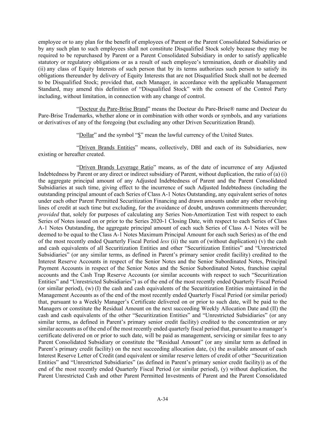 A-34 employee or to any plan for the benefit of employees of Parent or the Parent Consolidated Subsidiaries or by any such plan to such employees shall not constitute Disqualified Stock solely because they may be required to be repurchased by Parent or a Parent Consolidated Subsidiary in order to satisfy applicable statutory or regulatory obligations or as a result of such employee’s termination, death or disability and (ii) any class of Equity Interests of such person that by its terms authorizes such person to satisfy its obligations thereunder by delivery of Equity Interests that are not Disqualified Stock shall not be deemed to be Disqualified Stock; provided that, each Manager, in accordance with the applicable Management Standard, may amend this definition of “Disqualified Stock” with the consent of the Control Party including, without limitation, in connection with any change of control. “Docteur du Pare-Brise Brand” means the Docteur du Pare-Brise® name and Docteur du Pare-Brise Trademarks, whether alone or in combination with other words or symbols, and any variations or derivatives of any of the foregoing (but excluding any other Driven Securitization Brand). “Dollar” and the symbol “$” mean the lawful currency of the United States. “Driven Brands Entities” means, collectively, DBI and each of its Subsidiaries, now existing or hereafter created. “Driven Brands Leverage Ratio” means, as of the date of incurrence of any Adjusted Indebtedness by Parent or any direct or indirect subsidiary of Parent, without duplication, the ratio of (a) (i) the aggregate principal amount of any Adjusted Indebtedness of Parent and the Parent Consolidated Subsidiaries at such time, giving effect to the incurrence of such Adjusted Indebtedness (including the outstanding principal amount of each Series of Class A-1 Notes Outstanding, any equivalent series of notes under each other Parent Permitted Securitization Financing and drawn amounts under any other revolving lines of credit at such time but excluding, for the avoidance of doubt, undrawn commitments thereunder; provided that, solely for purposes of calculating any Series Non-Amortization Test with respect to each Series of Notes issued on or prior to the Series 2020-1 Closing Date, with respect to each Series of Class A-1 Notes Outstanding, the aggregate principal amount of each such Series of Class A-1 Notes will be deemed to be equal to the Class A-1 Notes Maximum Principal Amount for each such Series) as of the end of the most recently ended Quarterly Fiscal Period less (ii) the sum of (without duplication) (v) the cash and cash equivalents of all Securitization Entities and other “Securitization Entities” and “Unrestricted Subsidiaries” (or any similar terms, as defined in Parent’s primary senior credit facility) credited to the Interest Reserve Accounts in respect of the Senior Notes and the Senior Subordinated Notes, Principal Payment Accounts in respect of the Senior Notes and the Senior Subordinated Notes, franchise capital accounts and the Cash Trap Reserve Accounts (or similar accounts with respect to such “Securitization Entities” and “Unrestricted Subsidiaries”) as of the end of the most recently ended Quarterly Fiscal Period (or similar period), (w) (I) the cash and cash equivalents of the Securitization Entities maintained in the Management Accounts as of the end of the most recently ended Quarterly Fiscal Period (or similar period) that, pursuant to a Weekly Manager’s Certificate delivered on or prior to such date, will be paid to the Managers or constitute the Residual Amount on the next succeeding Weekly Allocation Date and (II) the cash and cash equivalents of the other “Securitization Entities” and “Unrestricted Subsidiaries” (or any similar terms, as defined in Parent’s primary senior credit facility) credited to the concentration or any similar accounts as of the end of the most recently ended quarterly fiscal period that, pursuant to a manager’s certificate delivered on or prior to such date, will be paid as management, servicing or similar fees to any Parent Consolidated Subsidiary or constitute the “Residual Amount” (or any similar term as defined in Parent’s primary credit facility) on the next succeeding allocation date, (x) the available amount of each Interest Reserve Letter of Credit (and equivalent or similar reserve letters of credit of other “Securitization Entities” and “Unrestricted Subsidiaries” (as defined in Parent’s primary senior credit facility)) as of the end of the most recently ended Quarterly Fiscal Period (or similar period), (y) without duplication, the Parent Unrestricted Cash and other Parent Permitted Investments of Parent and the Parent Consolidated