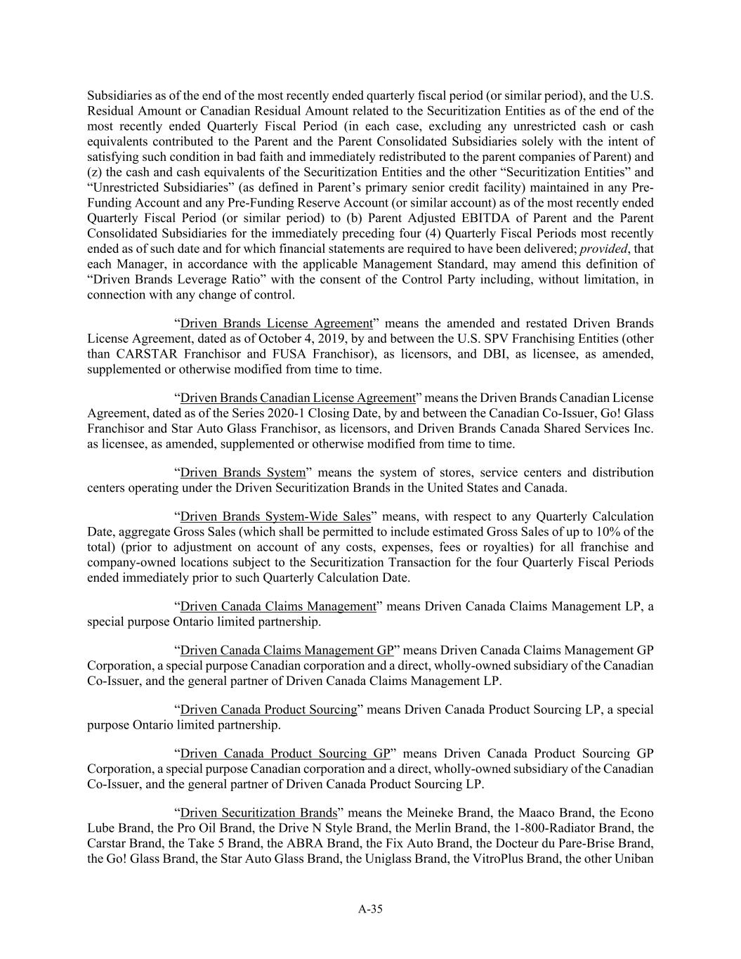 A-35 Subsidiaries as of the end of the most recently ended quarterly fiscal period (or similar period), and the U.S. Residual Amount or Canadian Residual Amount related to the Securitization Entities as of the end of the most recently ended Quarterly Fiscal Period (in each case, excluding any unrestricted cash or cash equivalents contributed to the Parent and the Parent Consolidated Subsidiaries solely with the intent of satisfying such condition in bad faith and immediately redistributed to the parent companies of Parent) and (z) the cash and cash equivalents of the Securitization Entities and the other “Securitization Entities” and “Unrestricted Subsidiaries” (as defined in Parent’s primary senior credit facility) maintained in any Pre- Funding Account and any Pre-Funding Reserve Account (or similar account) as of the most recently ended Quarterly Fiscal Period (or similar period) to (b) Parent Adjusted EBITDA of Parent and the Parent Consolidated Subsidiaries for the immediately preceding four (4) Quarterly Fiscal Periods most recently ended as of such date and for which financial statements are required to have been delivered; provided, that each Manager, in accordance with the applicable Management Standard, may amend this definition of “Driven Brands Leverage Ratio” with the consent of the Control Party including, without limitation, in connection with any change of control. “Driven Brands License Agreement” means the amended and restated Driven Brands License Agreement, dated as of October 4, 2019, by and between the U.S. SPV Franchising Entities (other than CARSTAR Franchisor and FUSA Franchisor), as licensors, and DBI, as licensee, as amended, supplemented or otherwise modified from time to time. “Driven Brands Canadian License Agreement” means the Driven Brands Canadian License Agreement, dated as of the Series 2020-1 Closing Date, by and between the Canadian Co-Issuer, Go! Glass Franchisor and Star Auto Glass Franchisor, as licensors, and Driven Brands Canada Shared Services Inc. as licensee, as amended, supplemented or otherwise modified from time to time. “Driven Brands System” means the system of stores, service centers and distribution centers operating under the Driven Securitization Brands in the United States and Canada. “Driven Brands System-Wide Sales” means, with respect to any Quarterly Calculation Date, aggregate Gross Sales (which shall be permitted to include estimated Gross Sales of up to 10% of the total) (prior to adjustment on account of any costs, expenses, fees or royalties) for all franchise and company-owned locations subject to the Securitization Transaction for the four Quarterly Fiscal Periods ended immediately prior to such Quarterly Calculation Date. “Driven Canada Claims Management” means Driven Canada Claims Management LP, a special purpose Ontario limited partnership. “Driven Canada Claims Management GP” means Driven Canada Claims Management GP Corporation, a special purpose Canadian corporation and a direct, wholly-owned subsidiary of the Canadian Co-Issuer, and the general partner of Driven Canada Claims Management LP. “Driven Canada Product Sourcing” means Driven Canada Product Sourcing LP, a special purpose Ontario limited partnership. “Driven Canada Product Sourcing GP” means Driven Canada Product Sourcing GP Corporation, a special purpose Canadian corporation and a direct, wholly-owned subsidiary of the Canadian Co-Issuer, and the general partner of Driven Canada Product Sourcing LP. “Driven Securitization Brands” means the Meineke Brand, the Maaco Brand, the Econo Lube Brand, the Pro Oil Brand, the Drive N Style Brand, the Merlin Brand, the 1-800-Radiator Brand, the Carstar Brand, the Take 5 Brand, the ABRA Brand, the Fix Auto Brand, the Docteur du Pare-Brise Brand, the Go! Glass Brand, the Star Auto Glass Brand, the Uniglass Brand, the VitroPlus Brand, the other Uniban