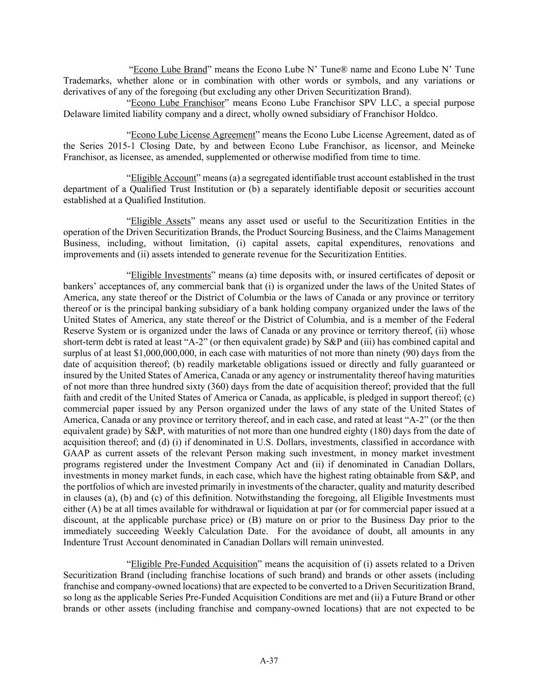 A-37 “Econo Lube Brand” means the Econo Lube N’ Tune® name and Econo Lube N’ Tune Trademarks, whether alone or in combination with other words or symbols, and any variations or derivatives of any of the foregoing (but excluding any other Driven Securitization Brand). “Econo Lube Franchisor” means Econo Lube Franchisor SPV LLC, a special purpose Delaware limited liability company and a direct, wholly owned subsidiary of Franchisor Holdco. “Econo Lube License Agreement” means the Econo Lube License Agreement, dated as of the Series 2015-1 Closing Date, by and between Econo Lube Franchisor, as licensor, and Meineke Franchisor, as licensee, as amended, supplemented or otherwise modified from time to time. “Eligible Account” means (a) a segregated identifiable trust account established in the trust department of a Qualified Trust Institution or (b) a separately identifiable deposit or securities account established at a Qualified Institution. “Eligible Assets” means any asset used or useful to the Securitization Entities in the operation of the Driven Securitization Brands, the Product Sourcing Business, and the Claims Management Business, including, without limitation, (i) capital assets, capital expenditures, renovations and improvements and (ii) assets intended to generate revenue for the Securitization Entities. “Eligible Investments” means (a) time deposits with, or insured certificates of deposit or bankers’ acceptances of, any commercial bank that (i) is organized under the laws of the United States of America, any state thereof or the District of Columbia or the laws of Canada or any province or territory thereof or is the principal banking subsidiary of a bank holding company organized under the laws of the United States of America, any state thereof or the District of Columbia, and is a member of the Federal Reserve System or is organized under the laws of Canada or any province or territory thereof, (ii) whose short-term debt is rated at least “A-2” (or then equivalent grade) by S&P and (iii) has combined capital and surplus of at least $1,000,000,000, in each case with maturities of not more than ninety (90) days from the date of acquisition thereof; (b) readily marketable obligations issued or directly and fully guaranteed or insured by the United States of America, Canada or any agency or instrumentality thereof having maturities of not more than three hundred sixty (360) days from the date of acquisition thereof; provided that the full faith and credit of the United States of America or Canada, as applicable, is pledged in support thereof; (c) commercial paper issued by any Person organized under the laws of any state of the United States of America, Canada or any province or territory thereof, and in each case, and rated at least “A-2” (or the then equivalent grade) by S&P, with maturities of not more than one hundred eighty (180) days from the date of acquisition thereof; and (d) (i) if denominated in U.S. Dollars, investments, classified in accordance with GAAP as current assets of the relevant Person making such investment, in money market investment programs registered under the Investment Company Act and (ii) if denominated in Canadian Dollars, investments in money market funds, in each case, which have the highest rating obtainable from S&P, and the portfolios of which are invested primarily in investments of the character, quality and maturity described in clauses (a), (b) and (c) of this definition. Notwithstanding the foregoing, all Eligible Investments must either (A) be at all times available for withdrawal or liquidation at par (or for commercial paper issued at a discount, at the applicable purchase price) or (B) mature on or prior to the Business Day prior to the immediately succeeding Weekly Calculation Date. For the avoidance of doubt, all amounts in any Indenture Trust Account denominated in Canadian Dollars will remain uninvested. “Eligible Pre-Funded Acquisition” means the acquisition of (i) assets related to a Driven Securitization Brand (including franchise locations of such brand) and brands or other assets (including franchise and company-owned locations) that are expected to be converted to a Driven Securitization Brand, so long as the applicable Series Pre-Funded Acquisition Conditions are met and (ii) a Future Brand or other brands or other assets (including franchise and company-owned locations) that are not expected to be