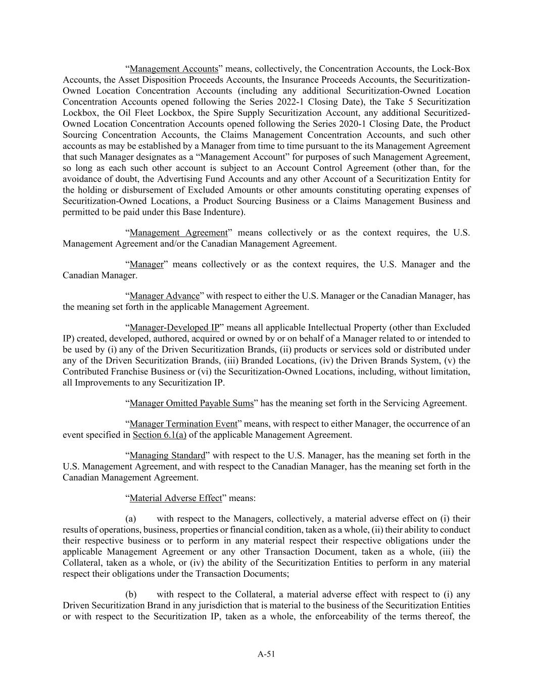 A-51 “Management Accounts” means, collectively, the Concentration Accounts, the Lock-Box Accounts, the Asset Disposition Proceeds Accounts, the Insurance Proceeds Accounts, the Securitization- Owned Location Concentration Accounts (including any additional Securitization-Owned Location Concentration Accounts opened following the Series 2022-1 Closing Date), the Take 5 Securitization Lockbox, the Oil Fleet Lockbox, the Spire Supply Securitization Account, any additional Securitized- Owned Location Concentration Accounts opened following the Series 2020-1 Closing Date, the Product Sourcing Concentration Accounts, the Claims Management Concentration Accounts, and such other accounts as may be established by a Manager from time to time pursuant to the its Management Agreement that such Manager designates as a “Management Account” for purposes of such Management Agreement, so long as each such other account is subject to an Account Control Agreement (other than, for the avoidance of doubt, the Advertising Fund Accounts and any other Account of a Securitization Entity for the holding or disbursement of Excluded Amounts or other amounts constituting operating expenses of Securitization-Owned Locations, a Product Sourcing Business or a Claims Management Business and permitted to be paid under this Base Indenture). “Management Agreement” means collectively or as the context requires, the U.S. Management Agreement and/or the Canadian Management Agreement. “Manager” means collectively or as the context requires, the U.S. Manager and the Canadian Manager. “Manager Advance” with respect to either the U.S. Manager or the Canadian Manager, has the meaning set forth in the applicable Management Agreement. “Manager-Developed IP” means all applicable Intellectual Property (other than Excluded IP) created, developed, authored, acquired or owned by or on behalf of a Manager related to or intended to be used by (i) any of the Driven Securitization Brands, (ii) products or services sold or distributed under any of the Driven Securitization Brands, (iii) Branded Locations, (iv) the Driven Brands System, (v) the Contributed Franchise Business or (vi) the Securitization-Owned Locations, including, without limitation, all Improvements to any Securitization IP. “Manager Omitted Payable Sums” has the meaning set forth in the Servicing Agreement. “Manager Termination Event” means, with respect to either Manager, the occurrence of an event specified in Section 6.1(a) of the applicable Management Agreement. “Managing Standard” with respect to the U.S. Manager, has the meaning set forth in the U.S. Management Agreement, and with respect to the Canadian Manager, has the meaning set forth in the Canadian Management Agreement. “Material Adverse Effect” means: (a) with respect to the Managers, collectively, a material adverse effect on (i) their results of operations, business, properties or financial condition, taken as a whole, (ii) their ability to conduct their respective business or to perform in any material respect their respective obligations under the applicable Management Agreement or any other Transaction Document, taken as a whole, (iii) the Collateral, taken as a whole, or (iv) the ability of the Securitization Entities to perform in any material respect their obligations under the Transaction Documents; (b) with respect to the Collateral, a material adverse effect with respect to (i) any Driven Securitization Brand in any jurisdiction that is material to the business of the Securitization Entities or with respect to the Securitization IP, taken as a whole, the enforceability of the terms thereof, the