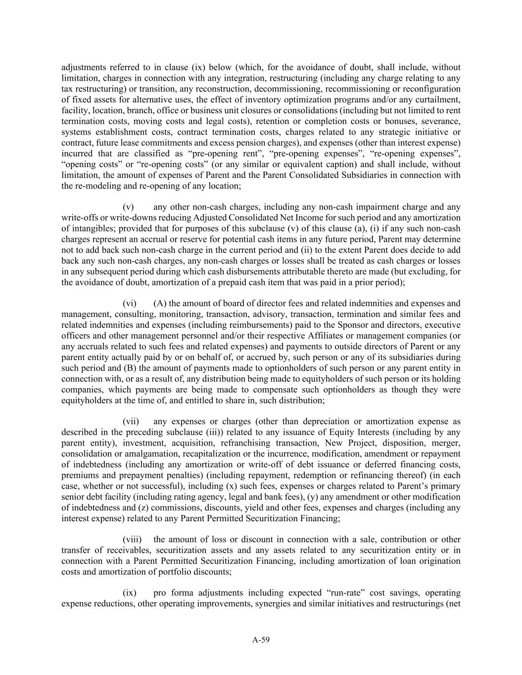 A-59 adjustments referred to in clause (ix) below (which, for the avoidance of doubt, shall include, without limitation, charges in connection with any integration, restructuring (including any charge relating to any tax restructuring) or transition, any reconstruction, decommissioning, recommissioning or reconfiguration of fixed assets for alternative uses, the effect of inventory optimization programs and/or any curtailment, facility, location, branch, office or business unit closures or consolidations (including but not limited to rent termination costs, moving costs and legal costs), retention or completion costs or bonuses, severance, systems establishment costs, contract termination costs, charges related to any strategic initiative or contract, future lease commitments and excess pension charges), and expenses (other than interest expense) incurred that are classified as “pre-opening rent”, “pre-opening expenses”, “re-opening expenses”, “opening costs” or “re-opening costs” (or any similar or equivalent caption) and shall include, without limitation, the amount of expenses of Parent and the Parent Consolidated Subsidiaries in connection with the re-modeling and re-opening of any location; (v) any other non-cash charges, including any non-cash impairment charge and any write-offs or write-downs reducing Adjusted Consolidated Net Income for such period and any amortization of intangibles; provided that for purposes of this subclause (v) of this clause (a), (i) if any such non-cash charges represent an accrual or reserve for potential cash items in any future period, Parent may determine not to add back such non-cash charge in the current period and (ii) to the extent Parent does decide to add back any such non-cash charges, any non-cash charges or losses shall be treated as cash charges or losses in any subsequent period during which cash disbursements attributable thereto are made (but excluding, for the avoidance of doubt, amortization of a prepaid cash item that was paid in a prior period); (vi) (A) the amount of board of director fees and related indemnities and expenses and management, consulting, monitoring, transaction, advisory, transaction, termination and similar fees and related indemnities and expenses (including reimbursements) paid to the Sponsor and directors, executive officers and other management personnel and/or their respective Affiliates or management companies (or any accruals related to such fees and related expenses) and payments to outside directors of Parent or any parent entity actually paid by or on behalf of, or accrued by, such person or any of its subsidiaries during such period and (B) the amount of payments made to optionholders of such person or any parent entity in connection with, or as a result of, any distribution being made to equityholders of such person or its holding companies, which payments are being made to compensate such optionholders as though they were equityholders at the time of, and entitled to share in, such distribution; (vii) any expenses or charges (other than depreciation or amortization expense as described in the preceding subclause (iii)) related to any issuance of Equity Interests (including by any parent entity), investment, acquisition, refranchising transaction, New Project, disposition, merger, consolidation or amalgamation, recapitalization or the incurrence, modification, amendment or repayment of indebtedness (including any amortization or write-off of debt issuance or deferred financing costs, premiums and prepayment penalties) (including repayment, redemption or refinancing thereof) (in each case, whether or not successful), including (x) such fees, expenses or charges related to Parent’s primary senior debt facility (including rating agency, legal and bank fees), (y) any amendment or other modification of indebtedness and (z) commissions, discounts, yield and other fees, expenses and charges (including any interest expense) related to any Parent Permitted Securitization Financing; (viii) the amount of loss or discount in connection with a sale, contribution or other transfer of receivables, securitization assets and any assets related to any securitization entity or in connection with a Parent Permitted Securitization Financing, including amortization of loan origination costs and amortization of portfolio discounts; (ix) pro forma adjustments including expected “run-rate” cost savings, operating expense reductions, other operating improvements, synergies and similar initiatives and restructurings (net